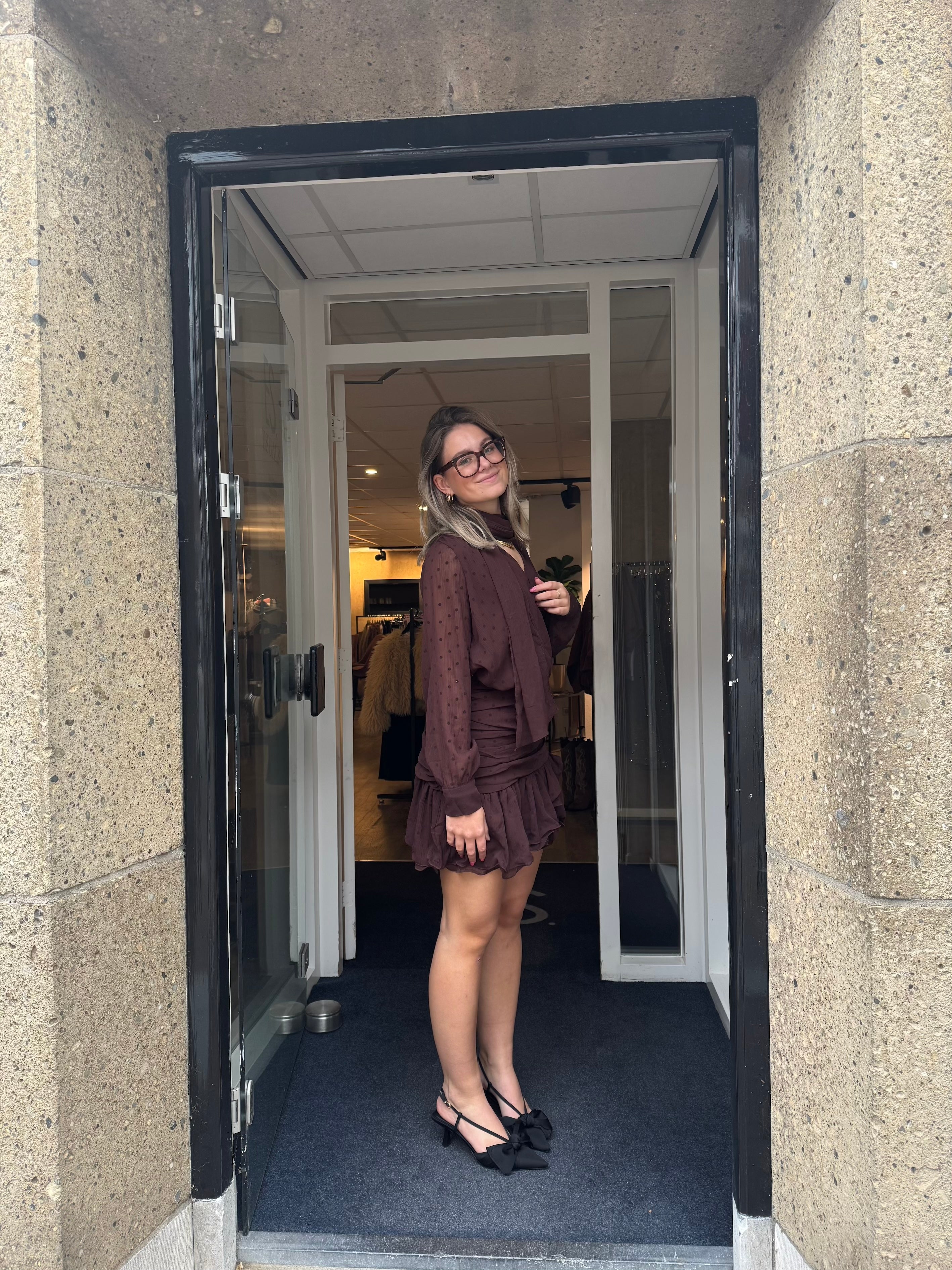 The Jade dress features a beautiful mesh fabric with long sleeves. It features polka dots all over the fabric and a scarf detail stitched into place. It closes with a side zipper and a snap button at the chest.