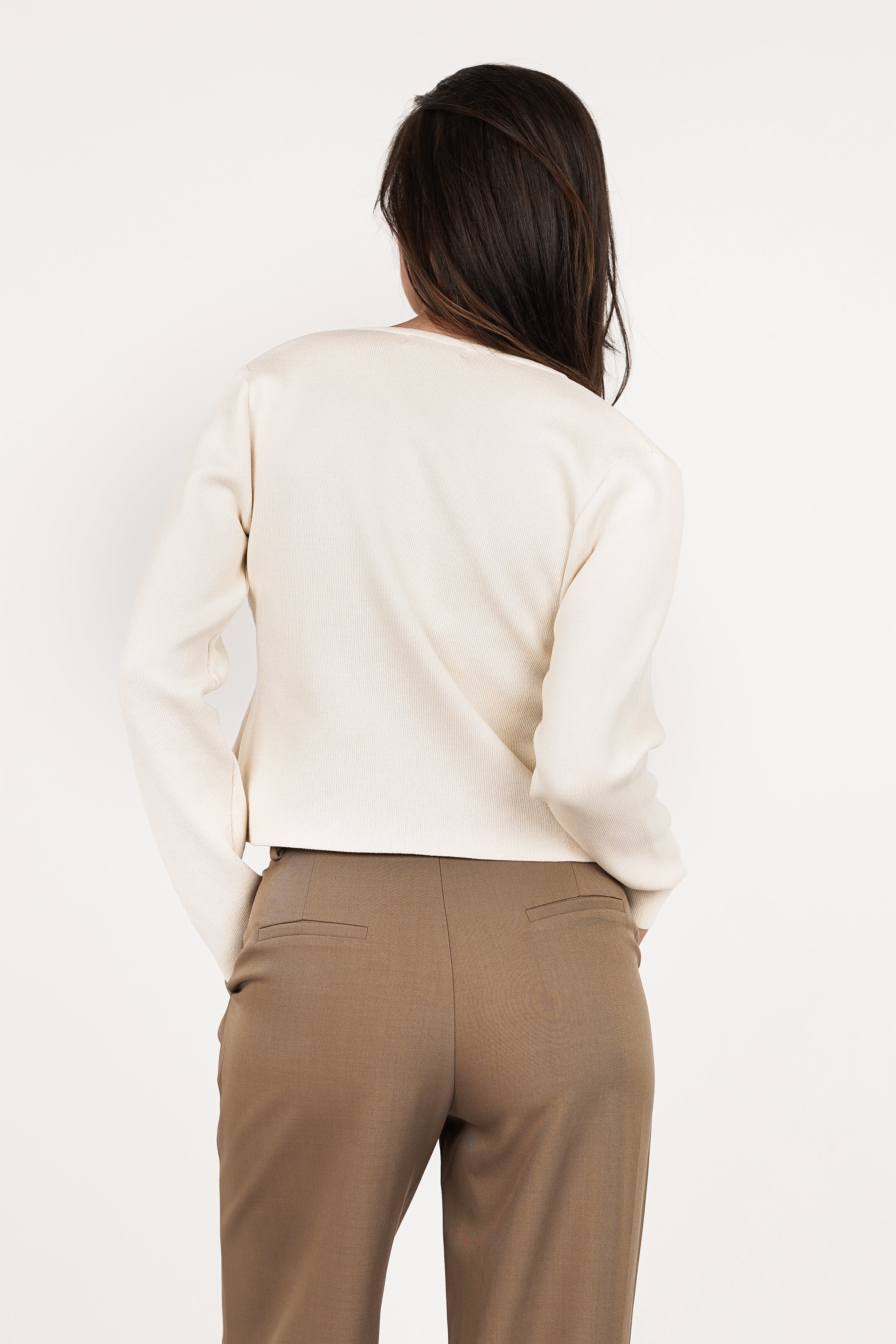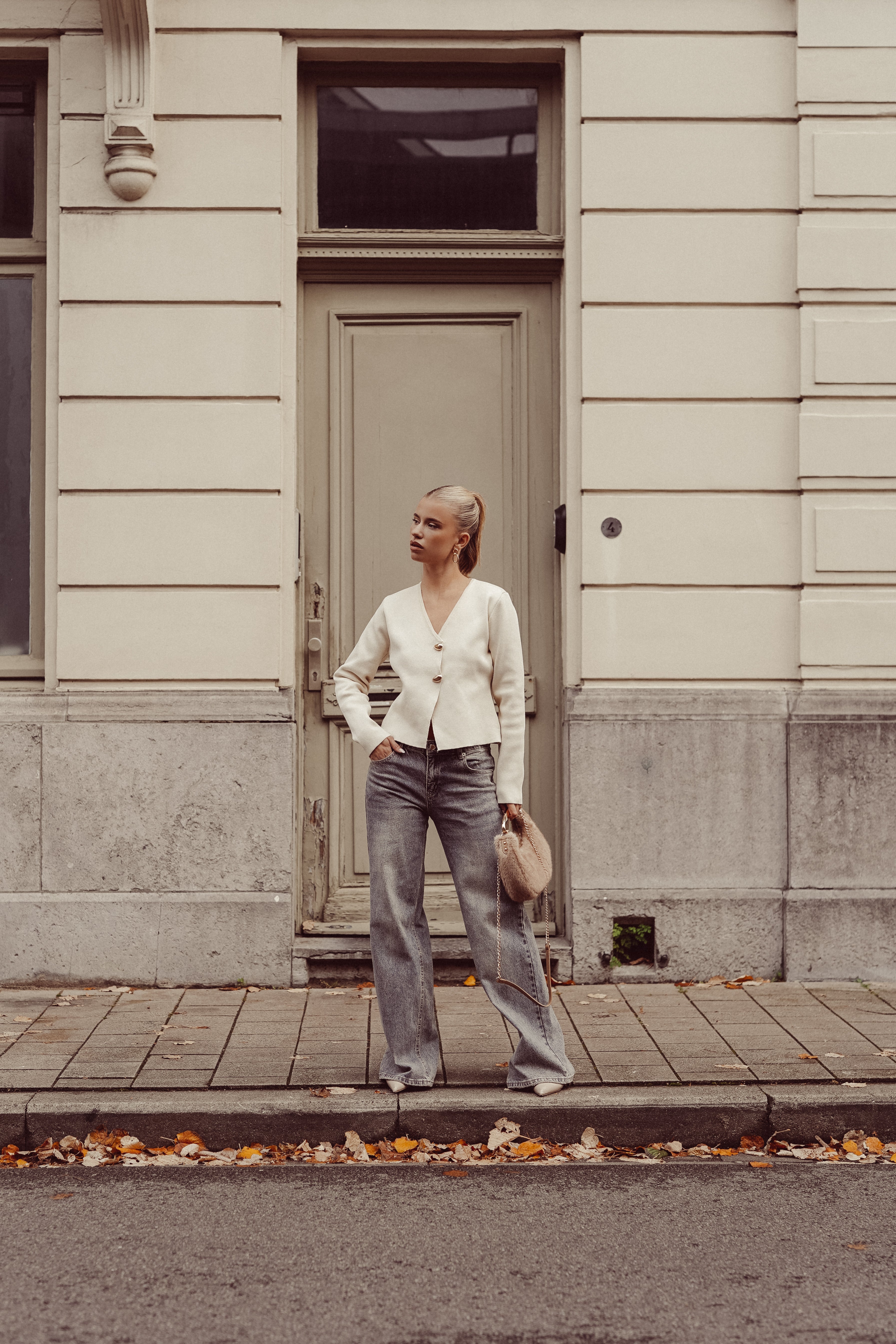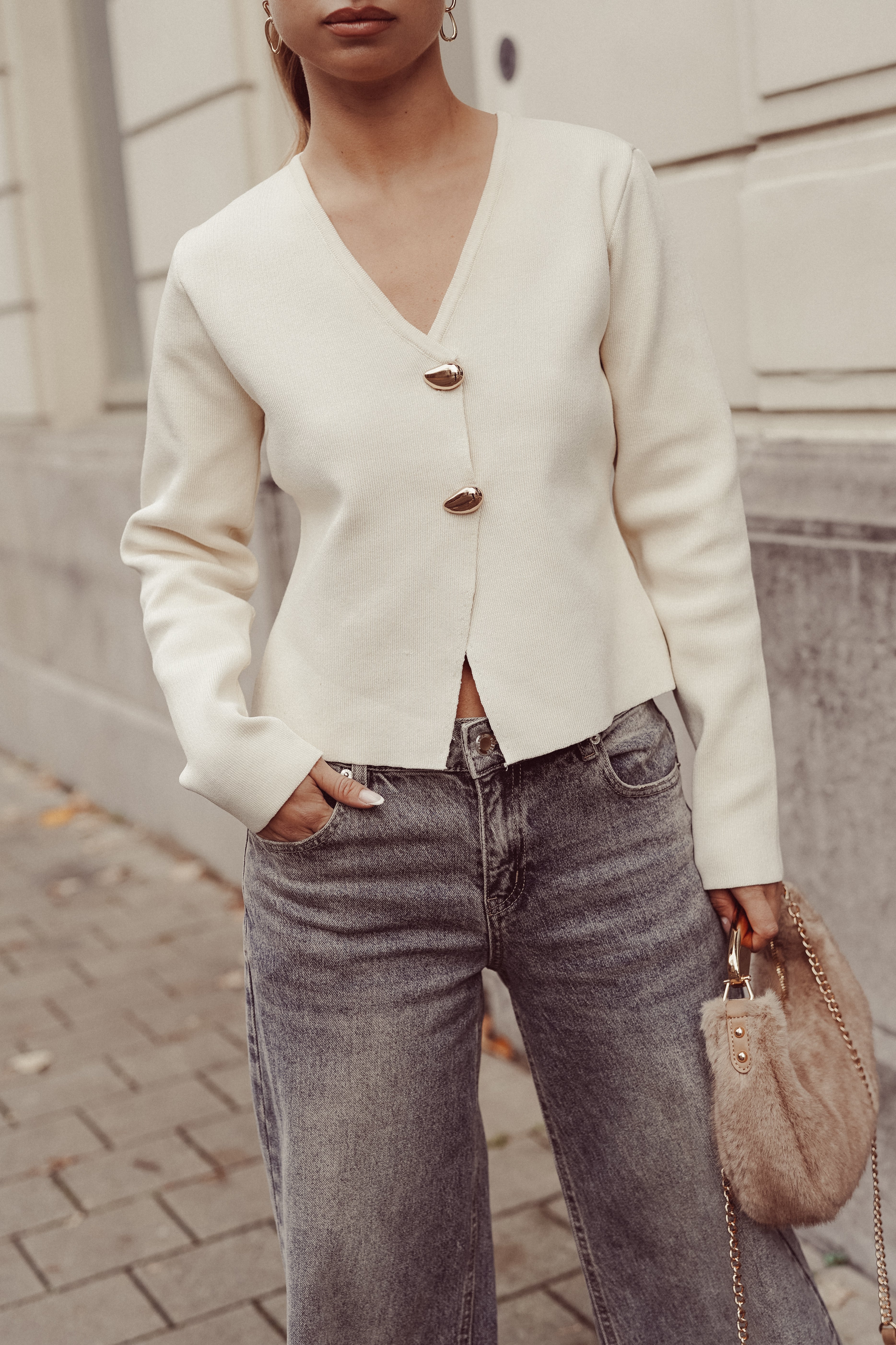 The Nancy cardigan is made of sturdy knitted fabric with two gold buttons. The top has a boxy fit and is perfect for pairing with both a skirt and jeans!