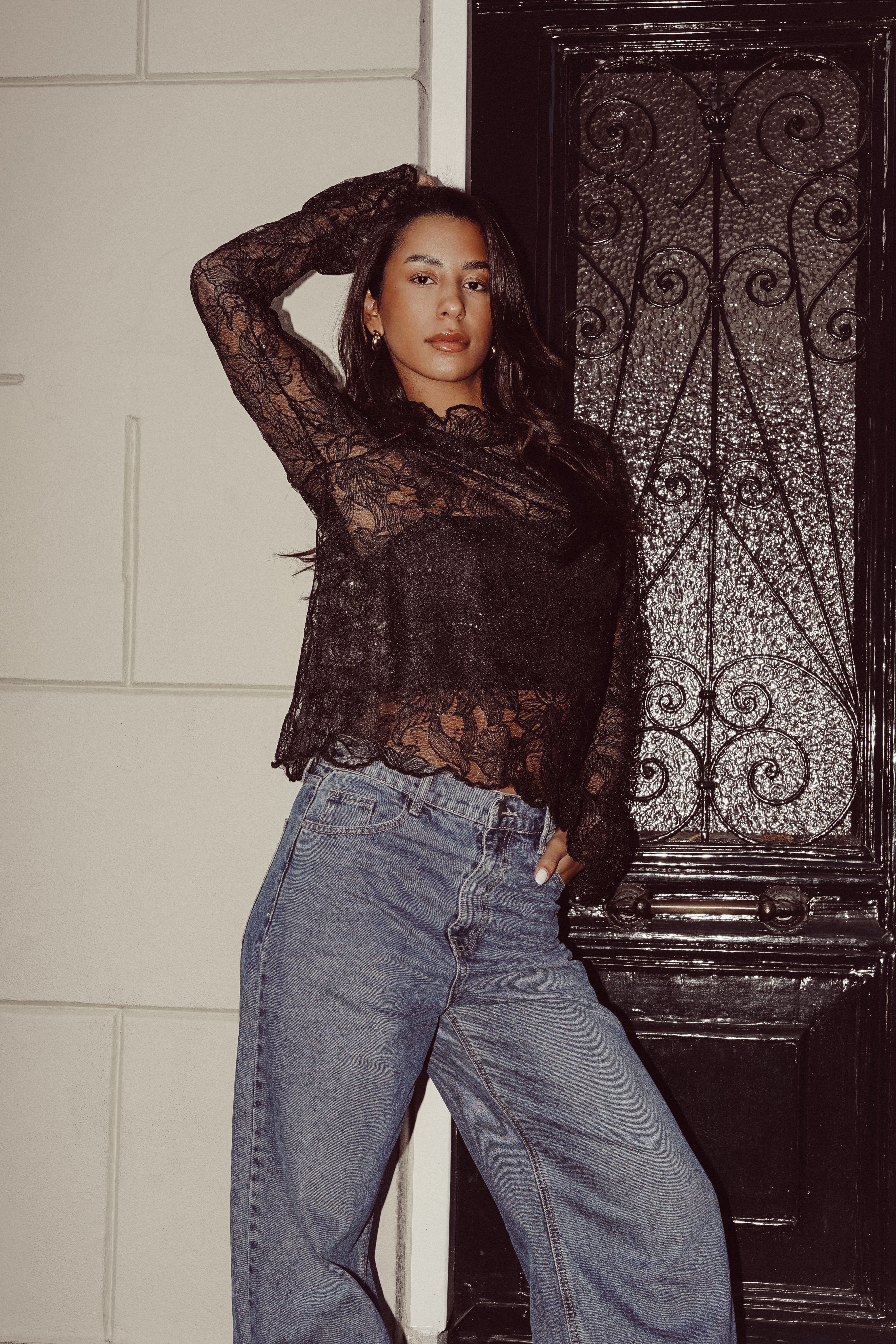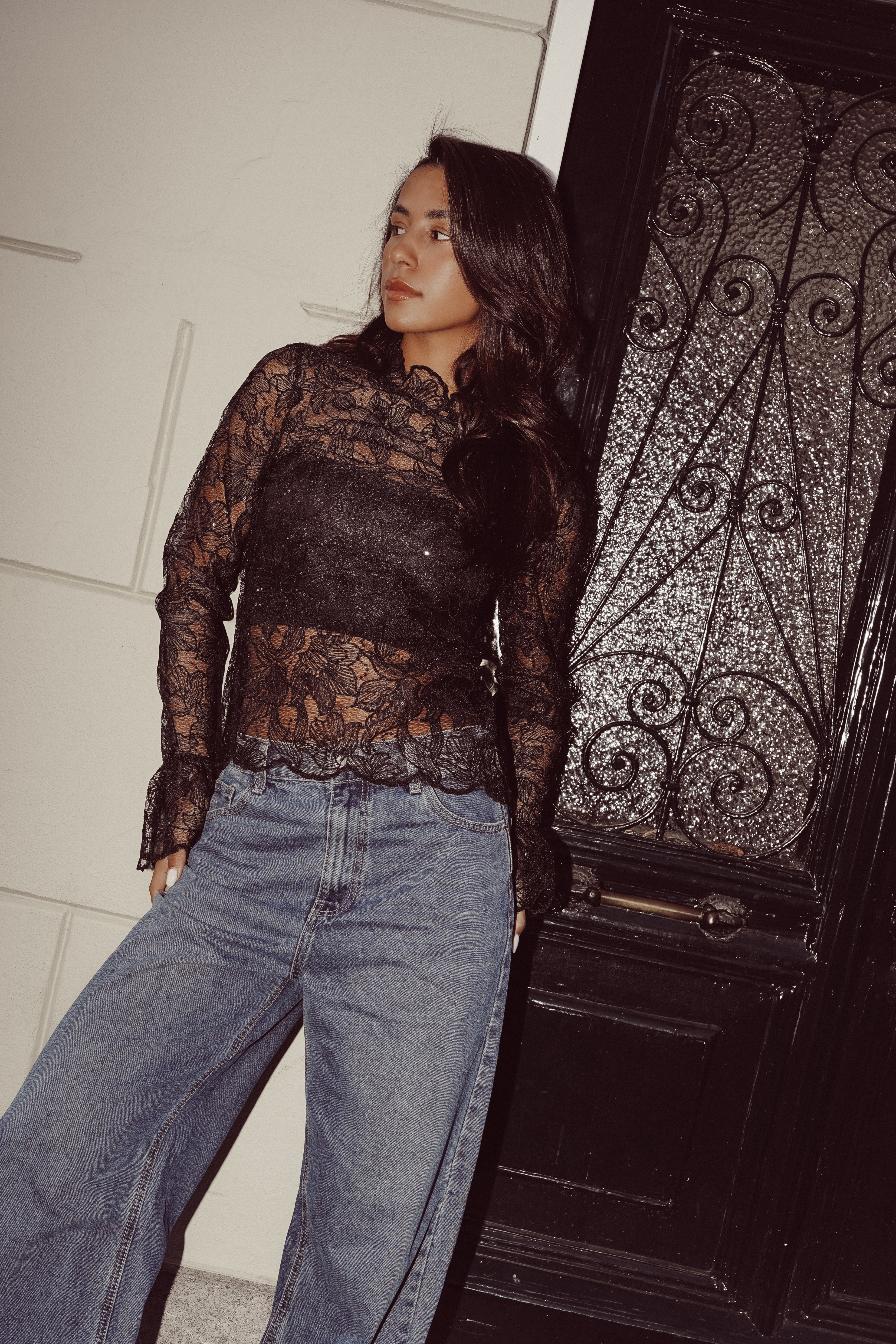 The Dunya blouse features a beautiful see-through fabric with a floral print and small sequins. It closes at the back with two buttons and has an open back.