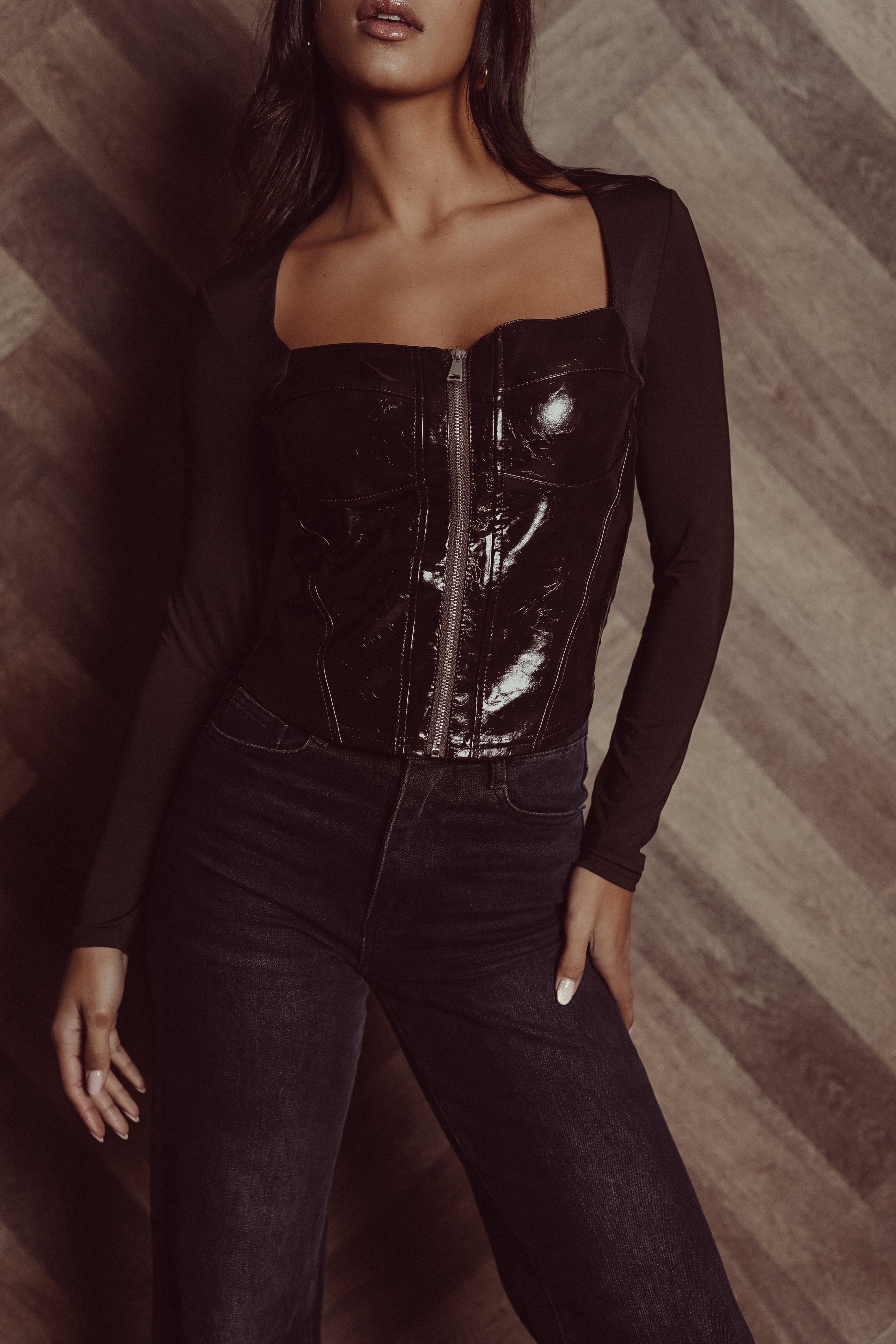 Maak een statement met deze korset top in luxe lakstof. De glanzende finish geeft je look direct een edgy, glam vibe, terwijl het korsetmodel je silhouet prachtig accentueert. De lange mouwen zorgen voor een elegante touch en maken dit item perfect voor een avondje uit of een opvallende streetstyle look.