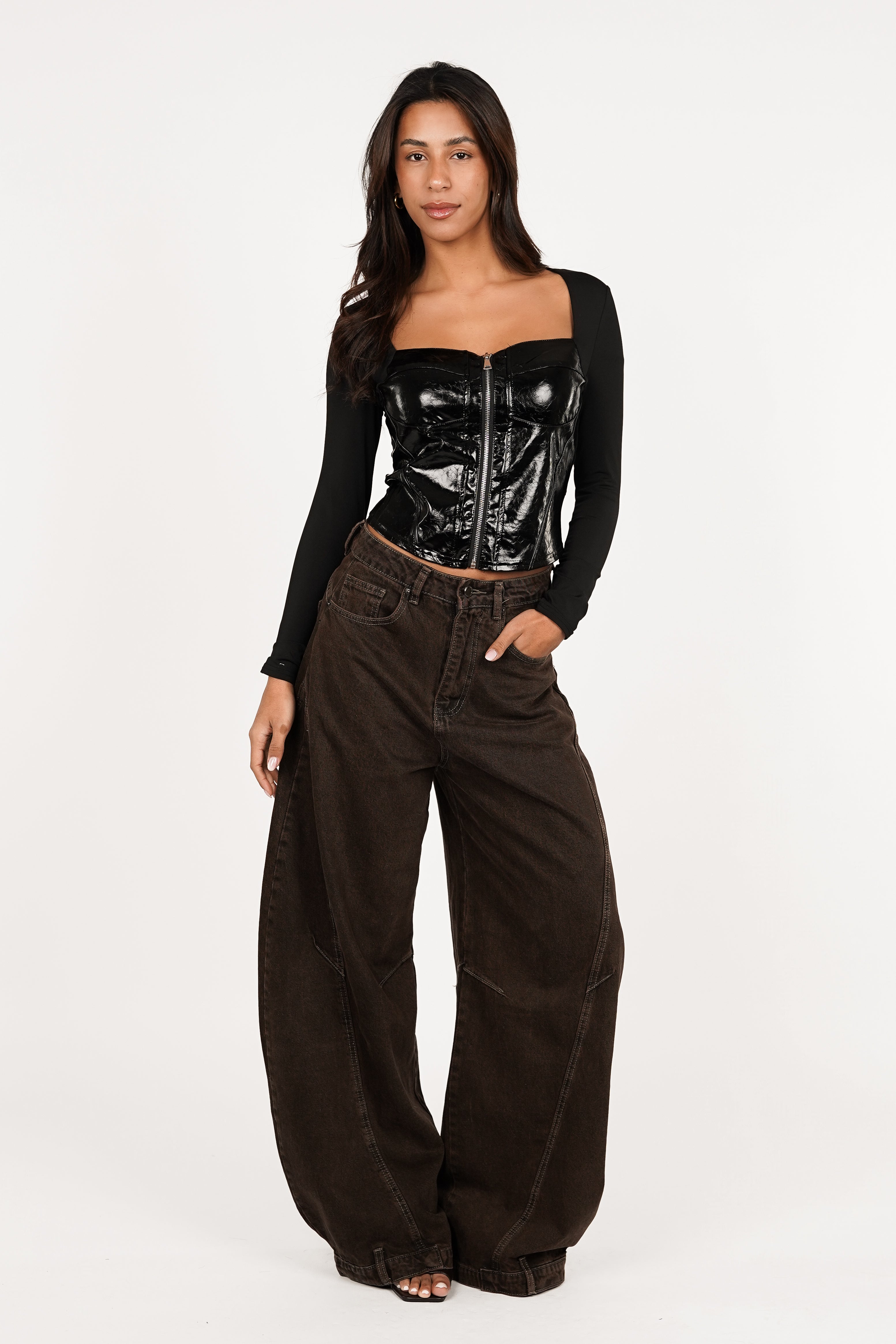 Maak een statement met deze korset top in luxe lakstof. De glanzende finish geeft je look direct een edgy, glam vibe, terwijl het korsetmodel je silhouet prachtig accentueert. De lange mouwen zorgen voor een elegante touch en maken dit item perfect voor een avondje uit of een opvallende streetstyle look.
