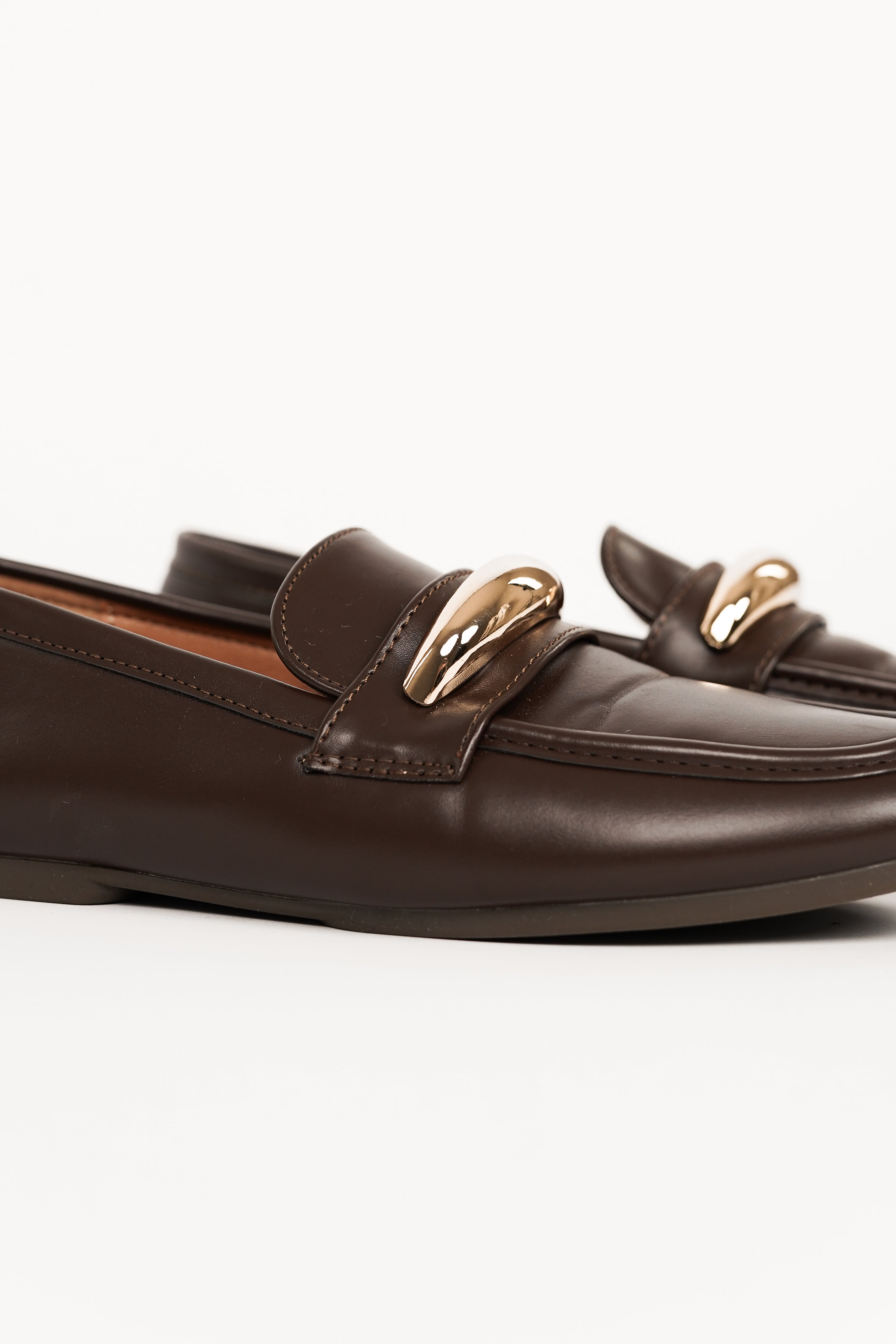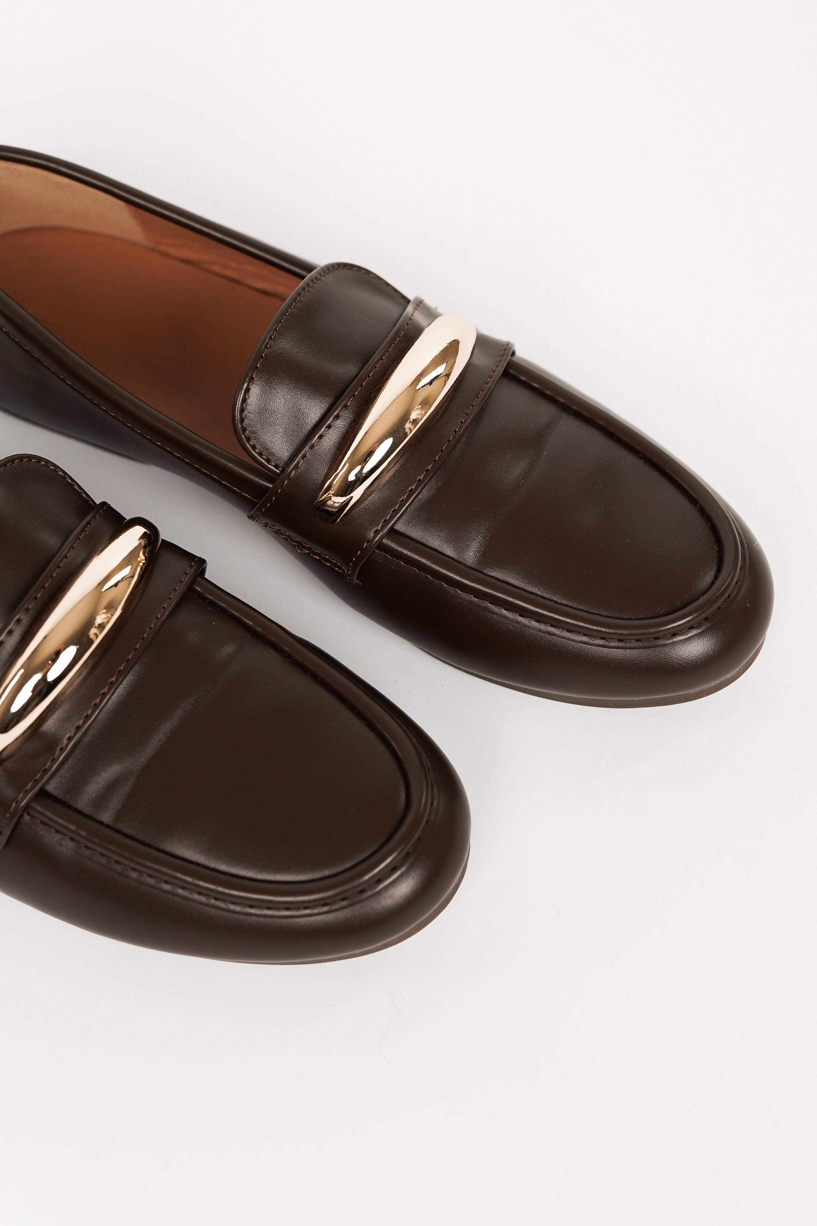Deze bruine loafers geven elke look een instant luxe vibe. De shiny gouden buckle voegt een stijlvolle, trendy touch toe, terwijl de zachte binnenzool zorgt voor optimaal comfort. Een ideale keuze voor vrouwen die houden van effortless elegance.