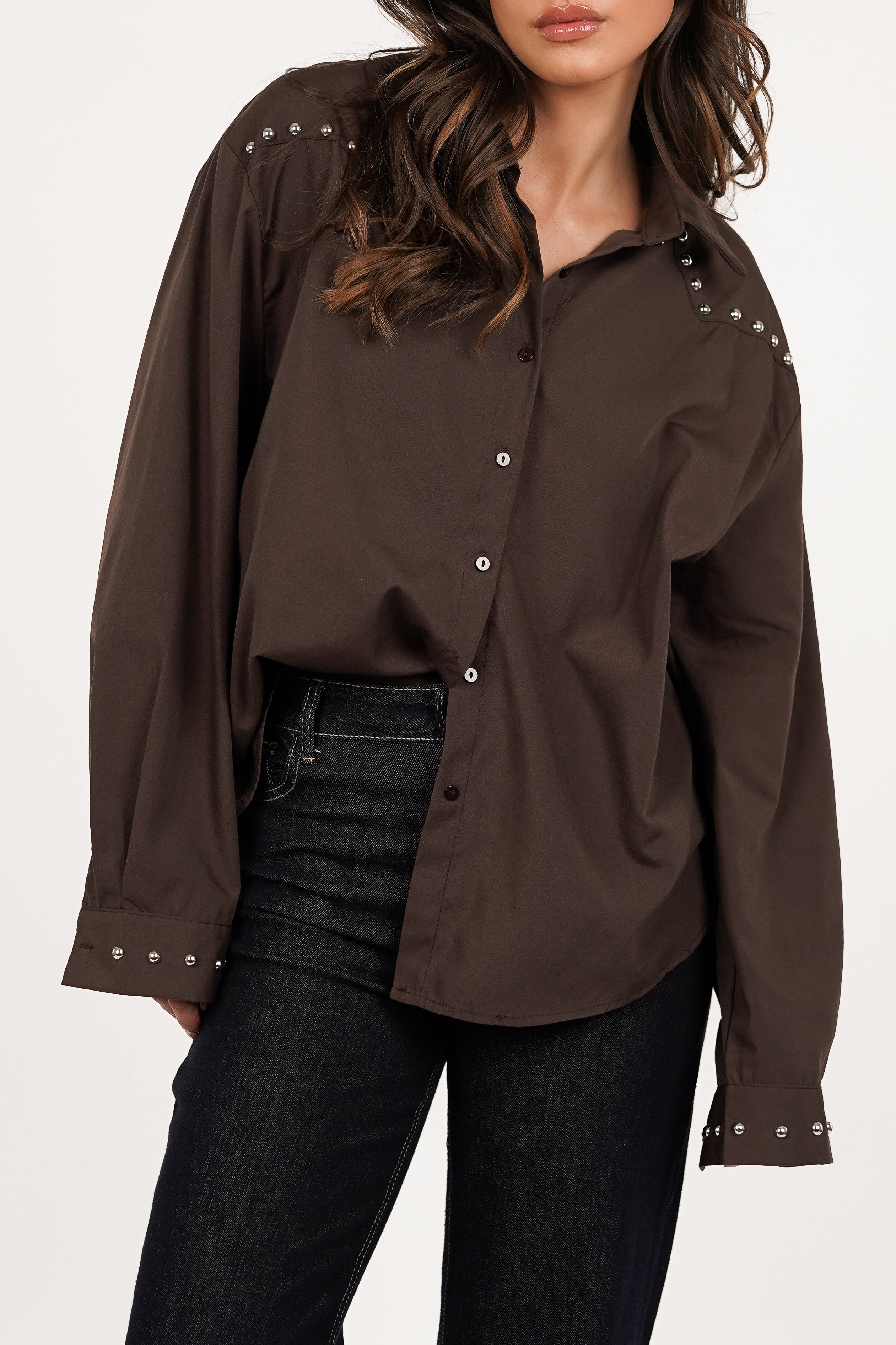 Maak indruk met onze Nella blouse met zilveren studs. Het oversized design geeft een moderne, Esuals-vibe, terwijl de studs subtiel een statement maken. Deze oversized blouse dames is veelzijdig genoeg om op een jeans te dragen of op een leatherlook skort voor een party look.