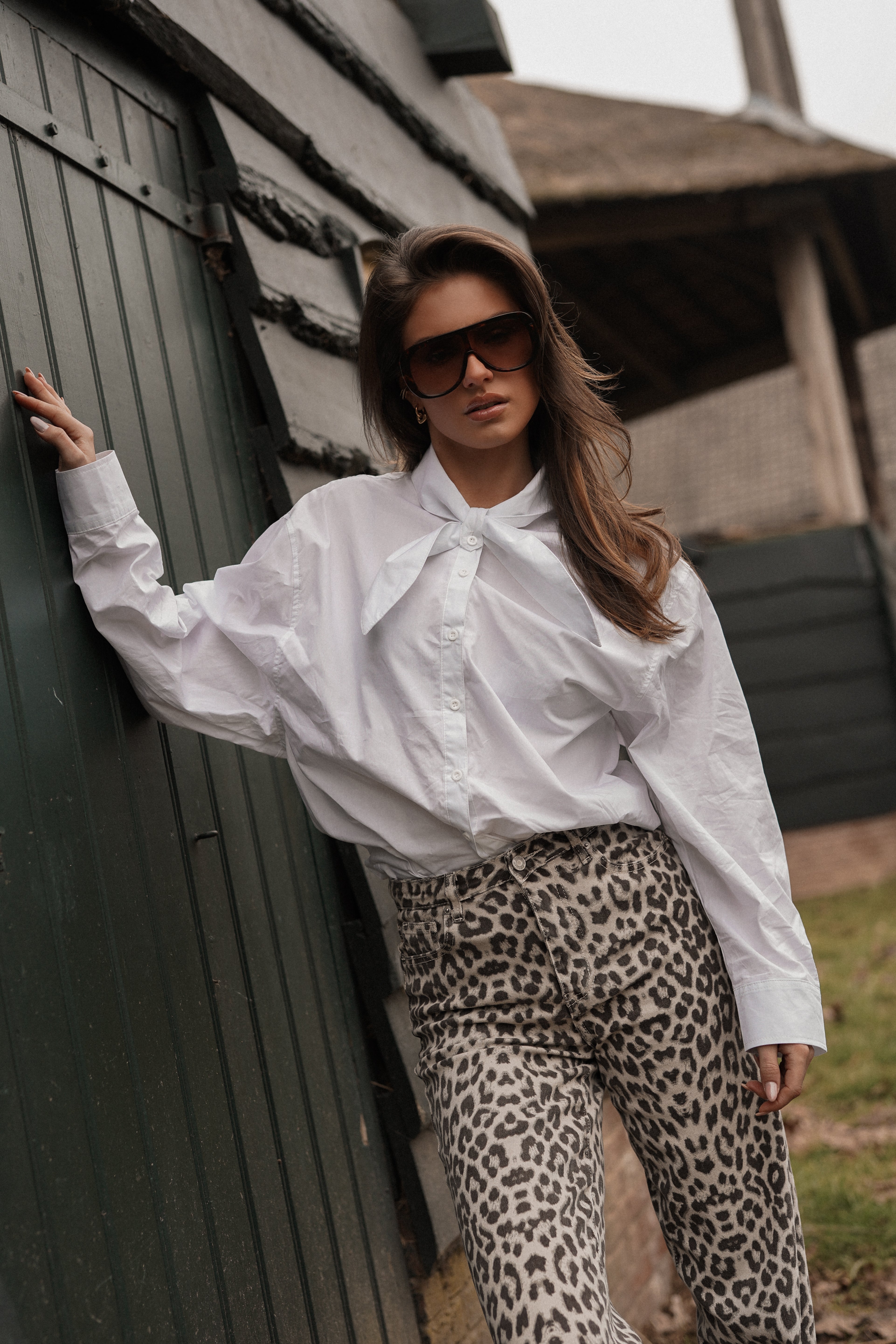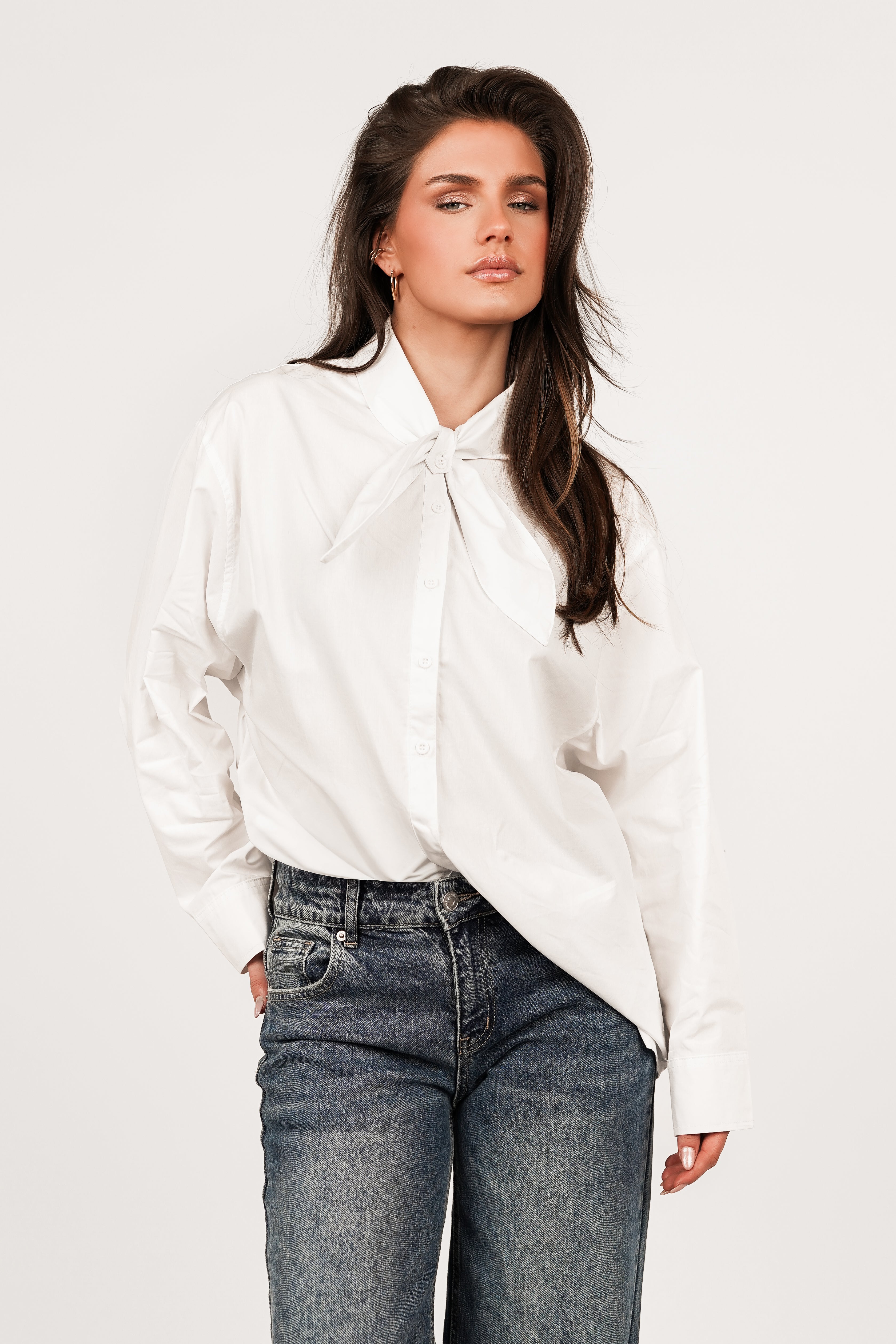 Deze witte oversized blouse voor dames is de perfecte combinatie van elegant en trendy. De blouse heeft een losvallende pasvorm en een stijlvol strikdetail bij de hals, wat zorgt voor een chique uitstraling. Dankzij het tijdloze design is deze blouse met strik een echte essential die je eindeloos kunt combineren.