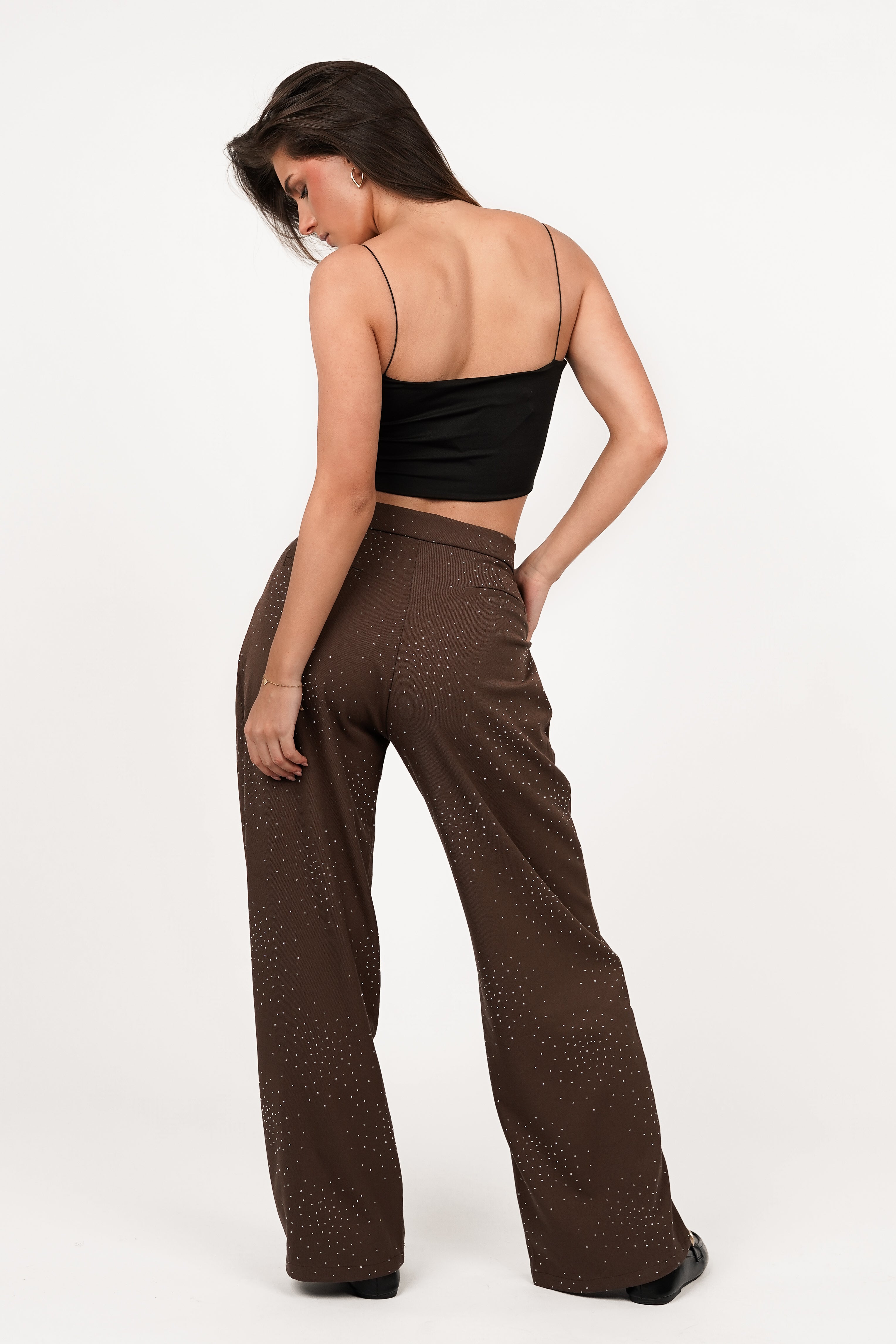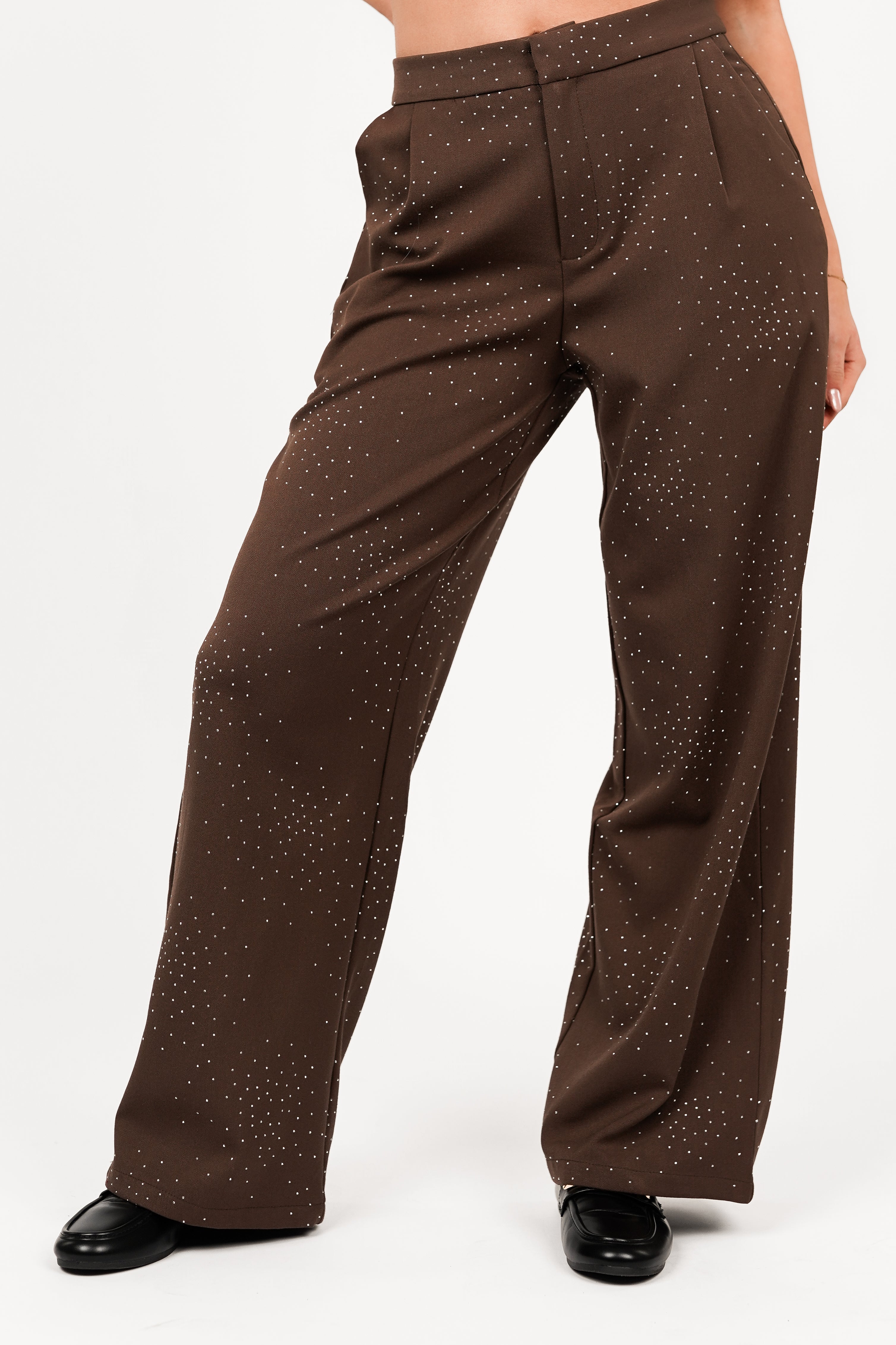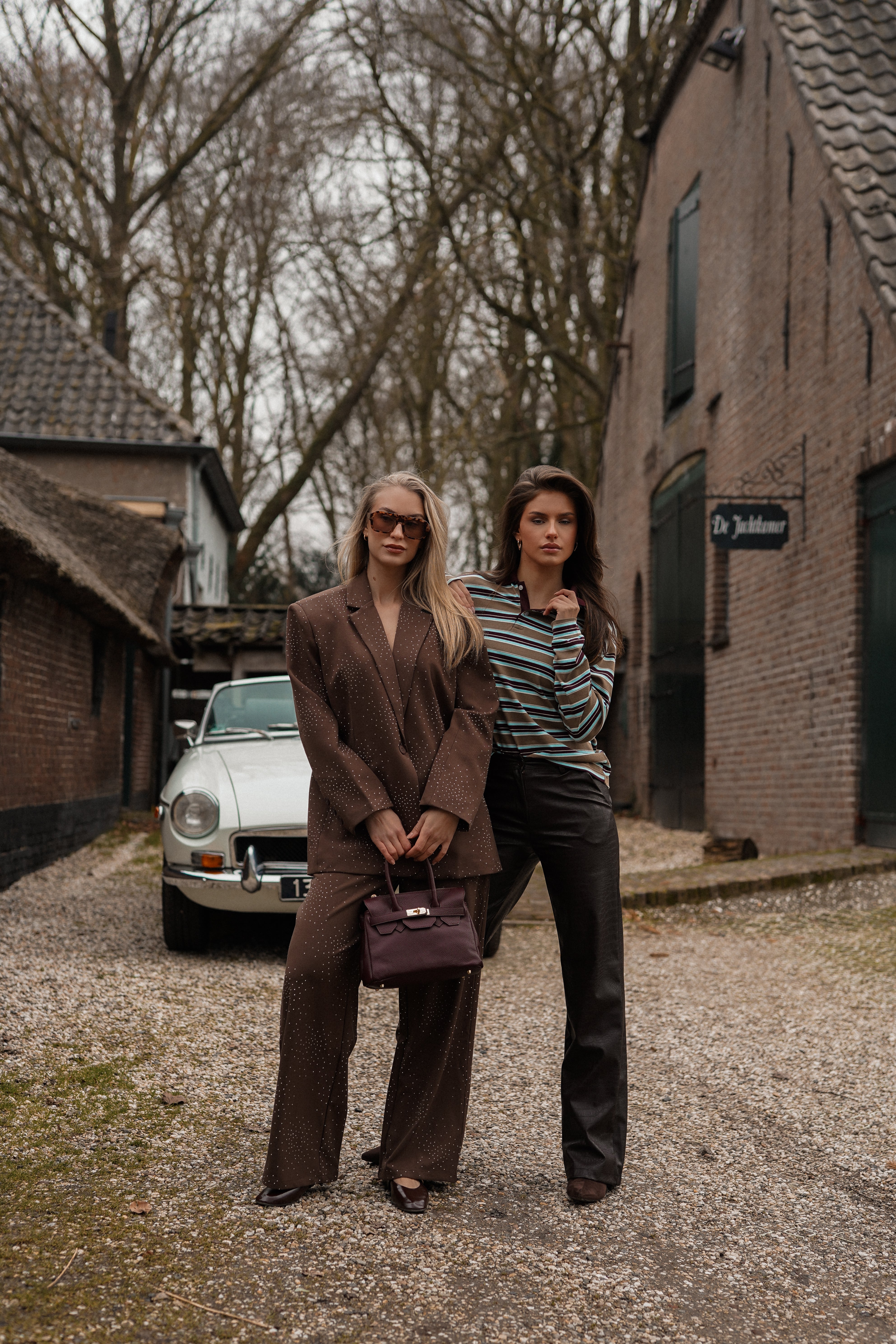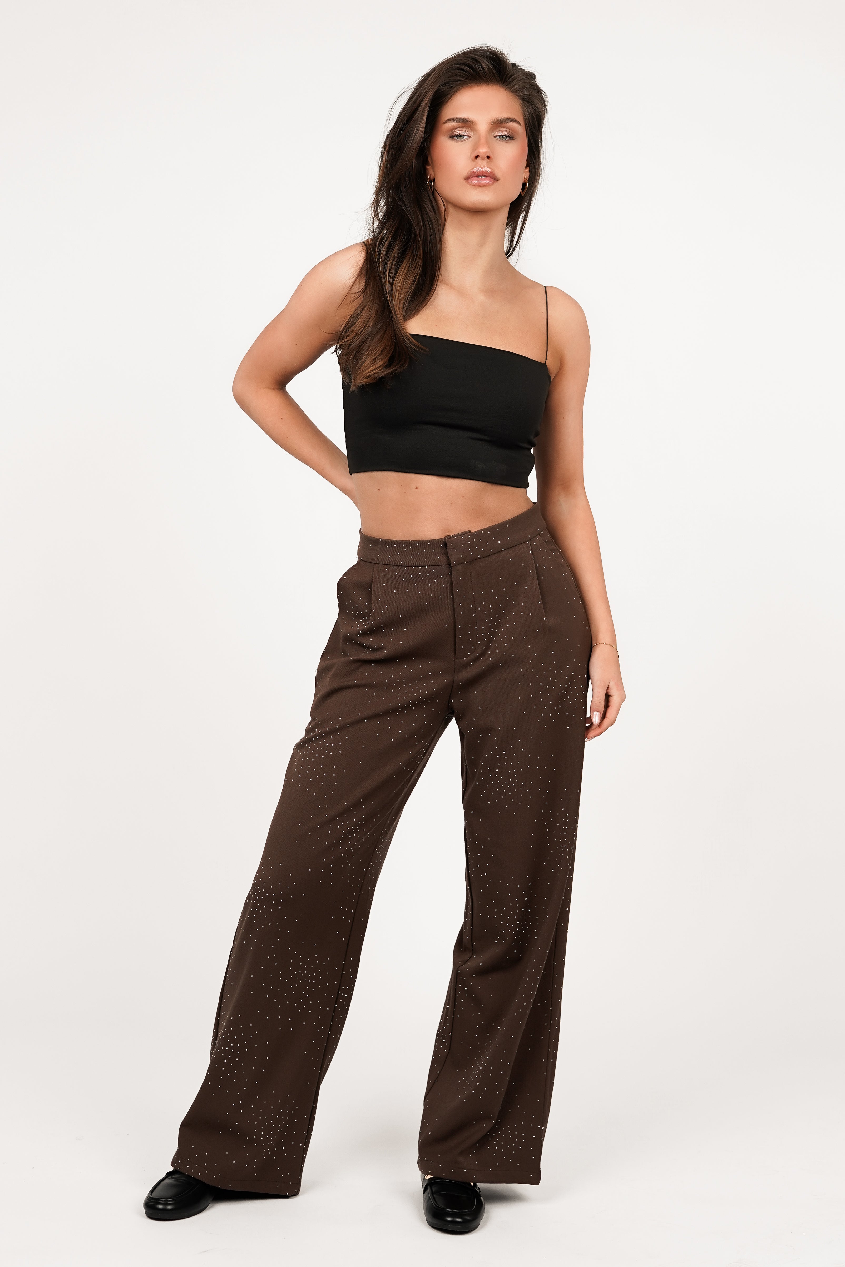 Wil jij een outfit die meteen alle aandacht trekt? De Jitty pantalon met diamanten is de perfecte combinatie van elegantie en glamour. De pantalon bevat steekzakken aan de voorzijde en sierzakken aan de achterzijde. De subtiele glans van de strass steentjes geeft de broek een luxe uitstraling samen met het wide leg model. De broek is te sluiten door middel van een oog- en haaksluiting en super leuk te combineren met onze bijpassende Audrey blazer als suit!