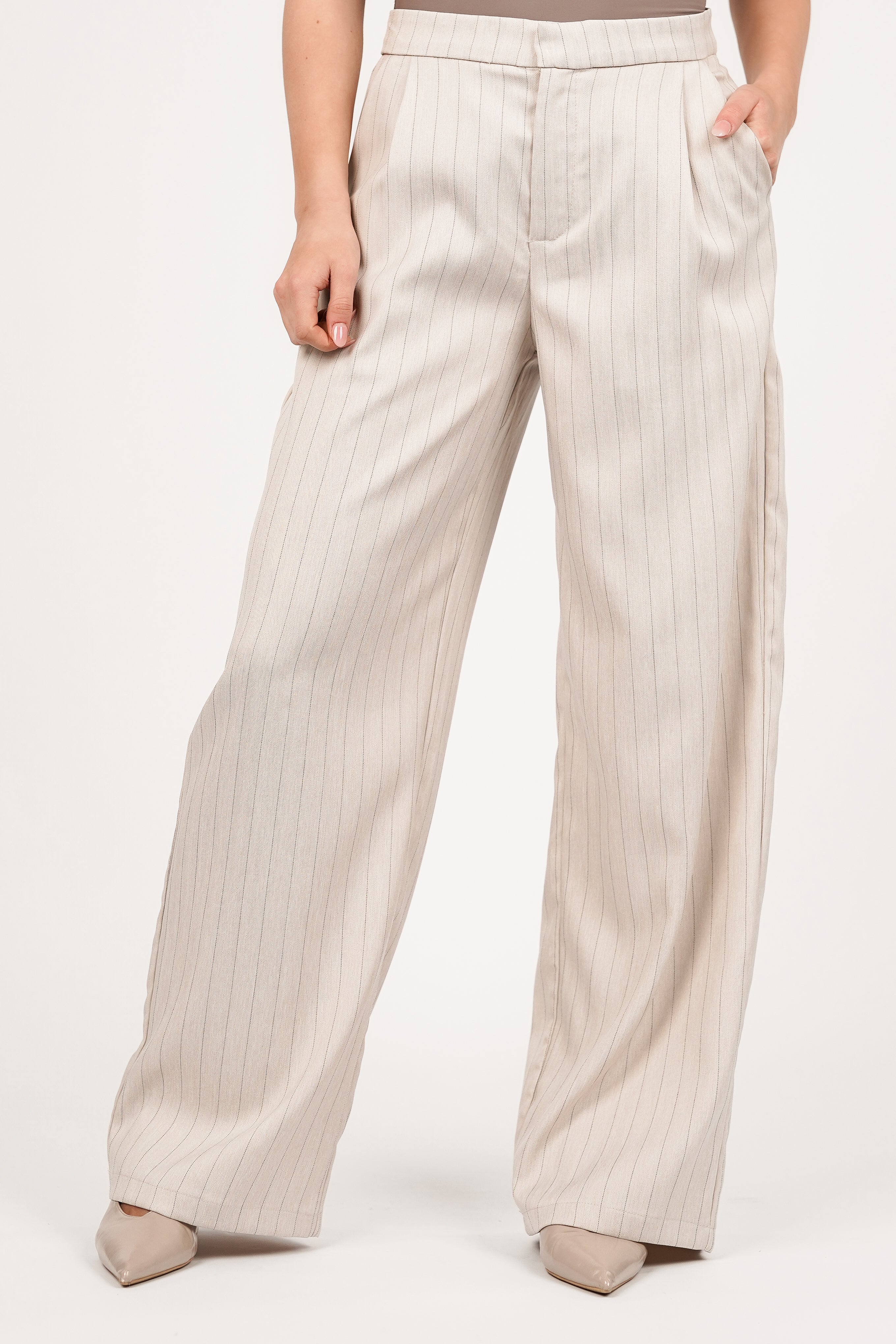 De Mirelle beige pantalon met krijtstreep is een tijdloze must have. De subtiele krijtstreep print geeft de broek een klassieke elegante look. De high waist pantalon dames sluit mooi aan in de taille en wordt gesloten door middel van een oog- en haaksluiting. De pantalon heeft steekzakken aan de voorzijde en sierzakken aan de achterzijde. De beige pantalon met fijne pinstripe is een all time favorite voor bijvoorbeeld zakelijk maar is ook super mooi te stylen voor een etentje. Maak de look compleet met de bijpassende Indigo blazer.