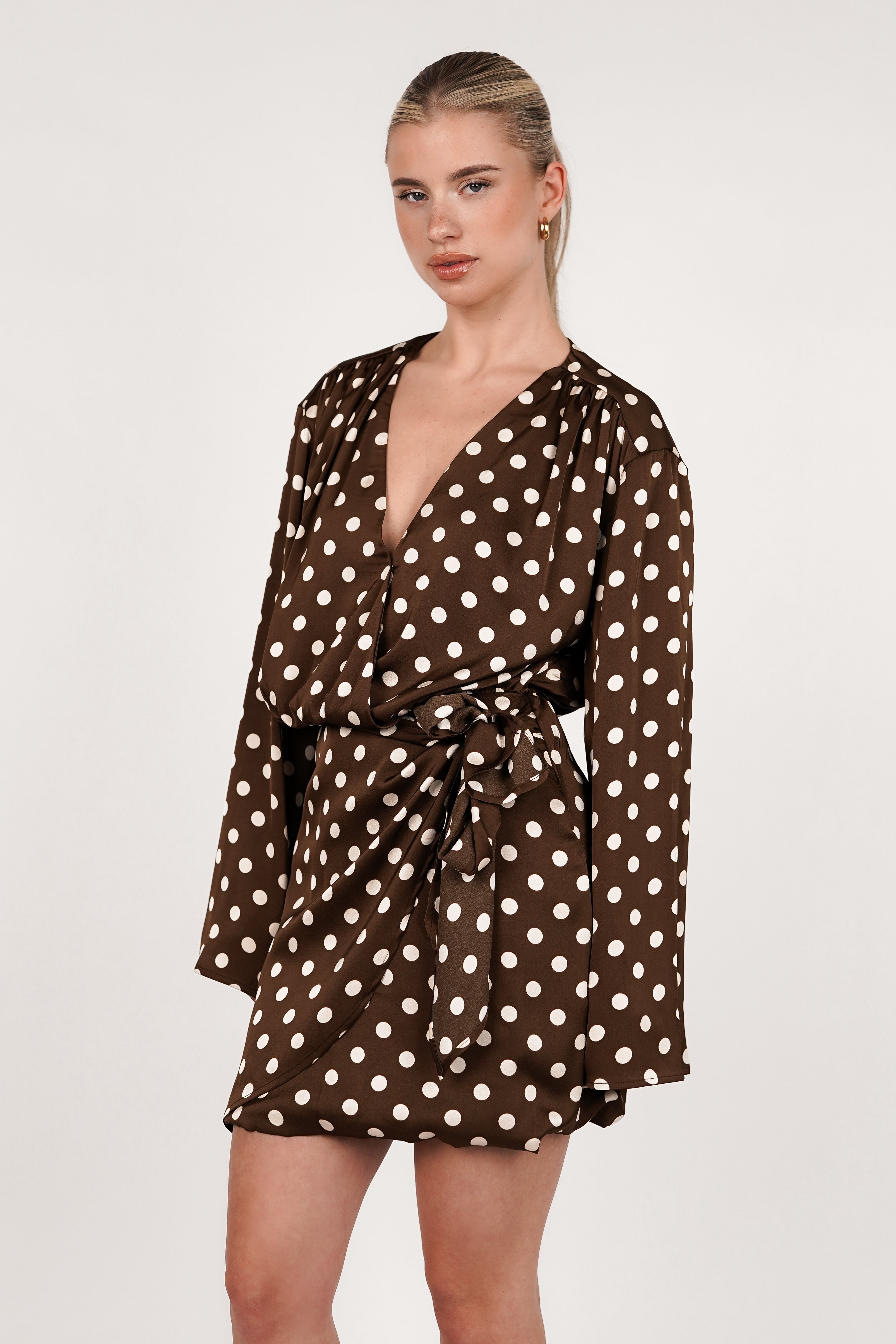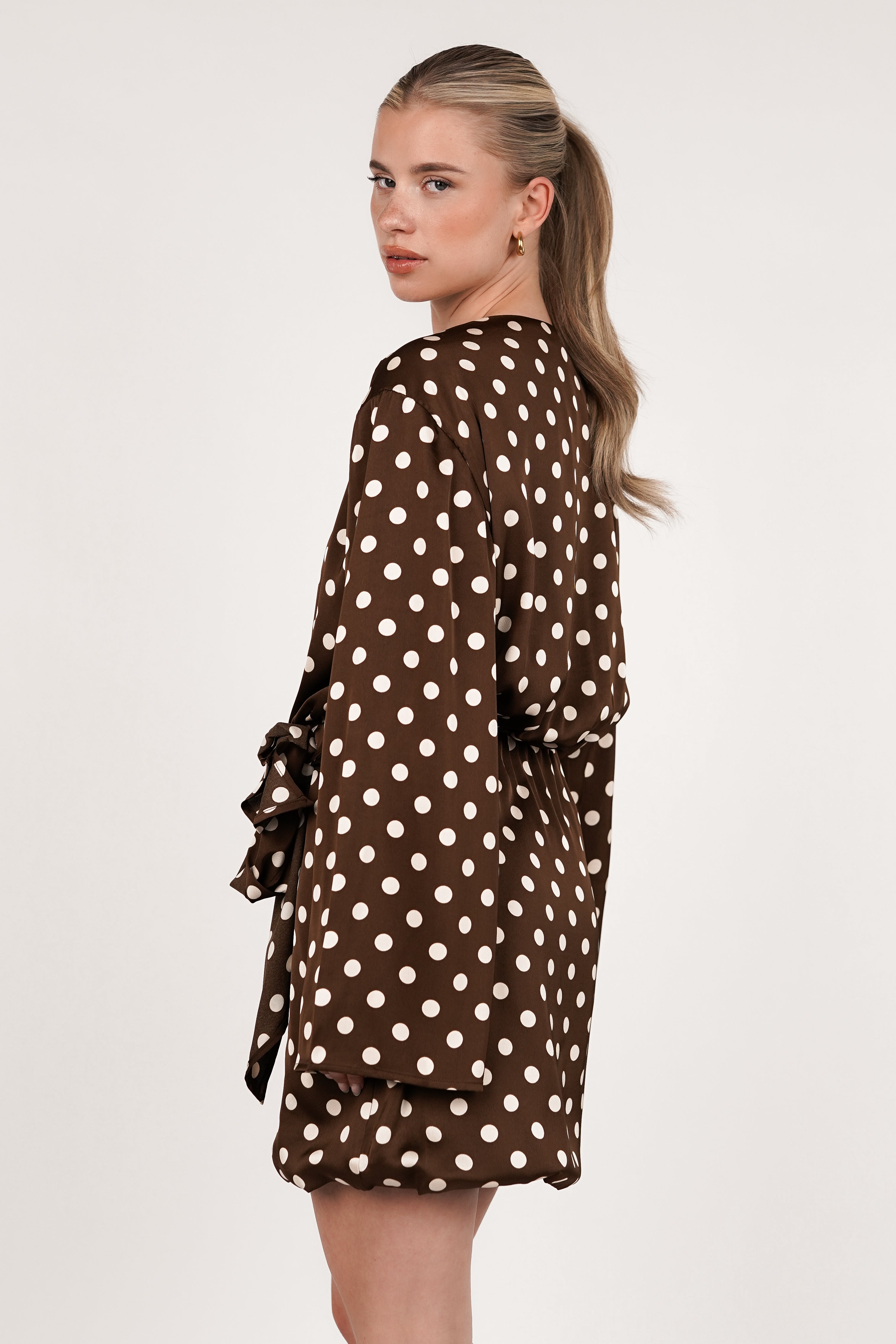 De Ella dots dress is jullie nieuwe favoriet! Straal elegantie uit met deze satijnen overslag jurk met stippen in bruin. De zachte, glanzende satijnen stof geeft deze bruine jurk dames een luxe uitstraling en de stippen zorgen juist weer voor een speelse touch! De overslag die je kunt strikken, creëert een flatterend silhouet en accentueert de taille. De satijnen wikkeljurk wordt bij de borst gesloten door middel van een drukknoop en bij de heup met een onzichtbare rits, perfect voor een dagje uit of voor feestelijke gelegenheid.