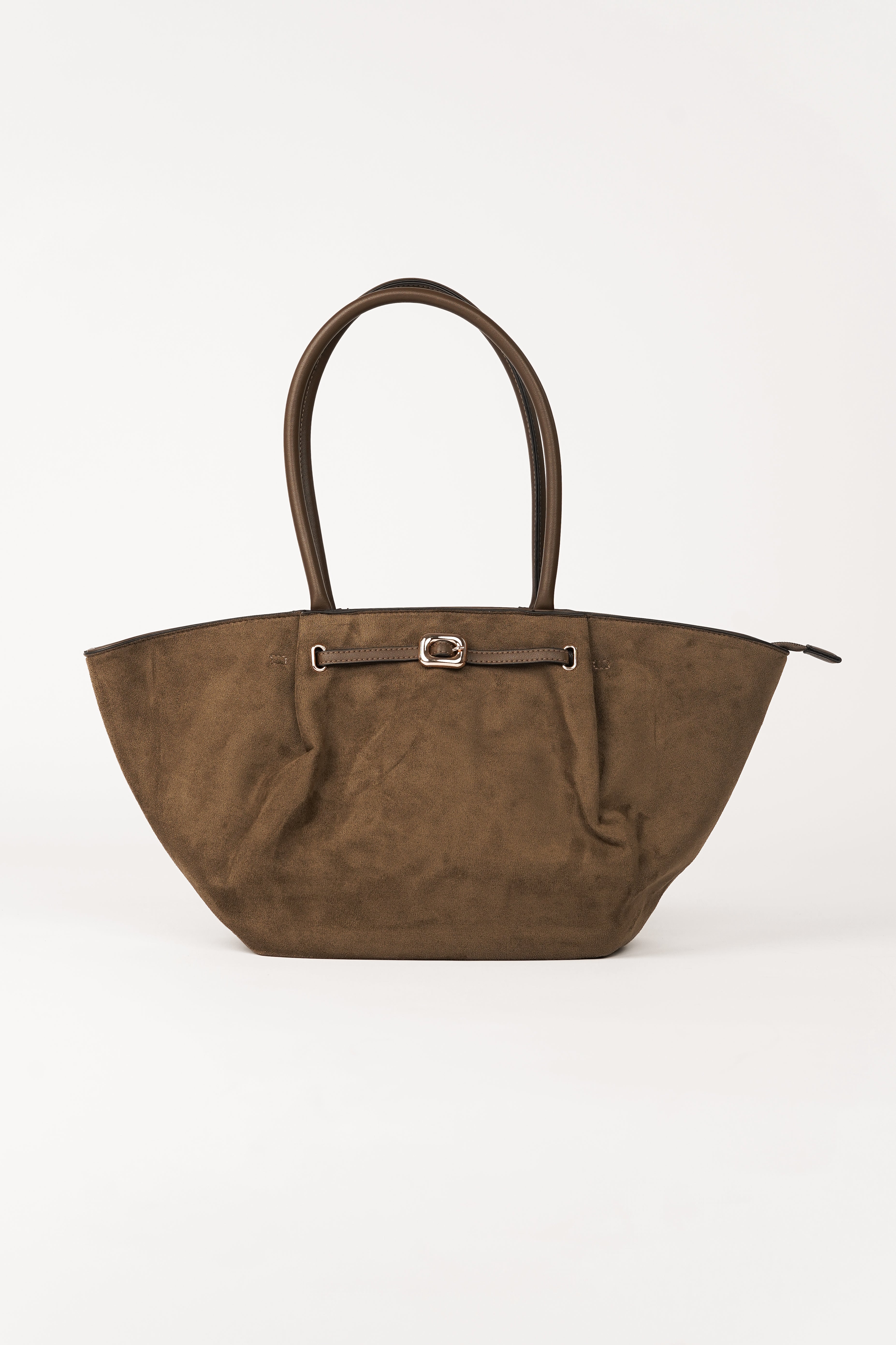 The Robin handbag is a wide design in a beautiful suede-look fabric with a gold buckle on the front. The bag closes with a zipper and has several interior pockets.