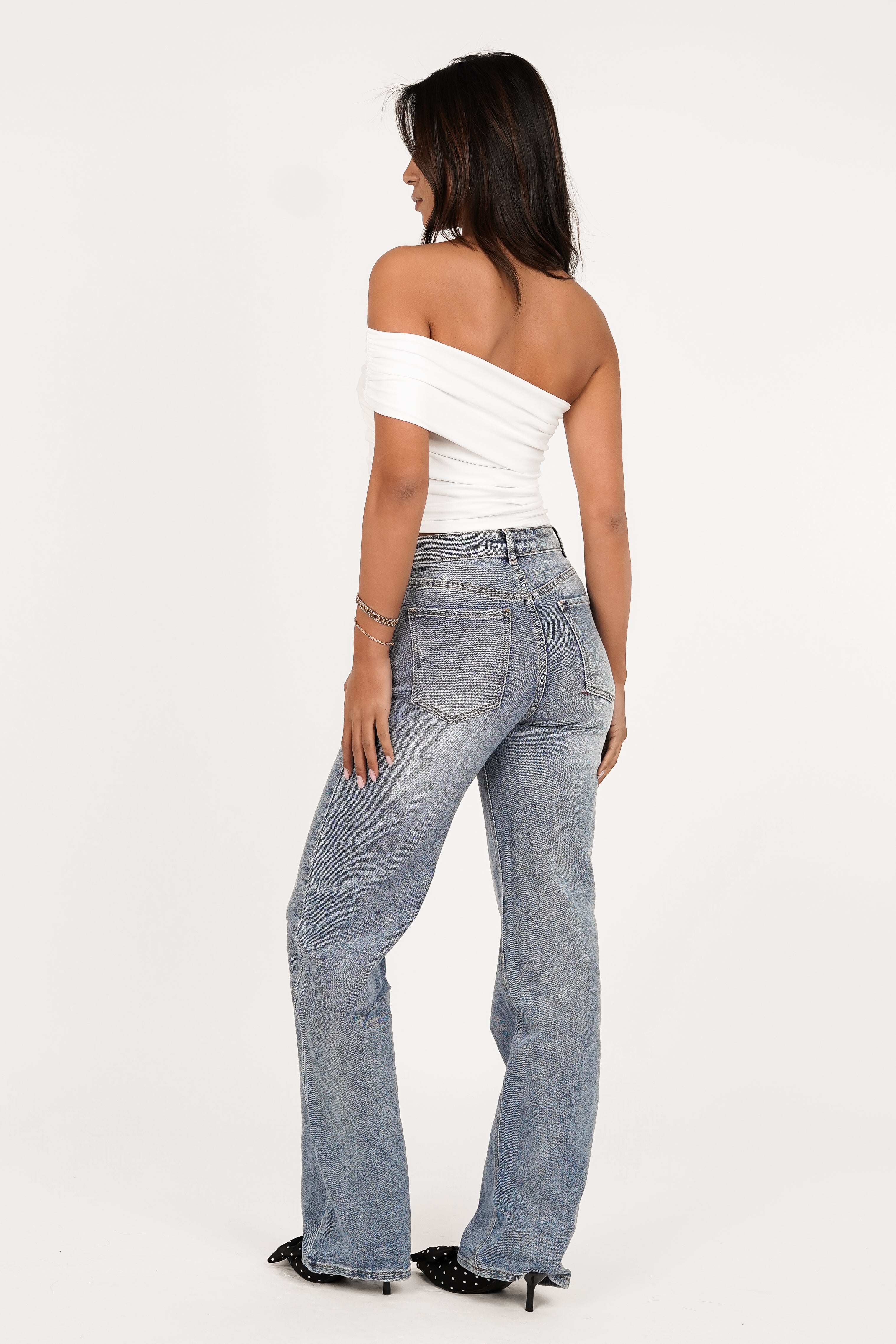 The Nena jeans have a beautiful light blue wash and a straight leg fit. They're high-waisted and close with a button and zipper. They contain stretch!