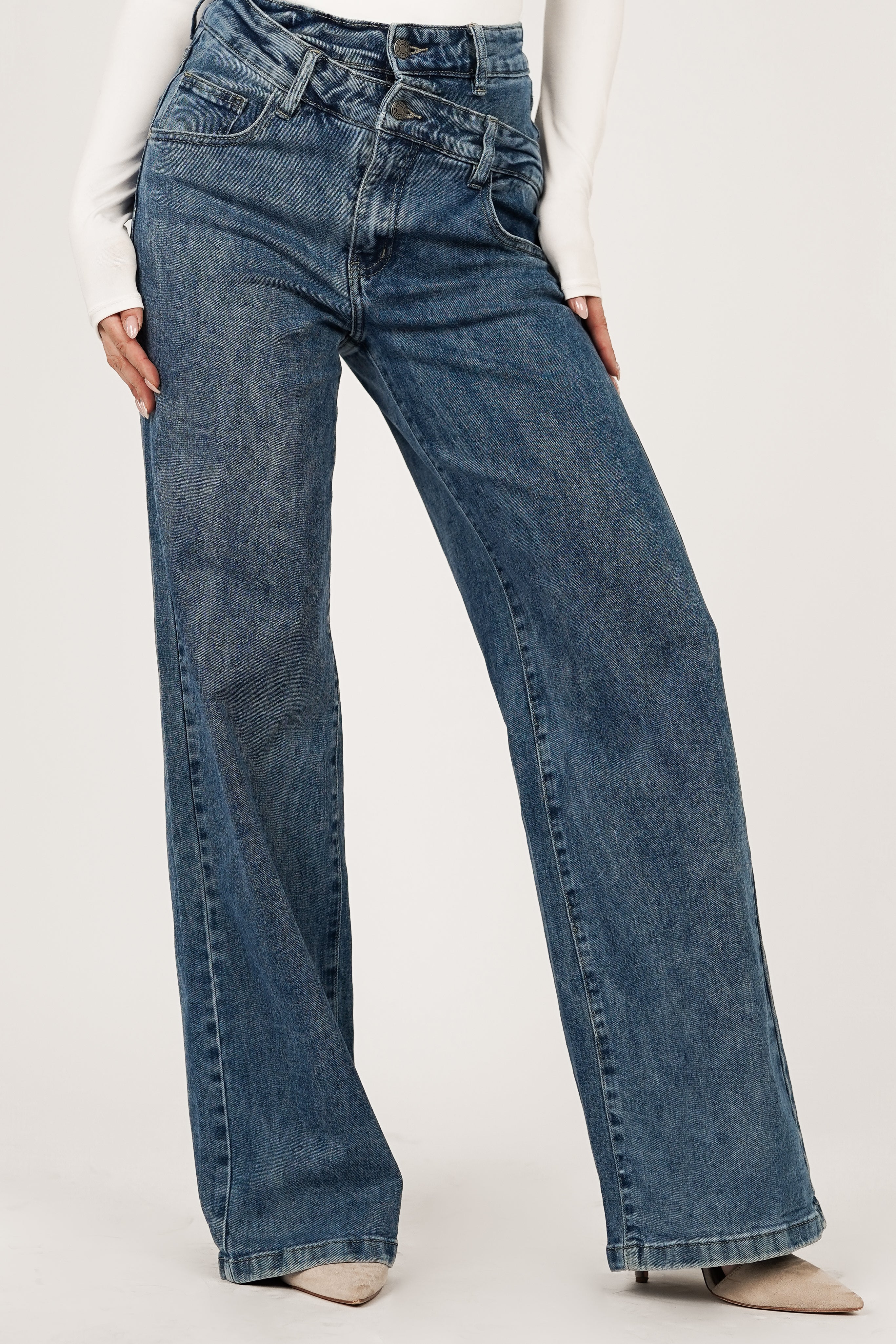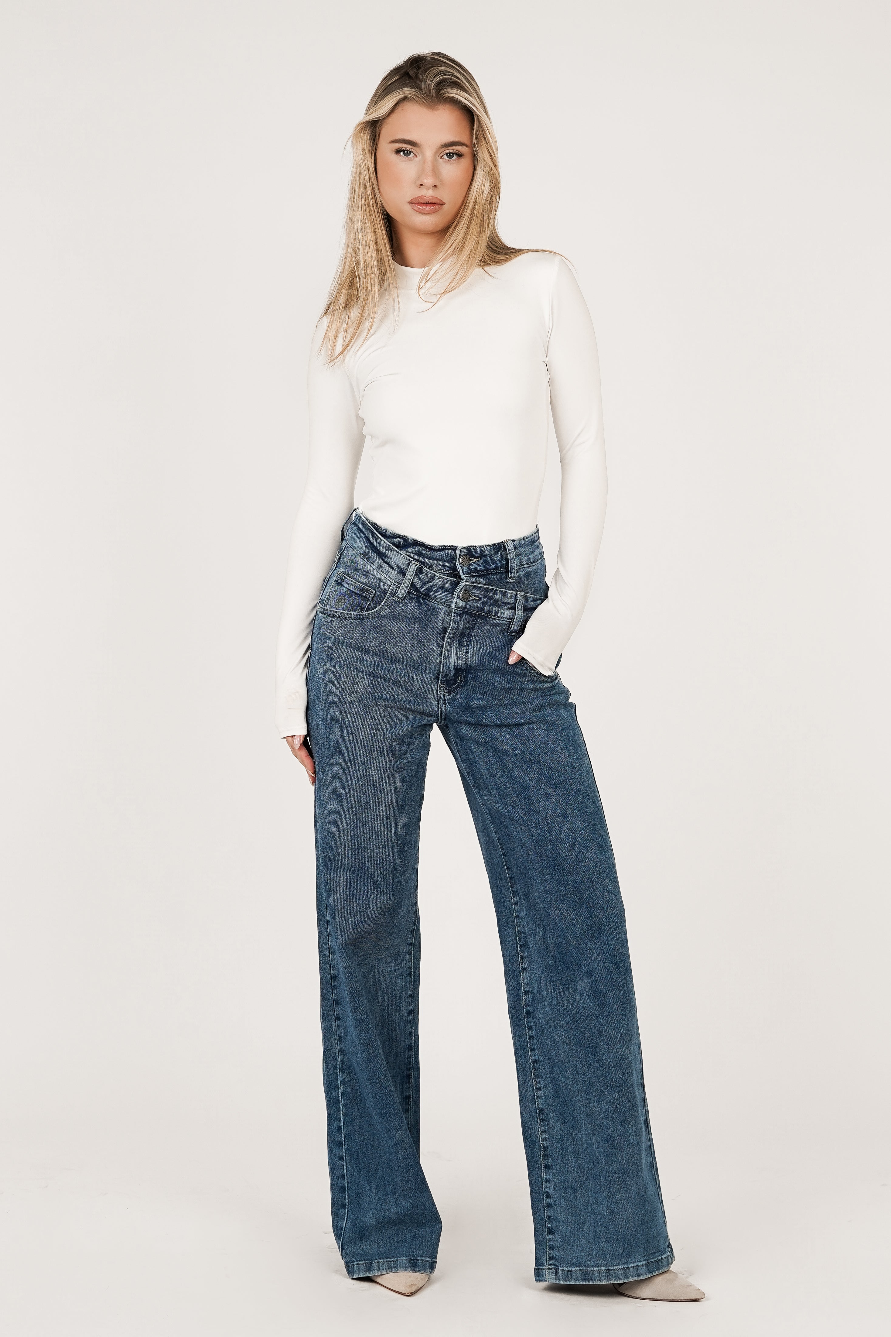 De Missy donkerblauwe high waist jeans met dubbele taille is helemaal on trend! Door de donkere wassing heeft de broek een prachtige uitstraling. In de taille wordt de broek gesloten aan de hand van 2 knopen en een ritssluiting. De broek is gemaakt van een stretchy materiaal waardoor de broek super comfortabel zit en bevat ook steekzakken.