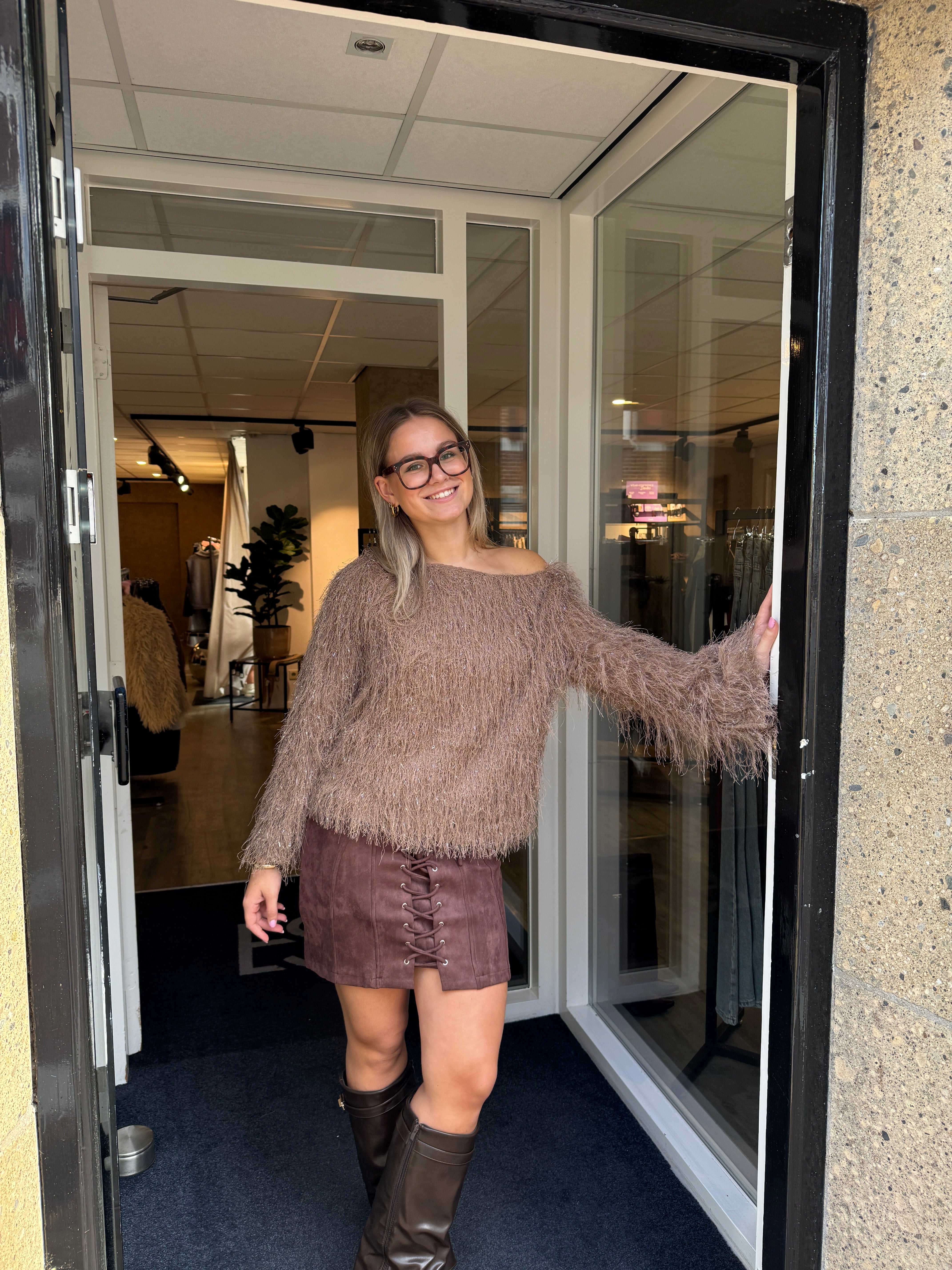 The Lilly top has a loose fit and features fringes with lurex glitter throughout the fabric. It's lined and has wide sleeves.
