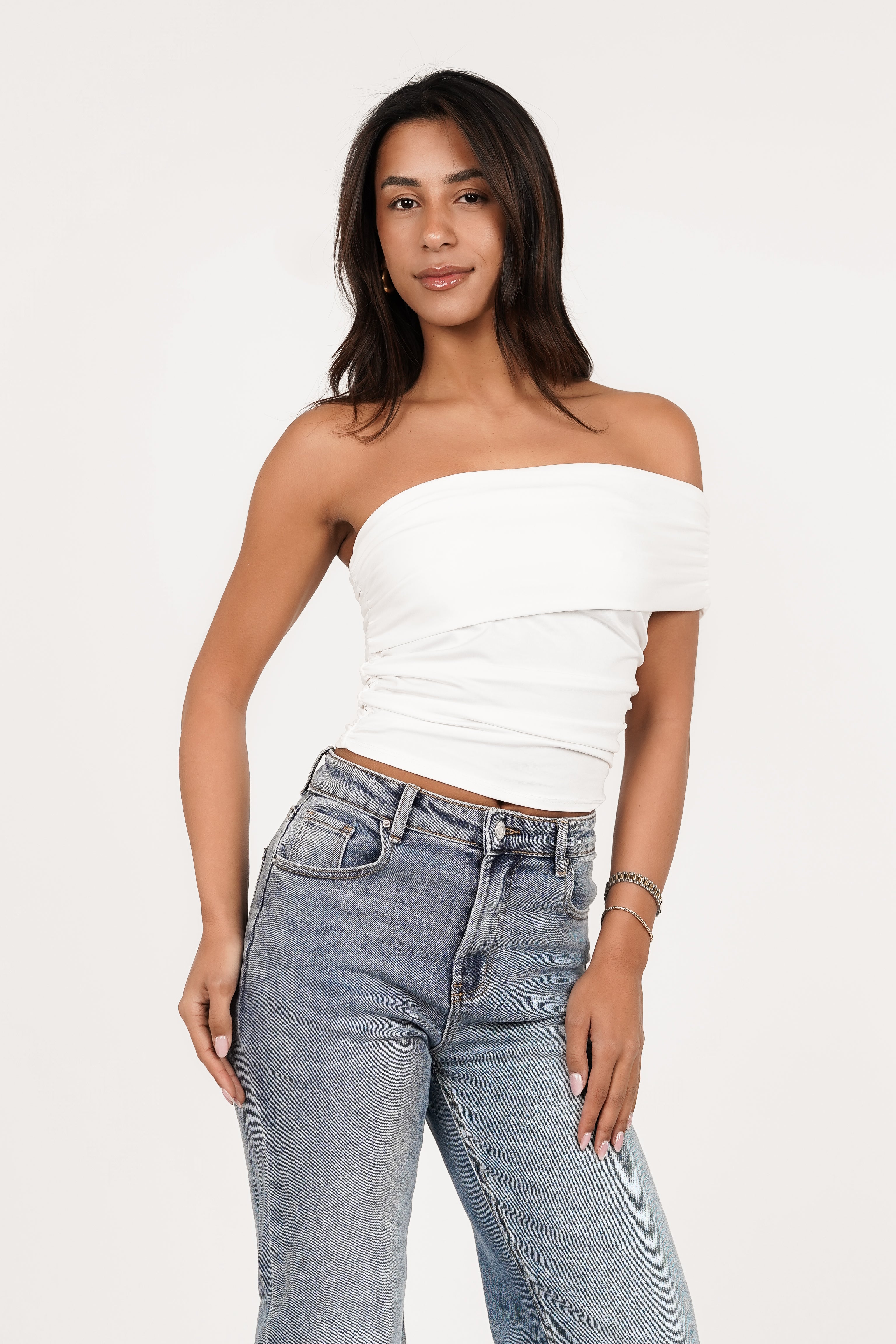 ES label! We've designed another fantastic top. The Fleur top has a cropped silhouette with a beautiful wrap-over detail on one side – super chic! The crop top is pleated on both sides and features a stretch band at the top.
