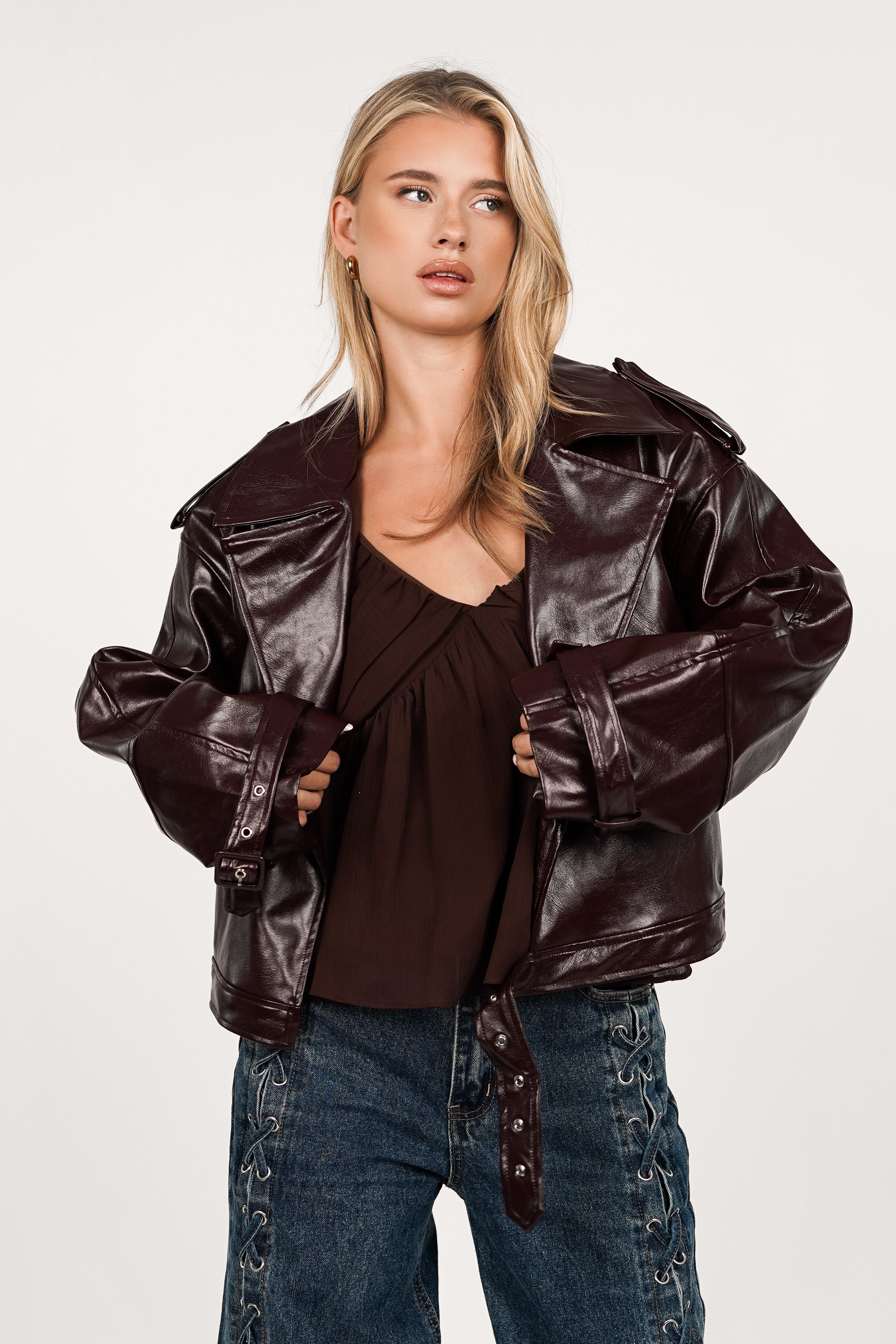 De Laura jas heeft een super gave lak stof met verschillende riempjes langs de schouders en de mouwen. Je kunt het jasje dichtmaken doormiddel van een ceintuur aan de onderzijde.