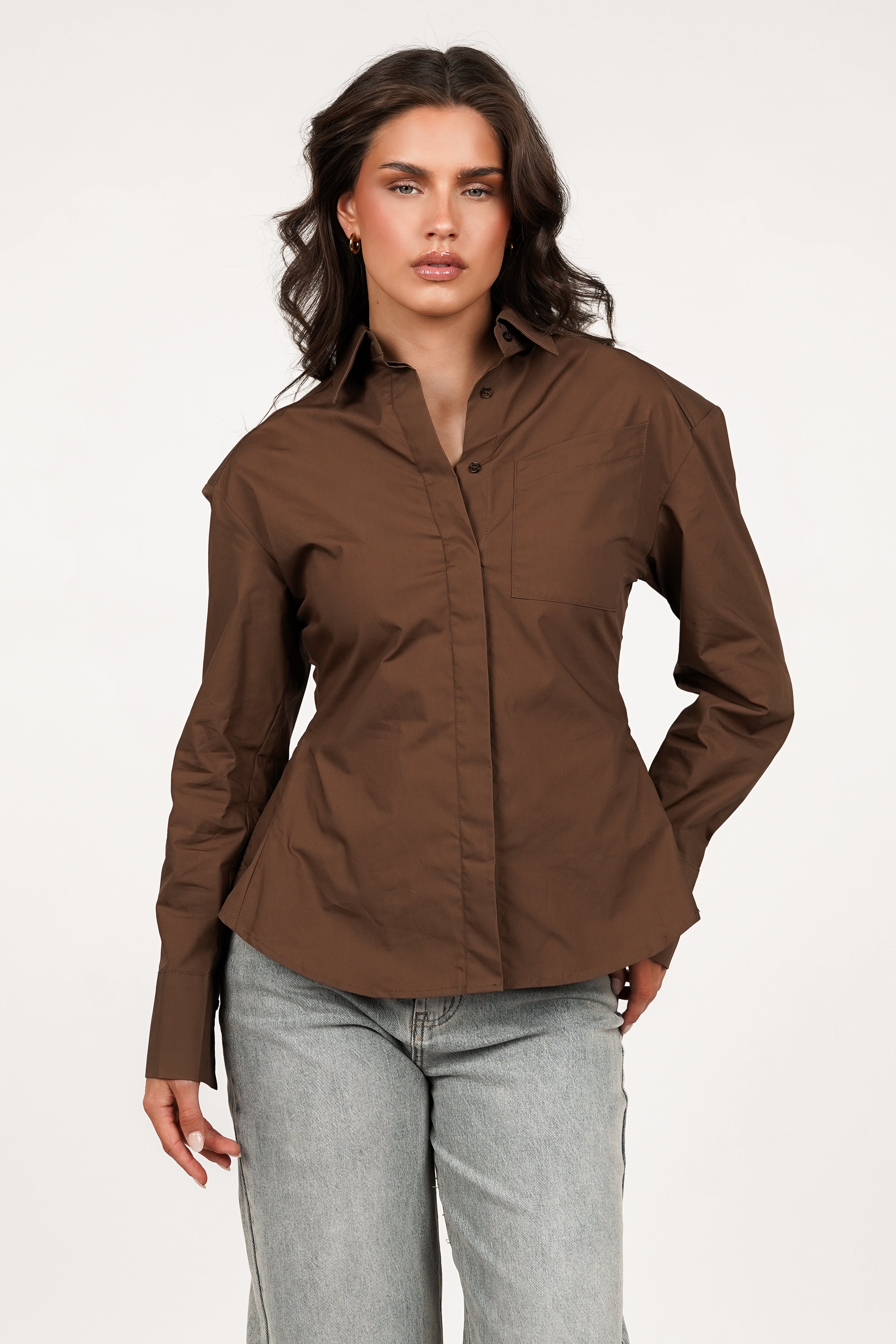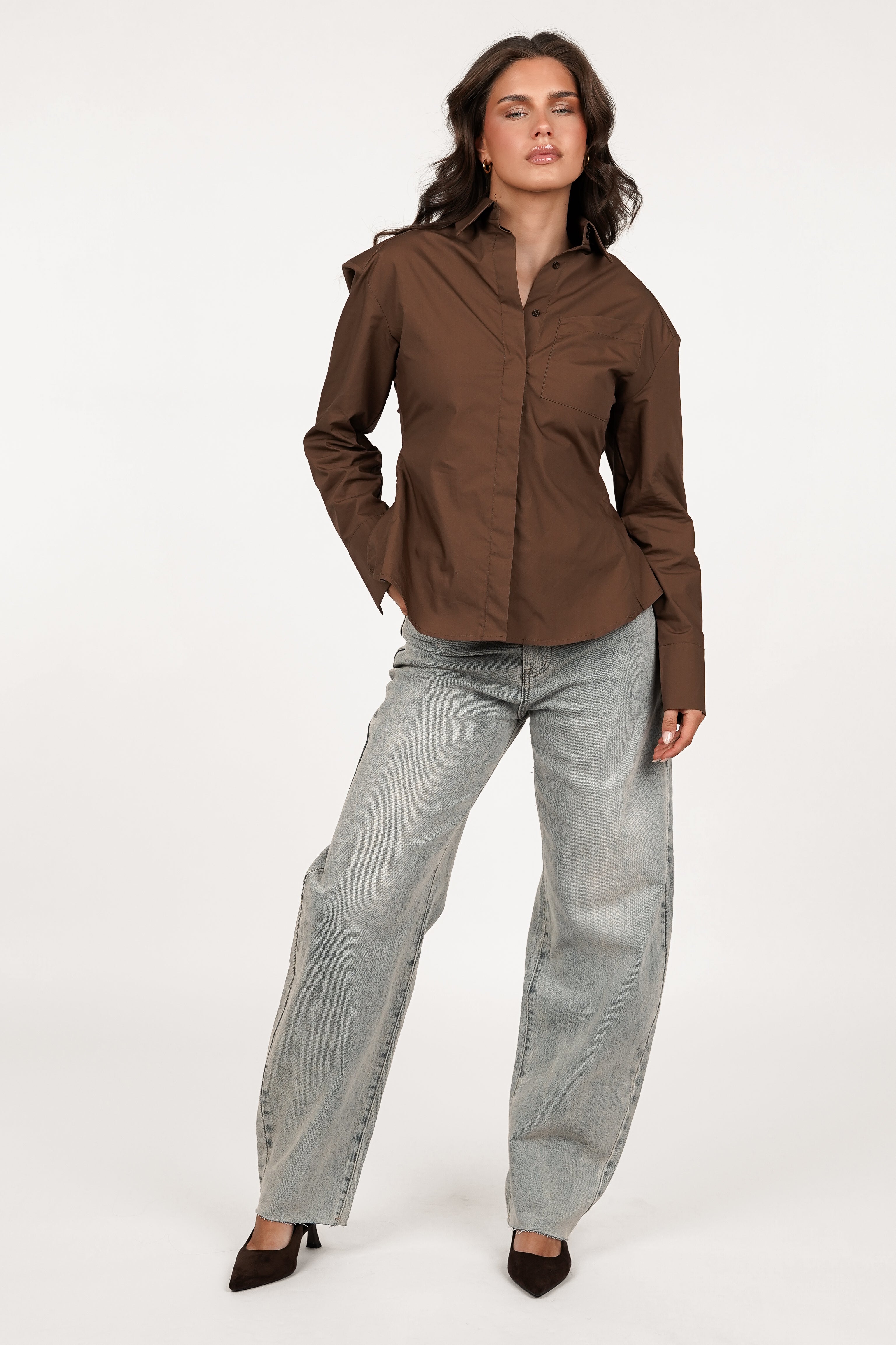 De Layla blouse is perfect voor een statement look! De dames blouse heeft een opgewerkte achterzijde met strik details, zodat je de perfecte taille kunt creëren. De blouse wordt aan de voorzijde gesloten doormiddel van knoopjes en bevat een versteviging langs de schouders.