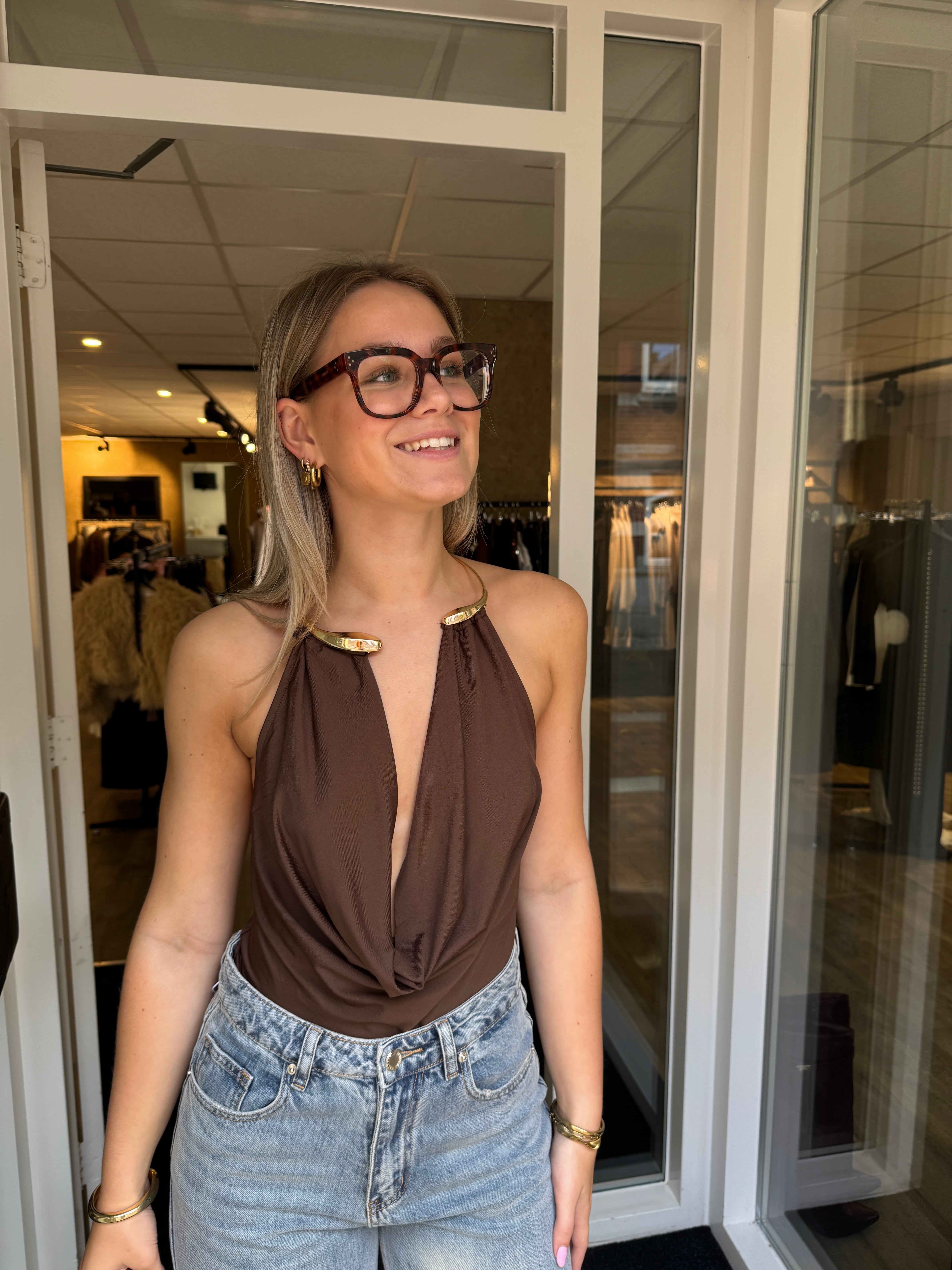De Cato body heeft een mooie waterval hals met een gouden detail rondom de hals. De body bevat stretch en een open rug. Je kunt de body sluiten doormiddel van de haak- en oogsluiting.