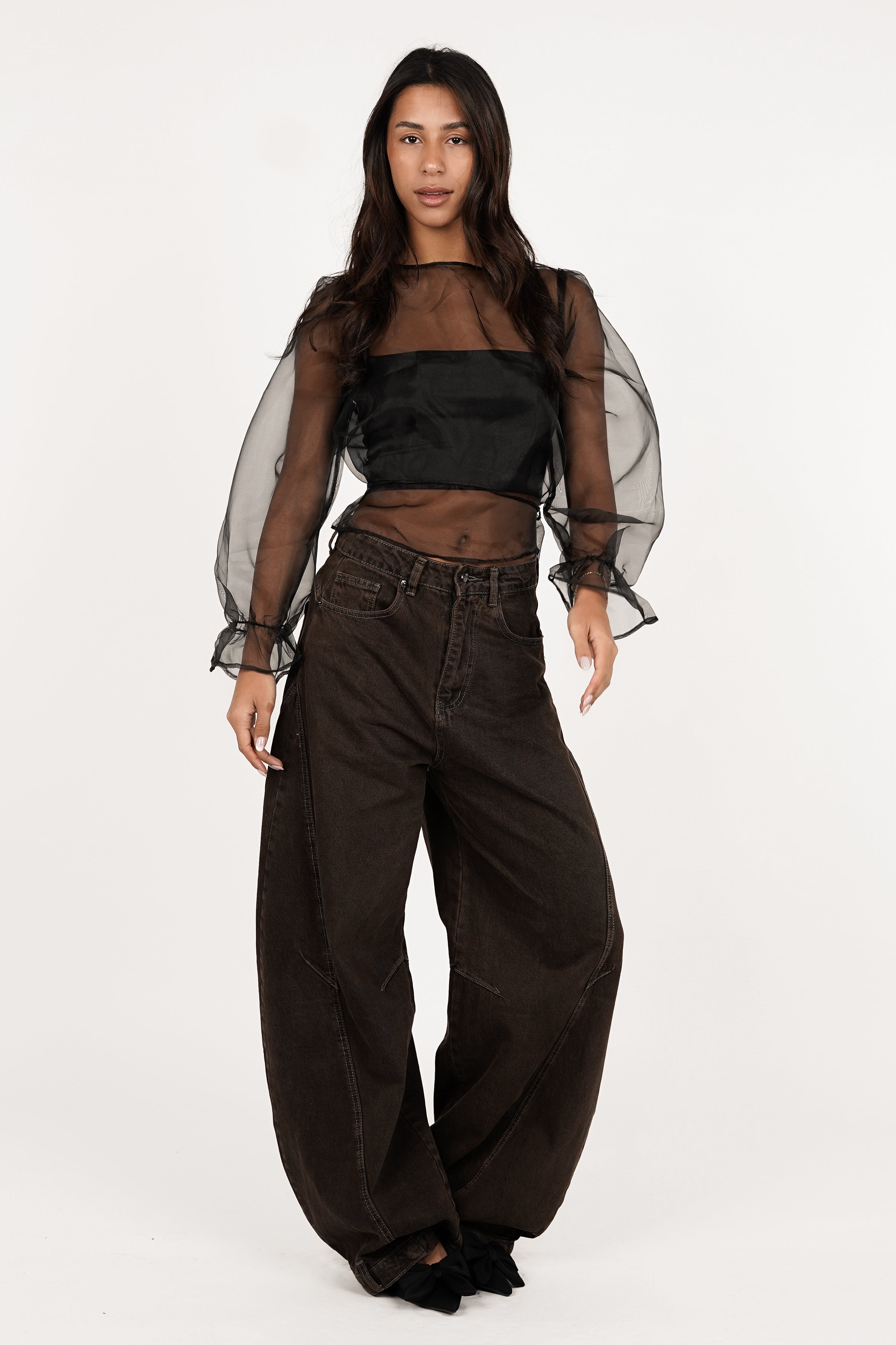 De Alba blouse heeft een wijd model in een glanzende see-trough stof met aan de achter- en voorzijde strikdetails.