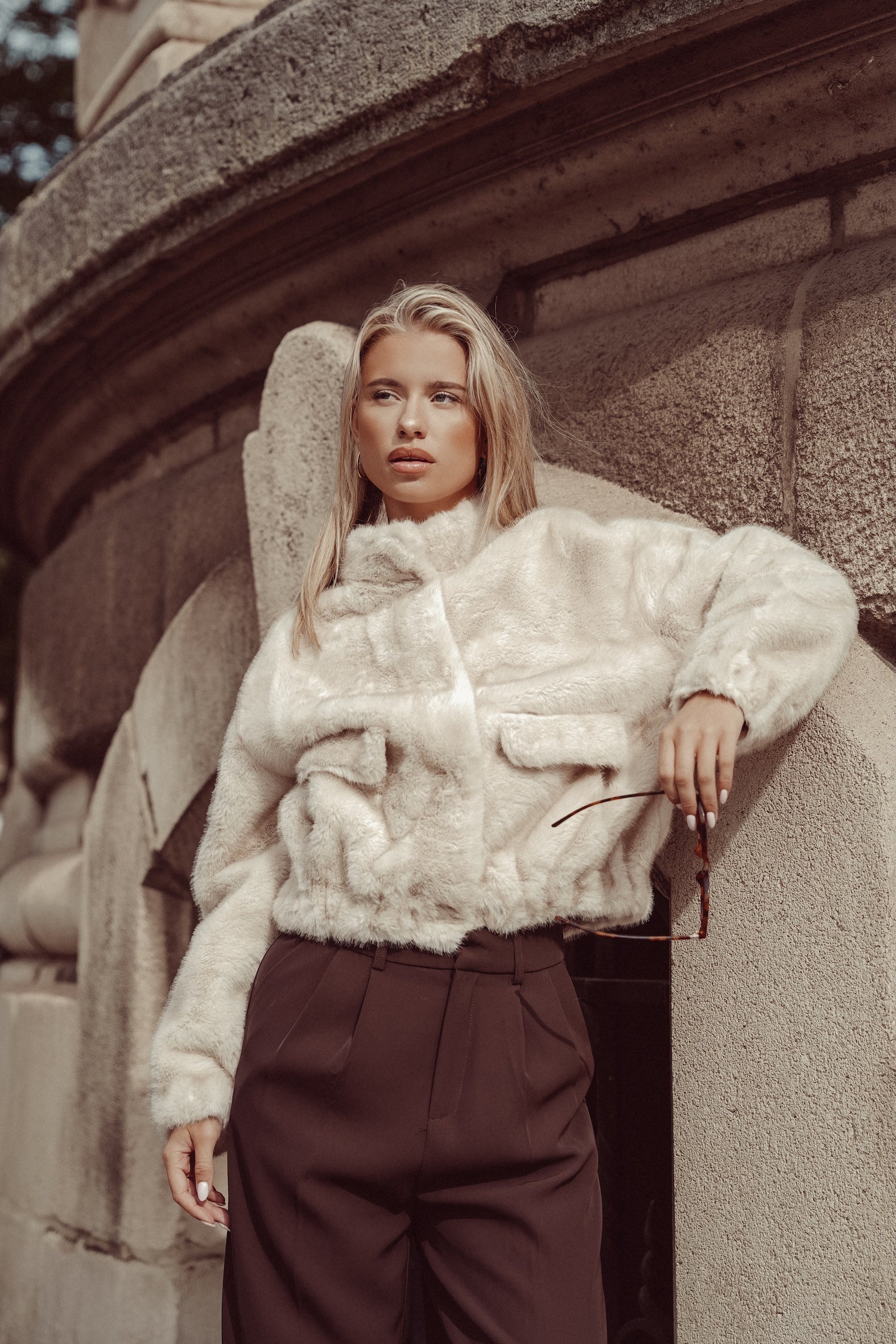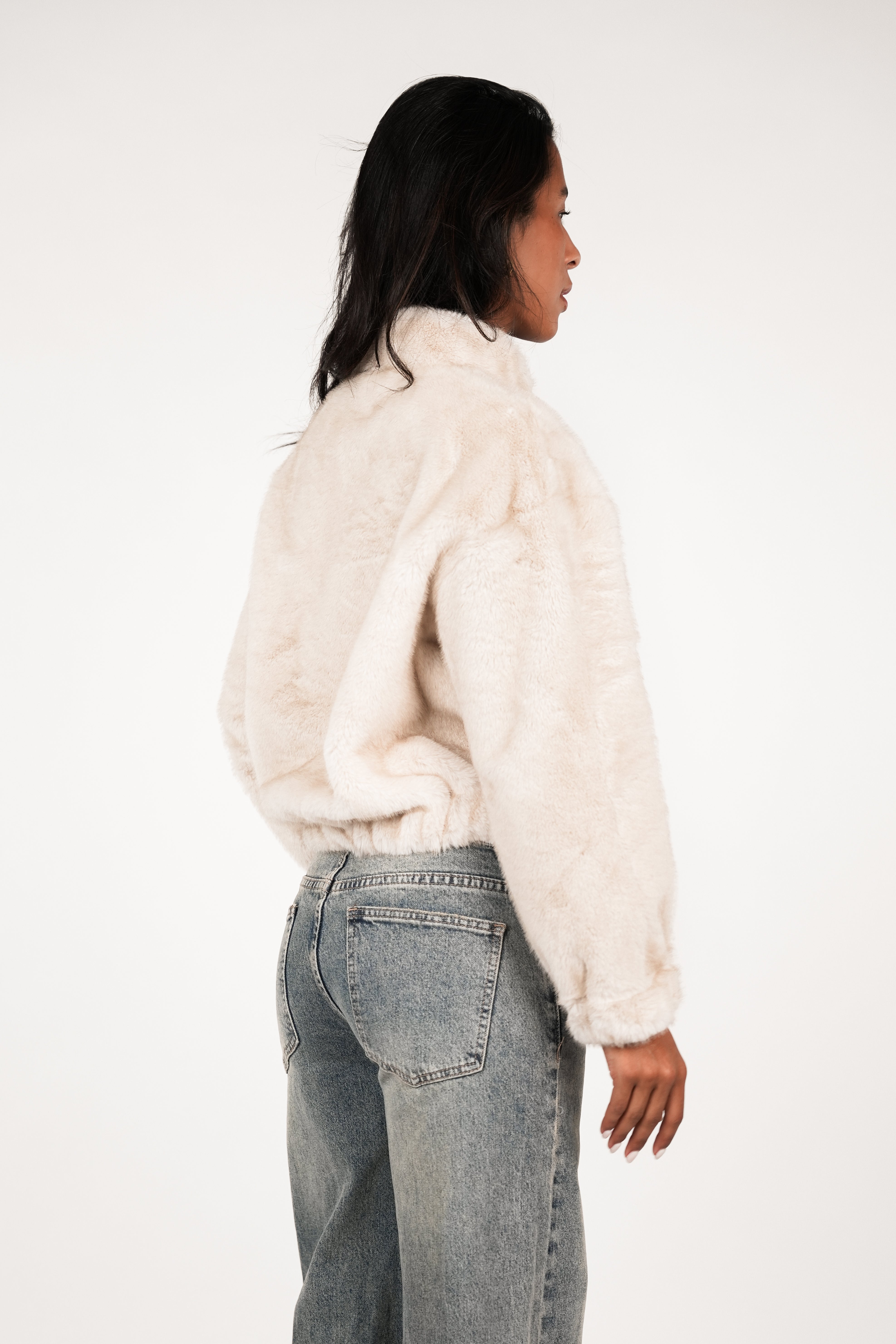 Het Laurie jasje heeft een kort model in een super zachte fake fur stof. Het bomber jasje heeft een stretchband aan de onderzijde en 2 steekzakken aan de voorzijde. Het bontjasje wordt gesloten doormiddel van drukknopen.