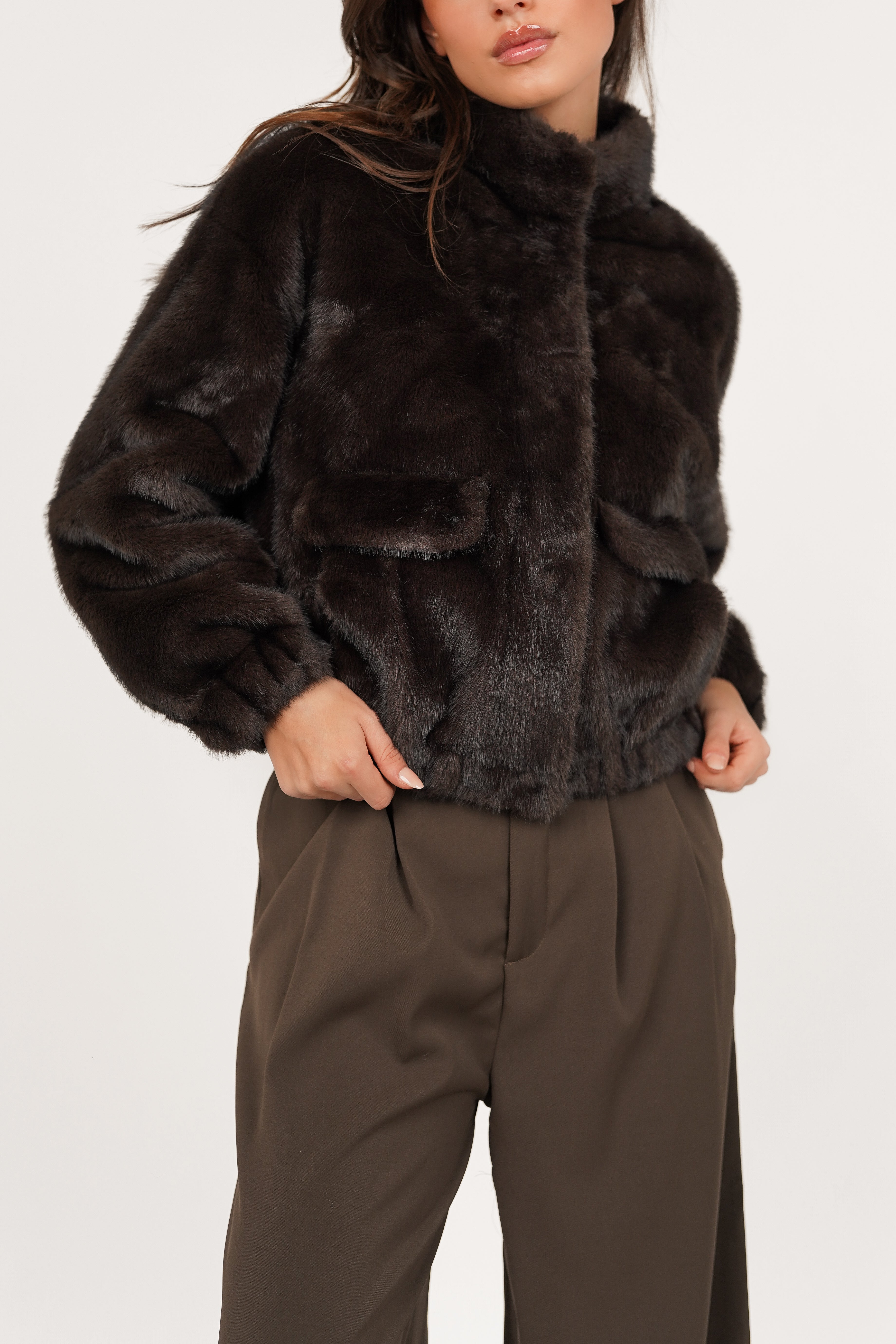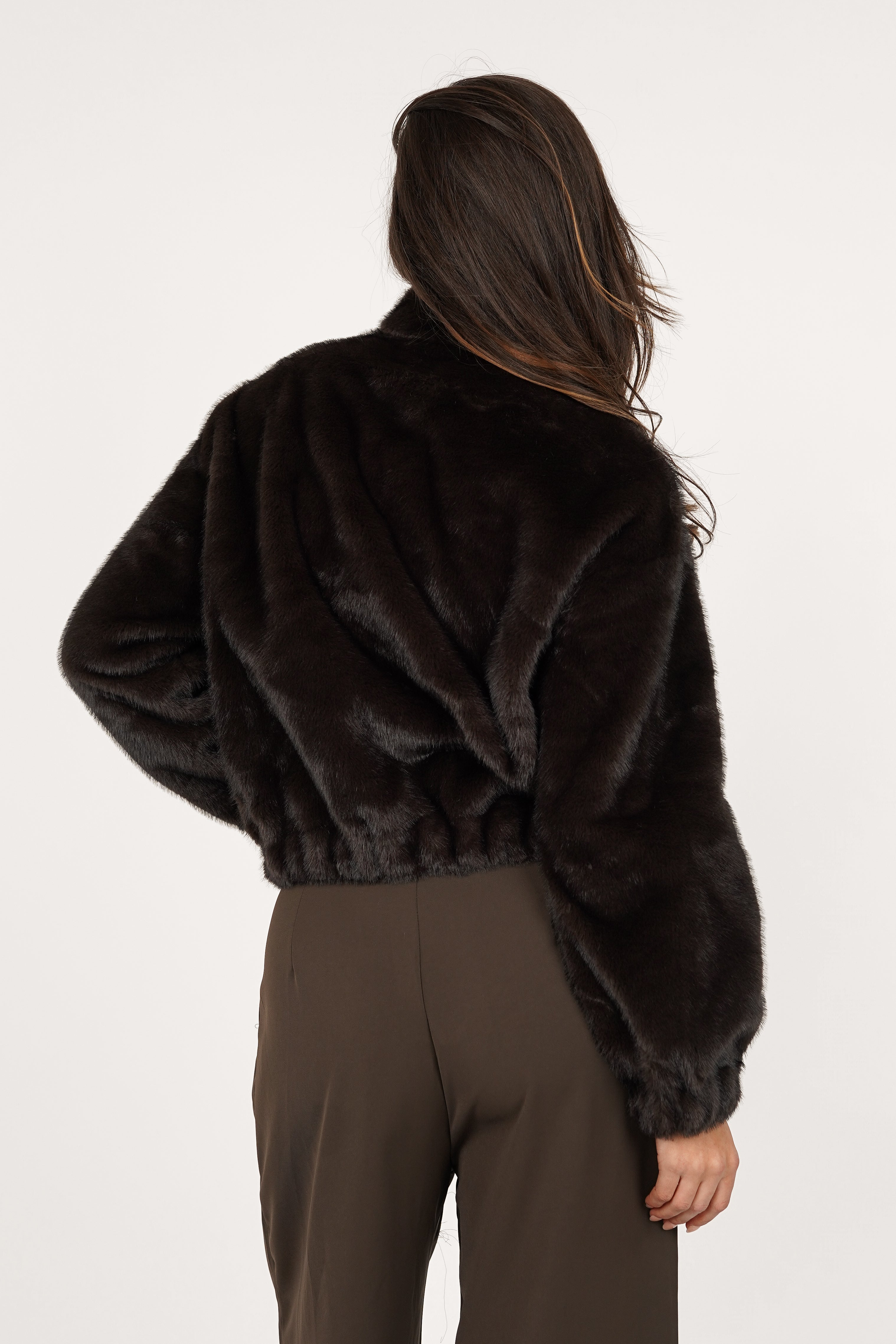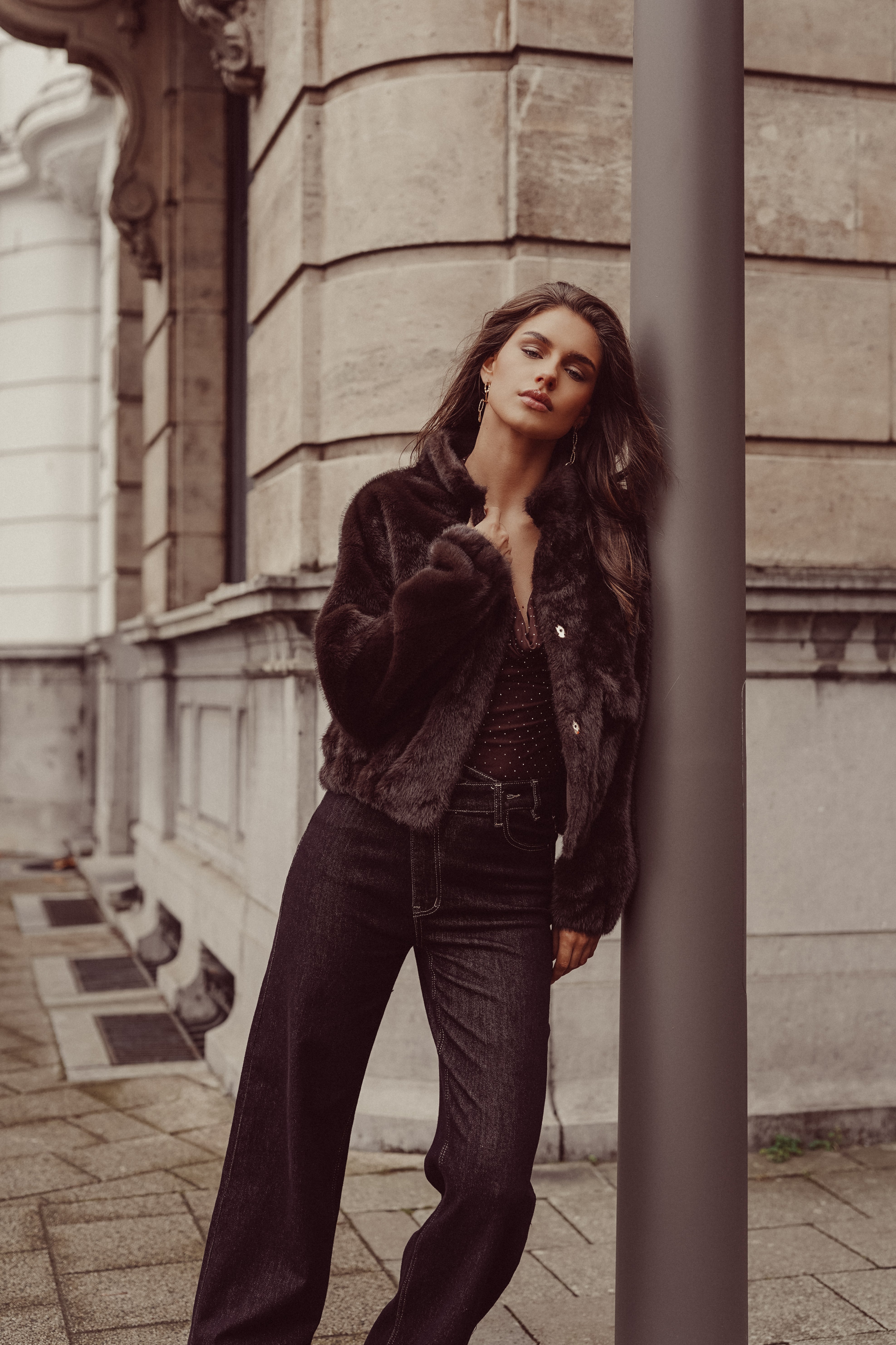 Het Laurie jasje heeft een kort model in een super zachte fake fur stof. Het bomber jasje heeft een stretchband aan de onderzijde en 2 steekzakken aan de voorzijde. Het bontjasje wordt gesloten doormiddel van drukknopen.