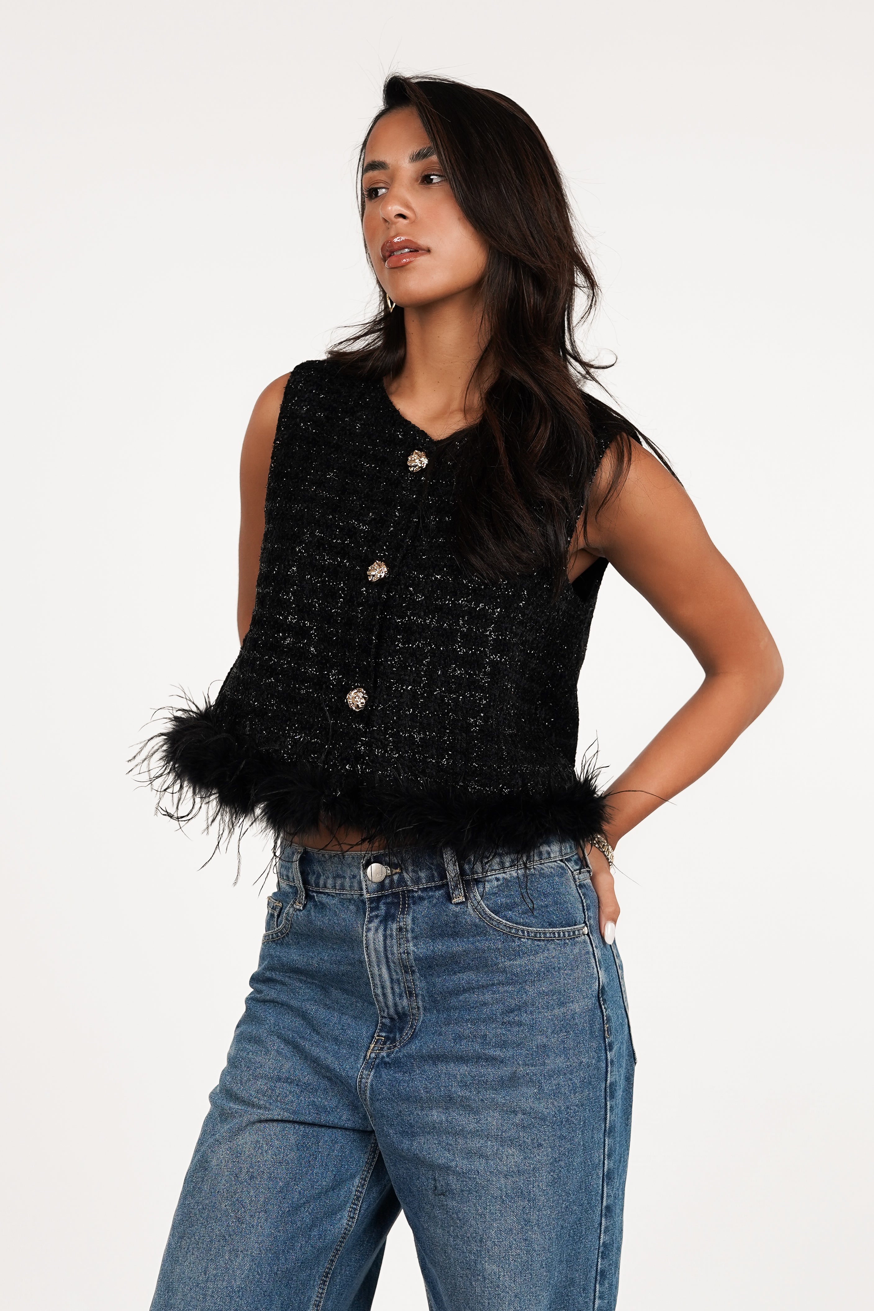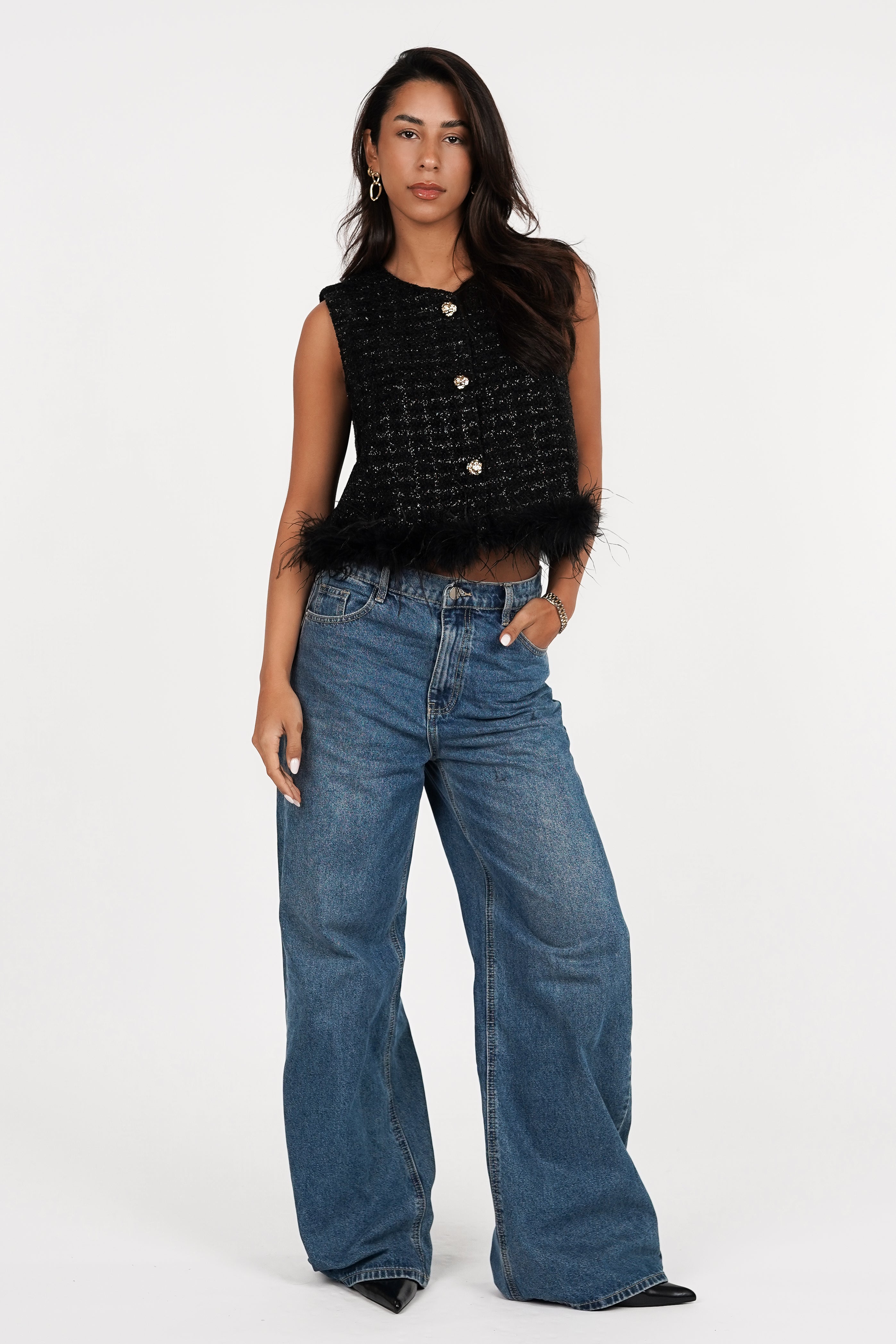 De Liora tweed gilet is de manier om je outfit direct een upgrade te geven. Met zijn klassieke stof en moderne fit mix je elegantie. De top wordt wat speelser gemaakt door de veertjes aan de onderzijde. De lurex glitter geeft een sparkle touch aan het giletje. Super leuk te stylen met een blousje door het wat wijder model met een boxy fit.
