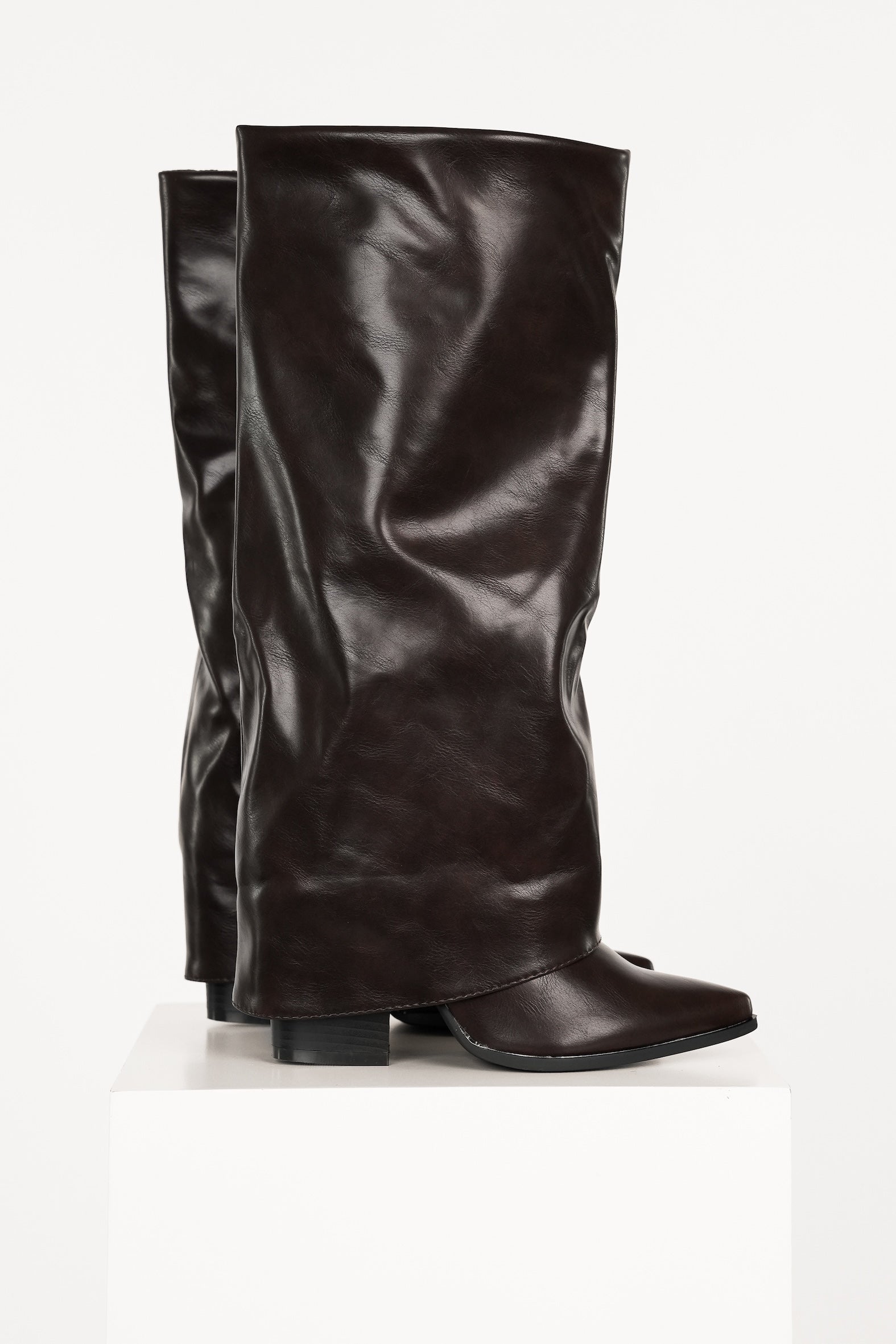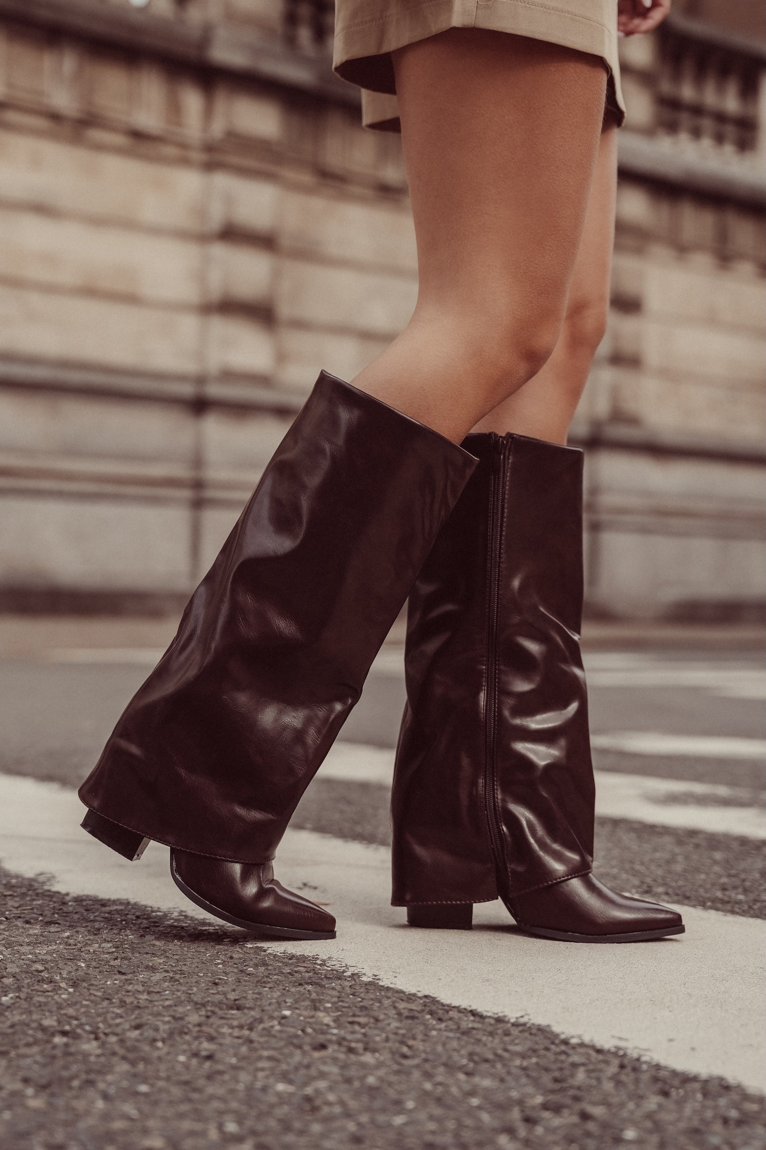 De Zeya hakken hebben een leatherlook stof met een puntige neus. De boots hebben een omslag en een blokhak. Aan de binnenzijde wordt de boots gesloten door middel van een rits.