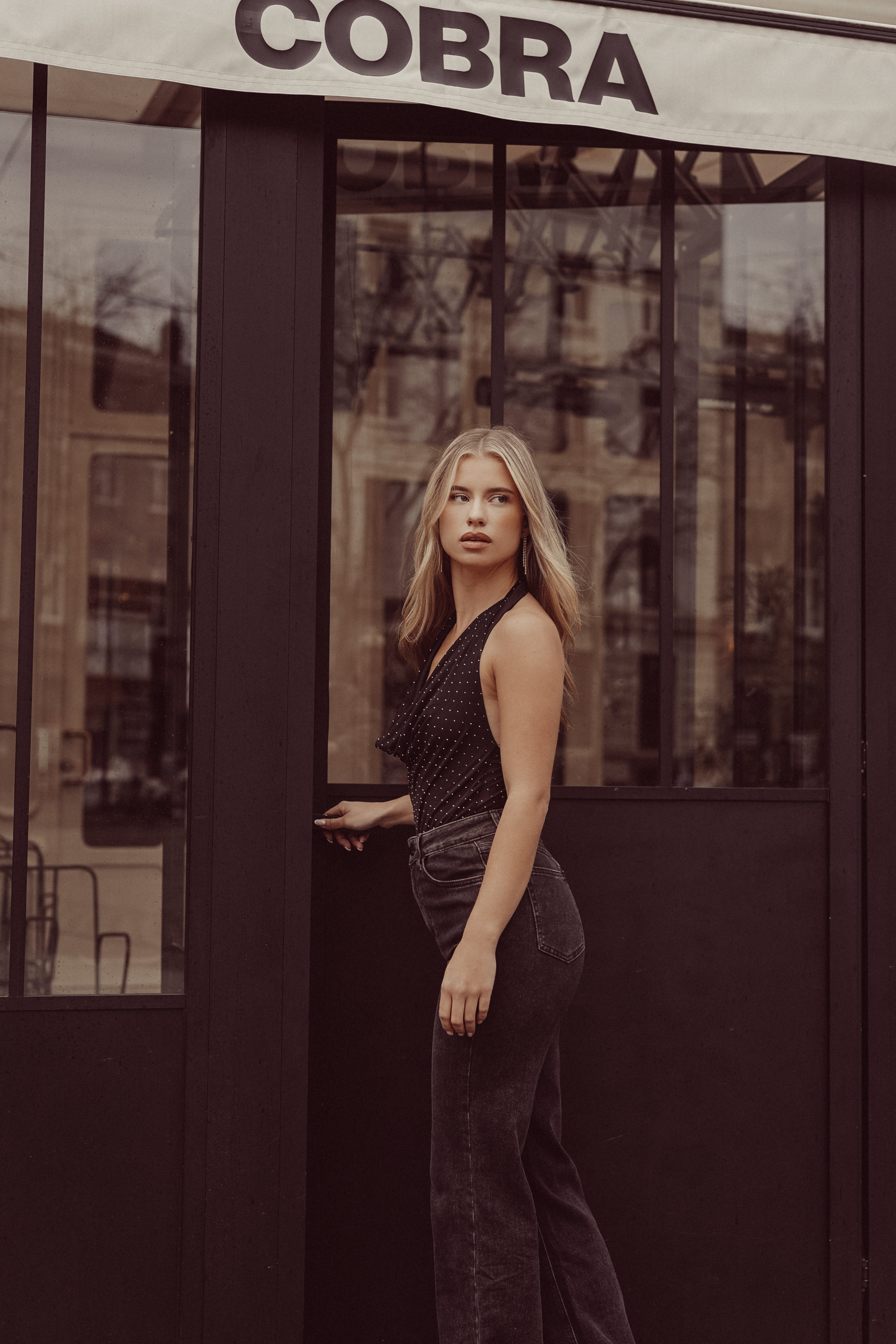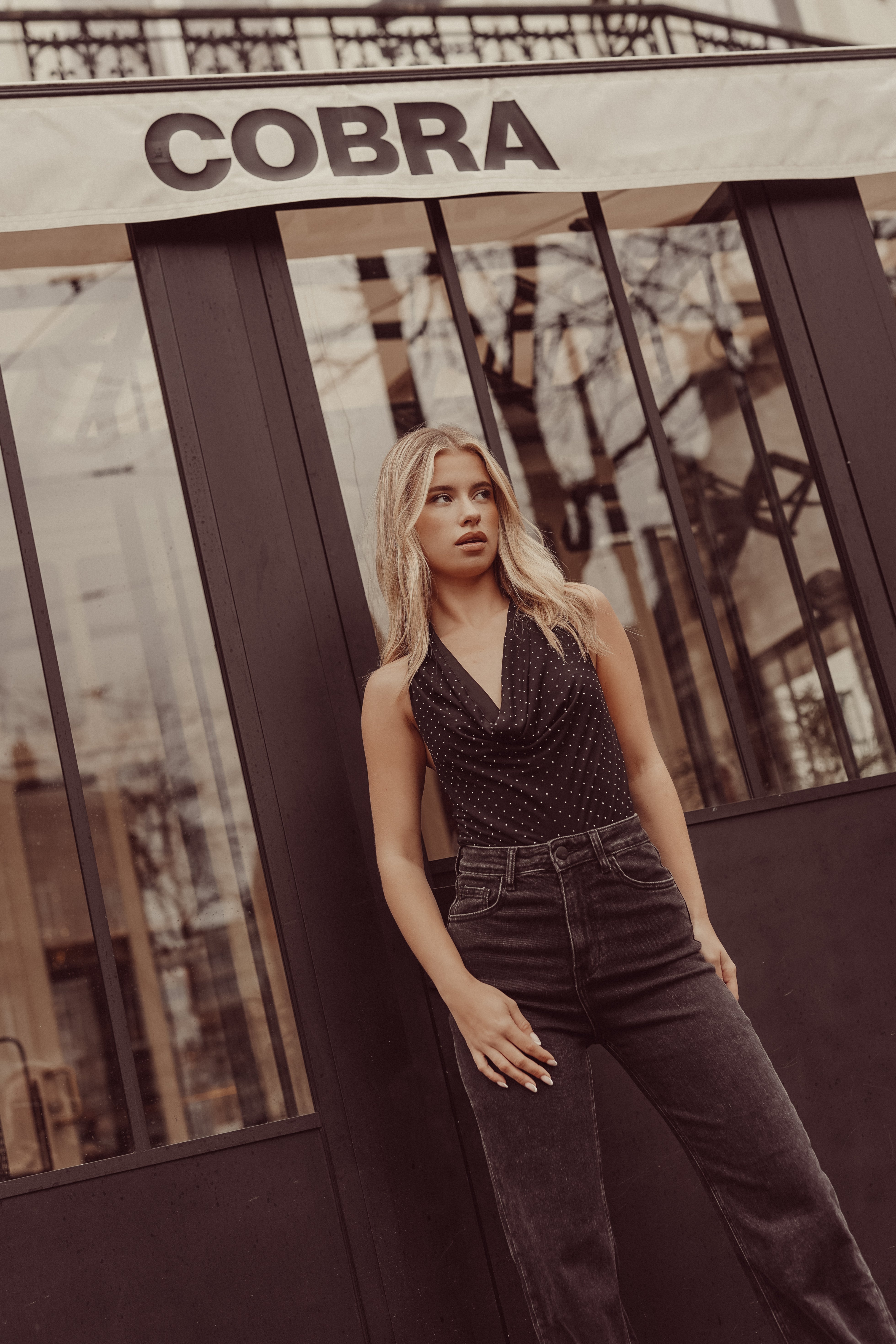 De Zora bodysuit is onze party favo! De body heeft een halter model met waterval hals en is aan de voorzijde dubbel gevoerd. De body bevat zilveren strass steentjes en heeft een string model die wordt gesloten doormiddel van een haak- en oogsluiting.