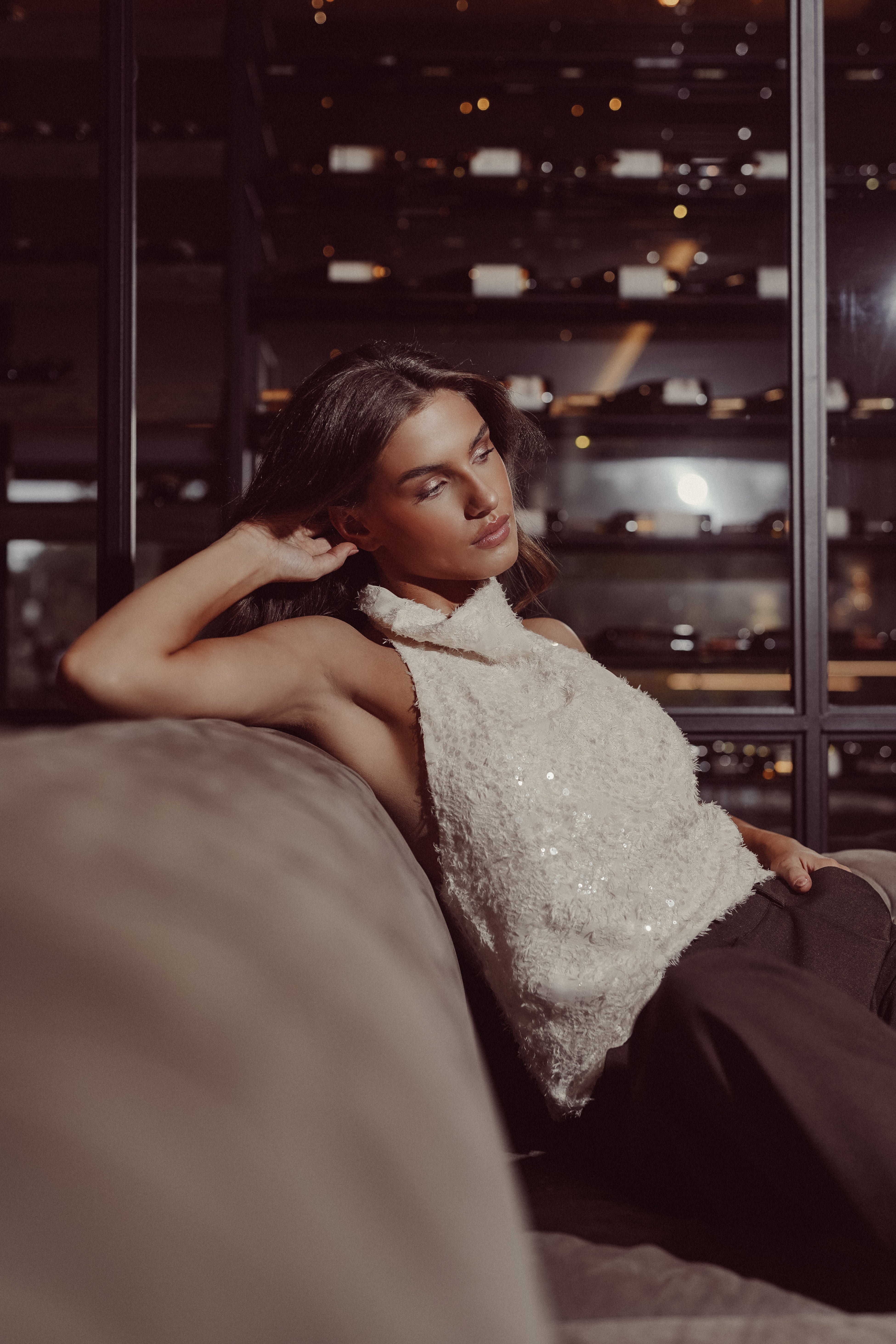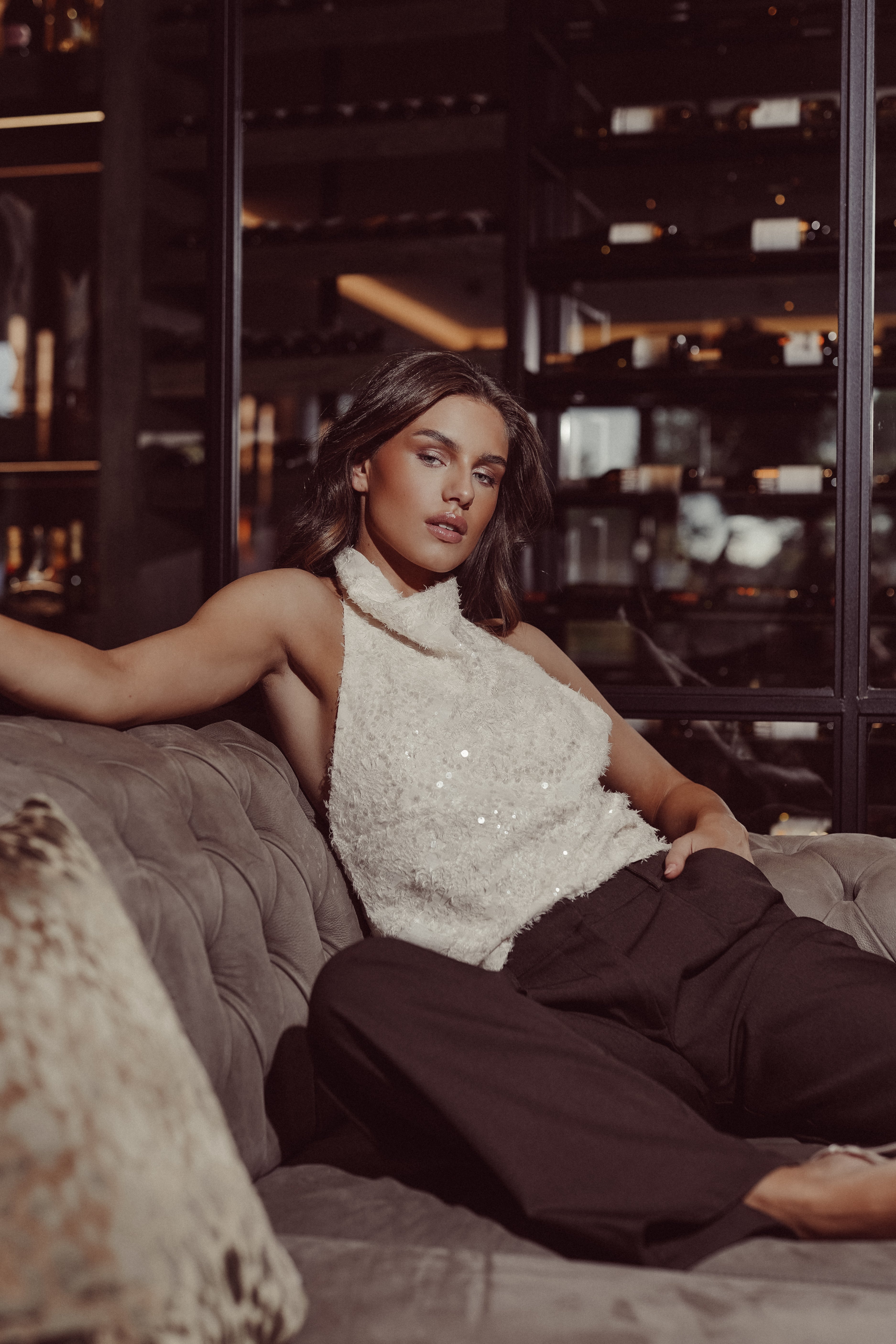 De Ava top heeft een mooie stof met fluffy details en pailletten over de gehele stof. De top heeft een halter model met een lage rug en wordt gesloten doormiddel van knoopjes in de nek.
