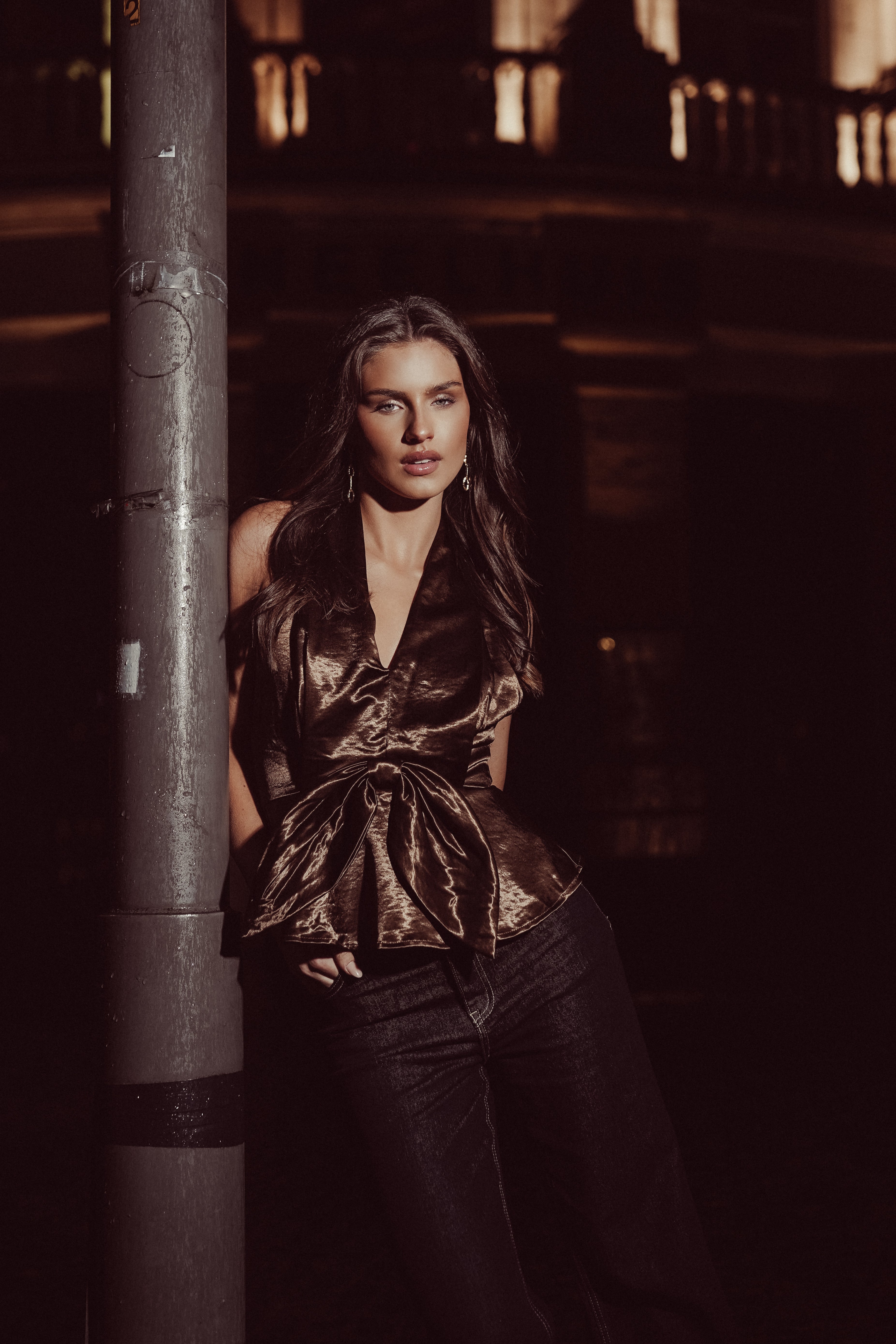 De Esmee top heeft een mooie satinlook stof in een prachtig halter model met open rug. De top heeft aan de voorzijde een strikdetail met versteviging en wordt aan de achterzijde gesloten doormiddel van een rits.