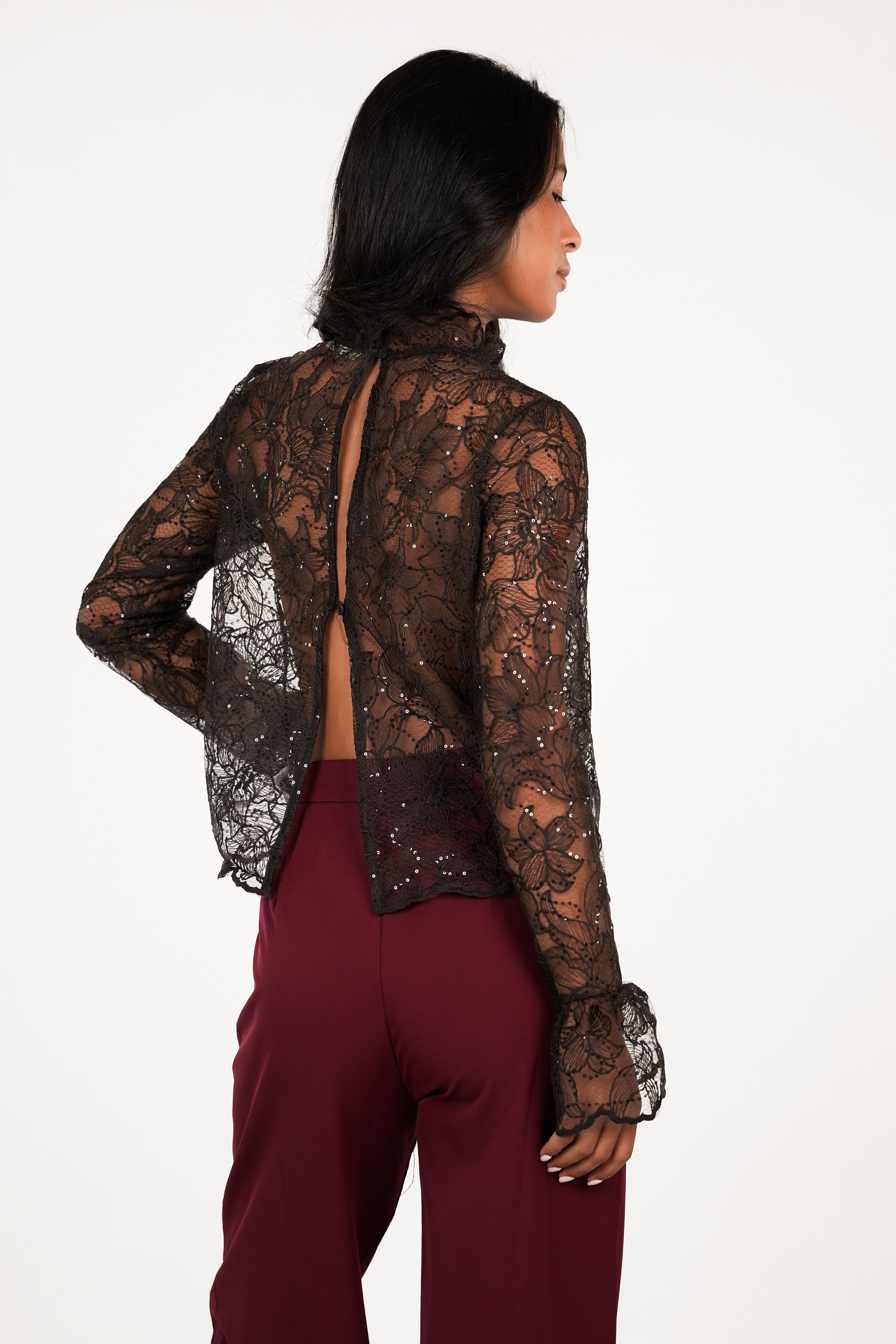 De Dunya blouse heeft een prachtige see trough stof met een bloemenprint met kleine pailletten. De blouse wordt aan de achterzijde gesloten met 2 knoopjes en heeft een open back effect.