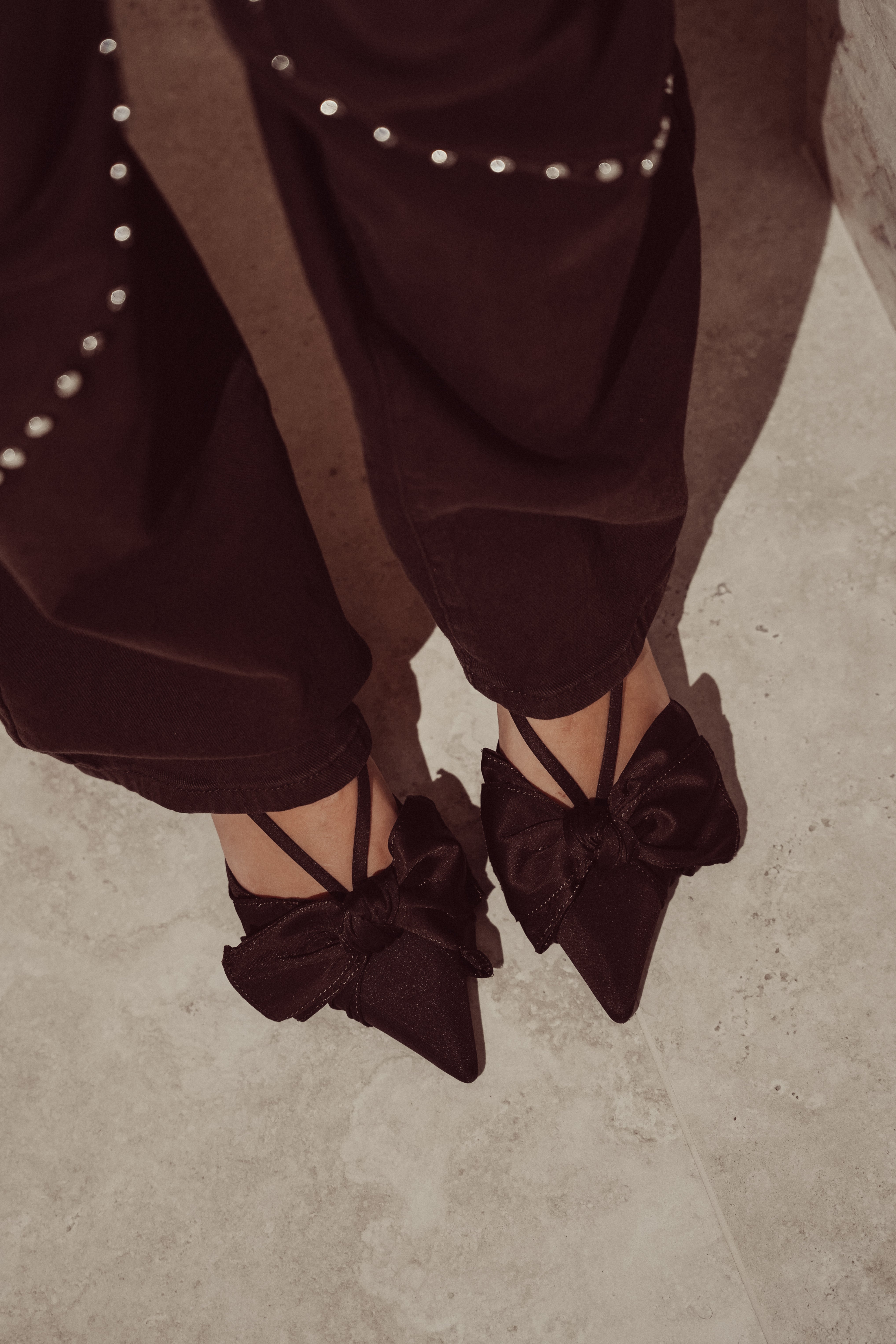 De Ricky hakken hebben een punt neus met een strik detail aan de bovenzijde. De heels worden gesloten doormiddel van een enkelbandje met verstelbare gesp.