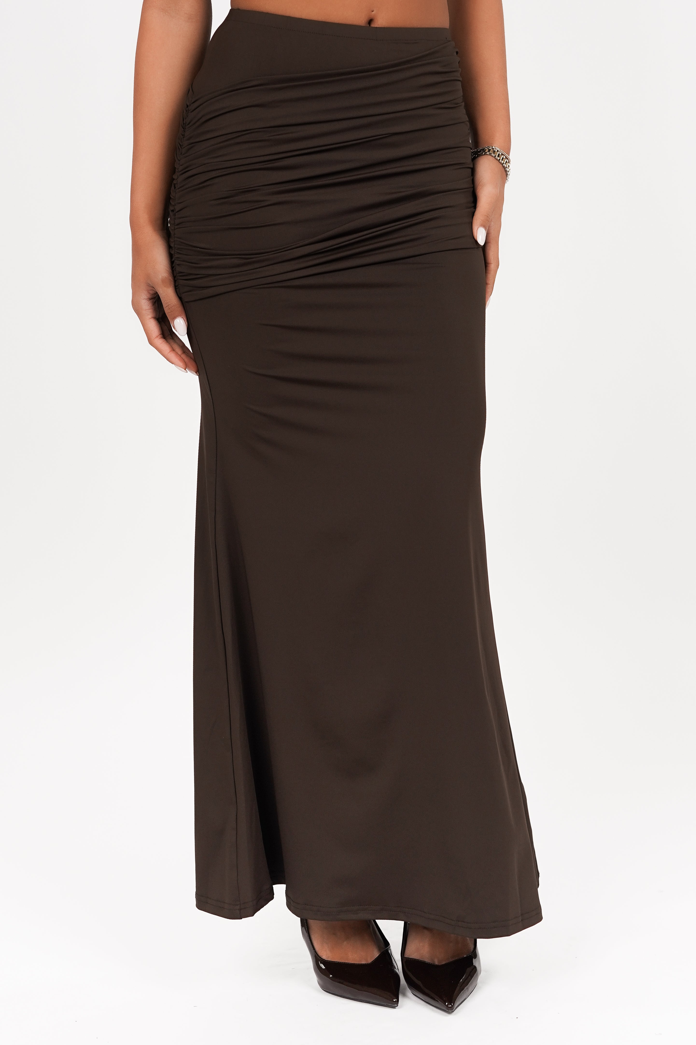 Deze bruine maxi rok is het item dat niet mag ontbreken in de garderobe. De rok valt elegant langs het lichaam en beweegt soepel met je mee, waardoor je altijd een stijlvolle en vrouwelijke look creëert. De Mikki rok heeft een gedrapeerd detail rondom en is leuk te matchen met de bijpassende top.