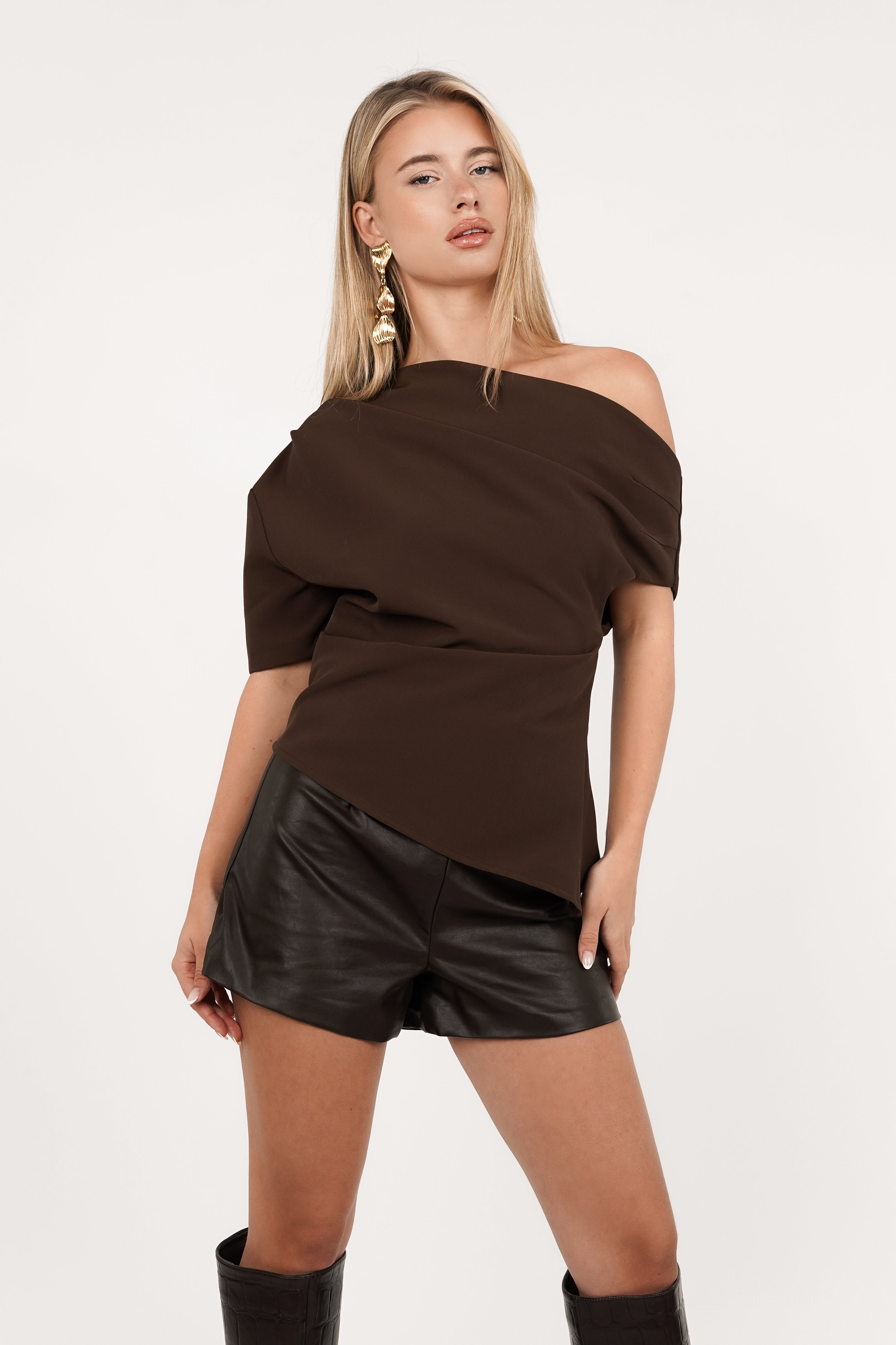 De Tessa top heeft een one shoulder top heeft een korte mouw aan een kant en loopt schuin af off shoulder en ook aan de onderzijde.