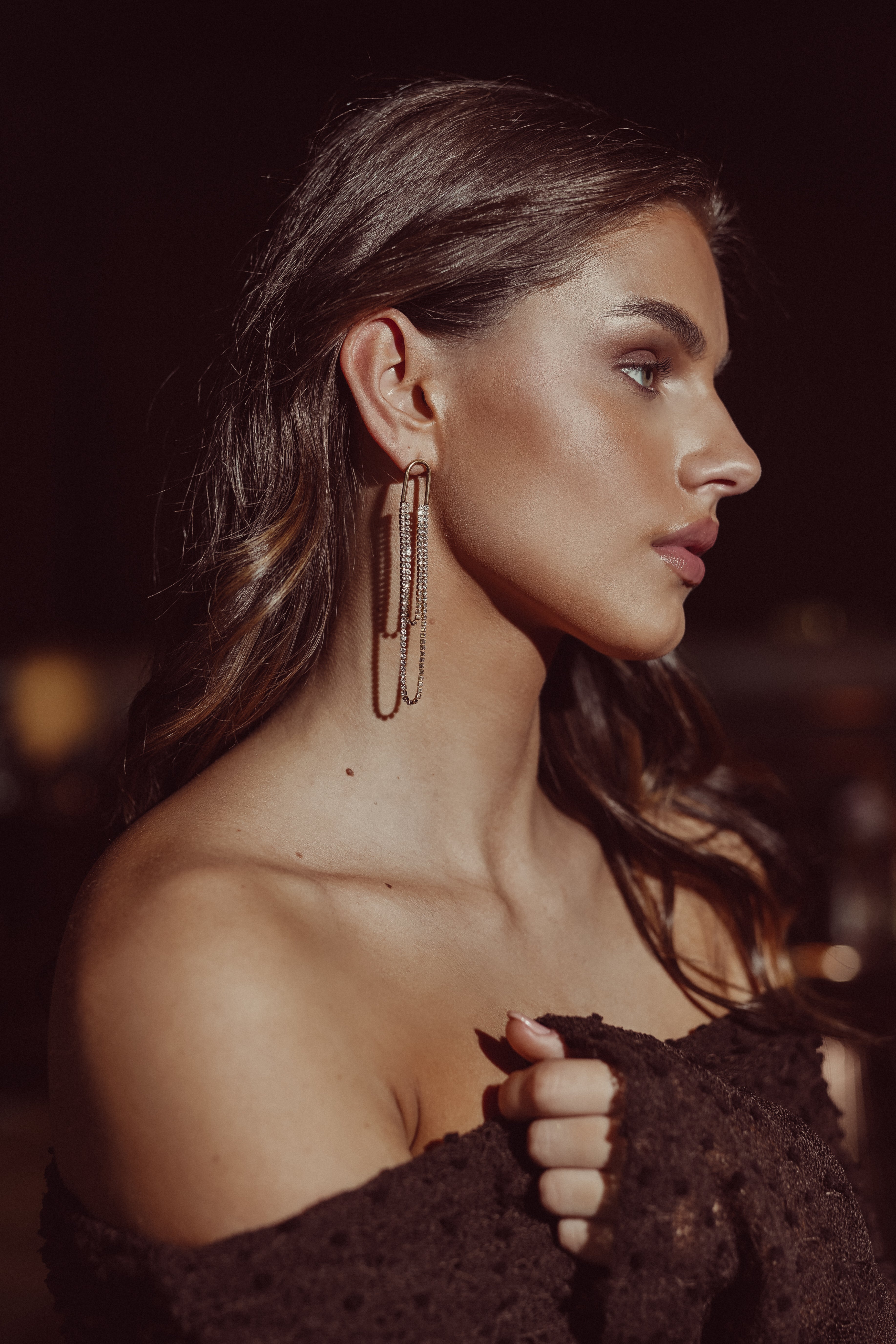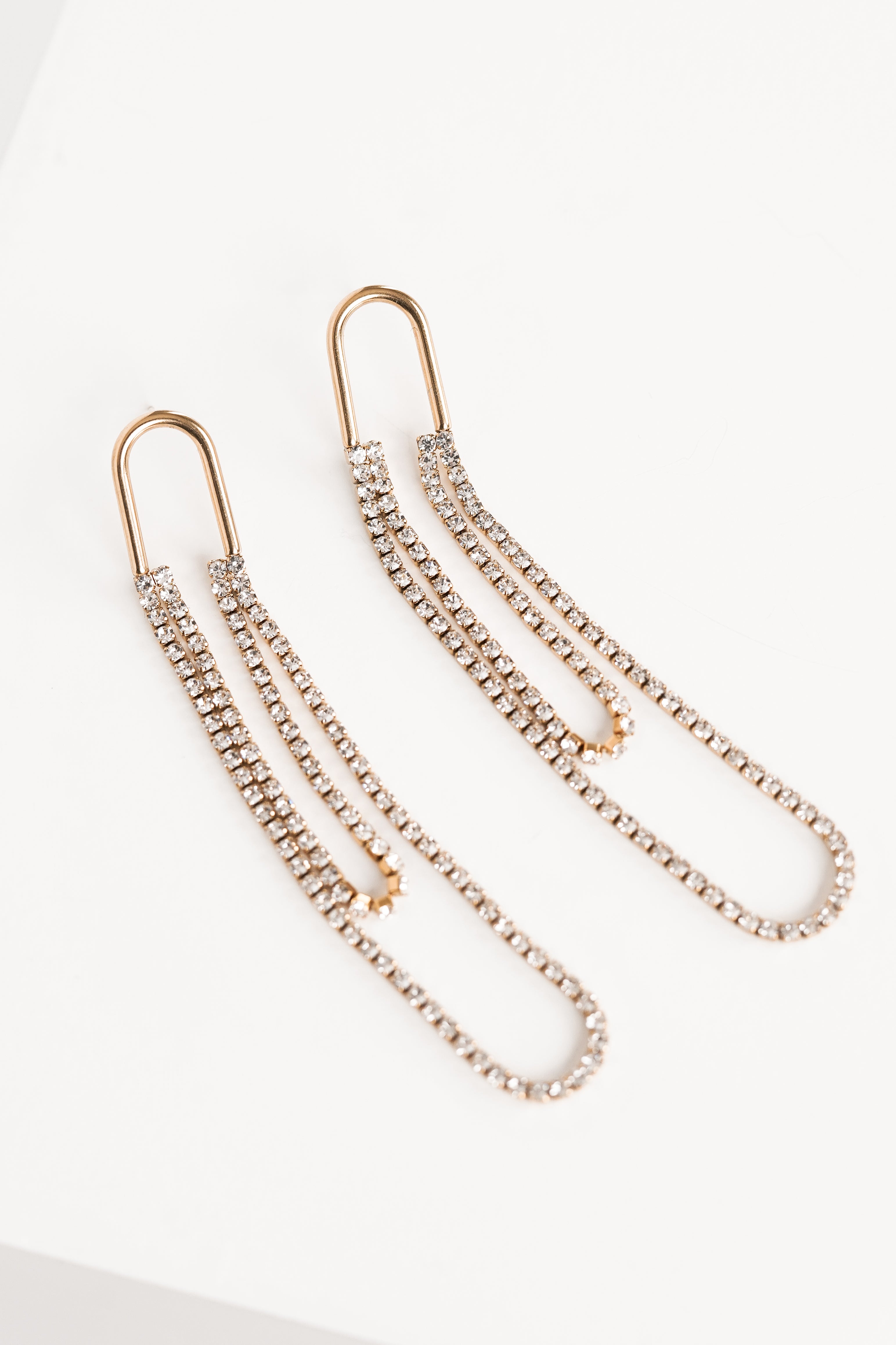 De Kate oorbellen hebben een afgerond model aan de bovenzijde met dubbele strass hangers.