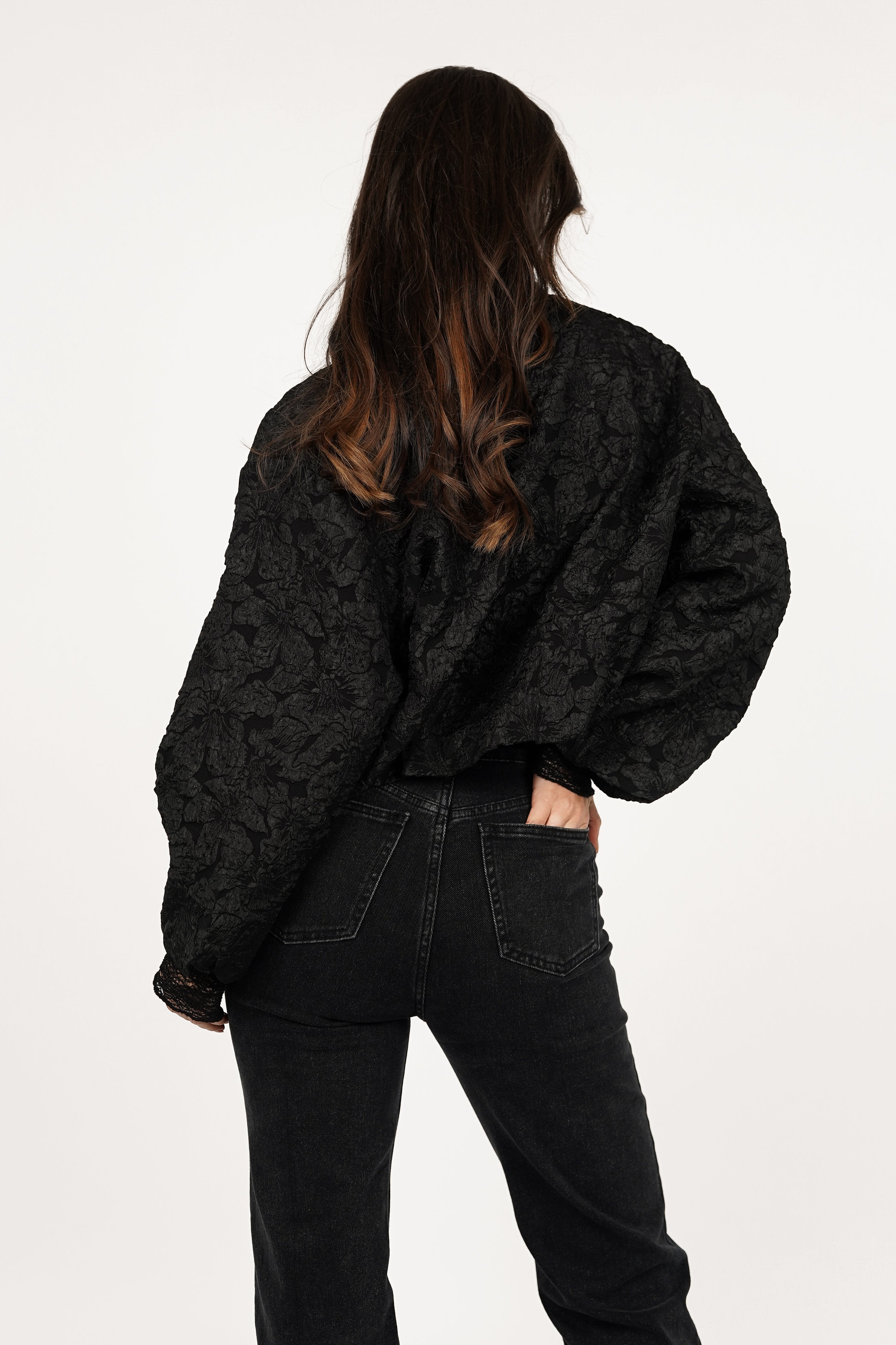 De Livy oversized bomber jas heeft een glimmende bloemenprint en mooie peplum mouwen. Het jasje heeft aan de onderzijde een elastische band en wordt gesloten doormiddel van een zilveren rits.