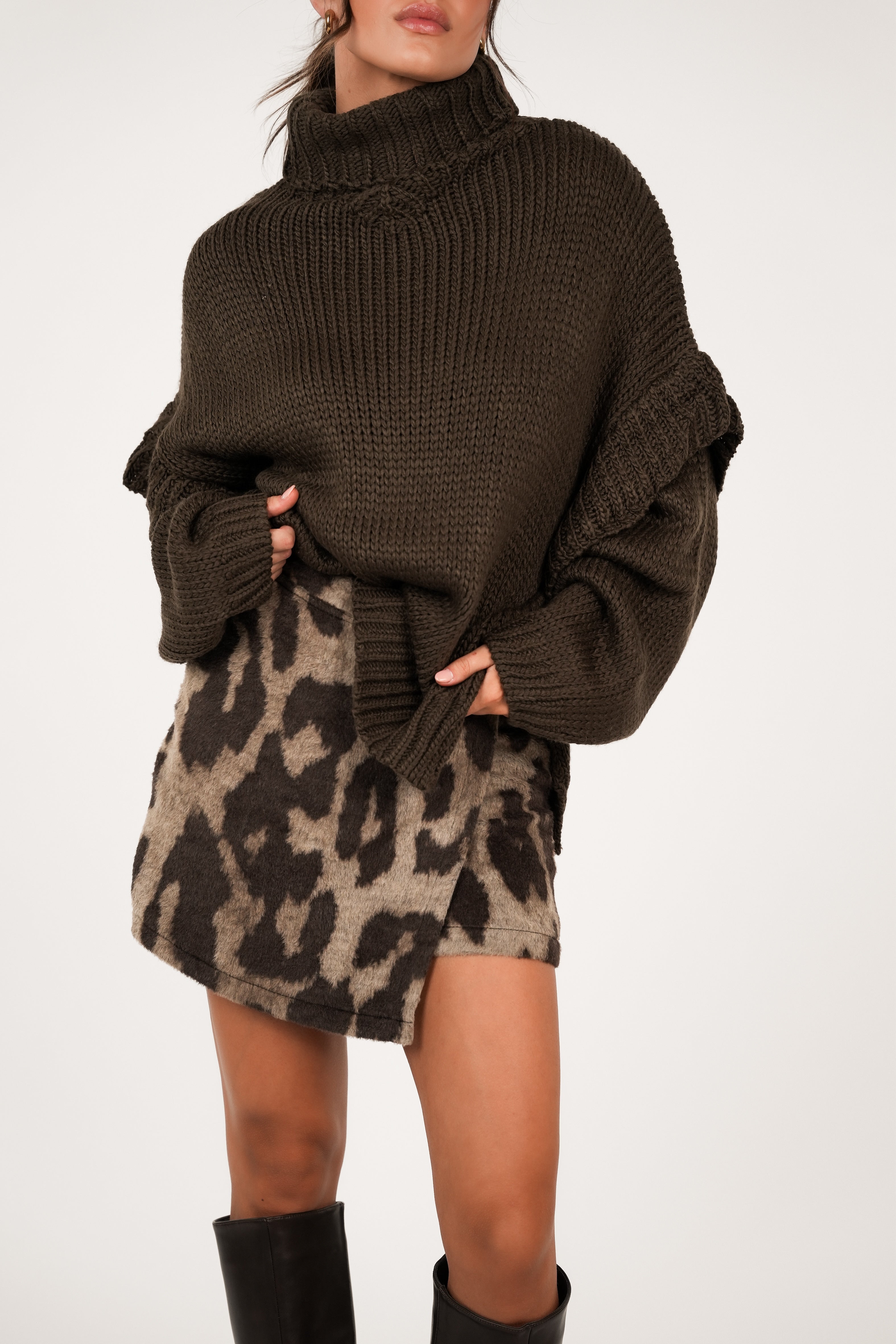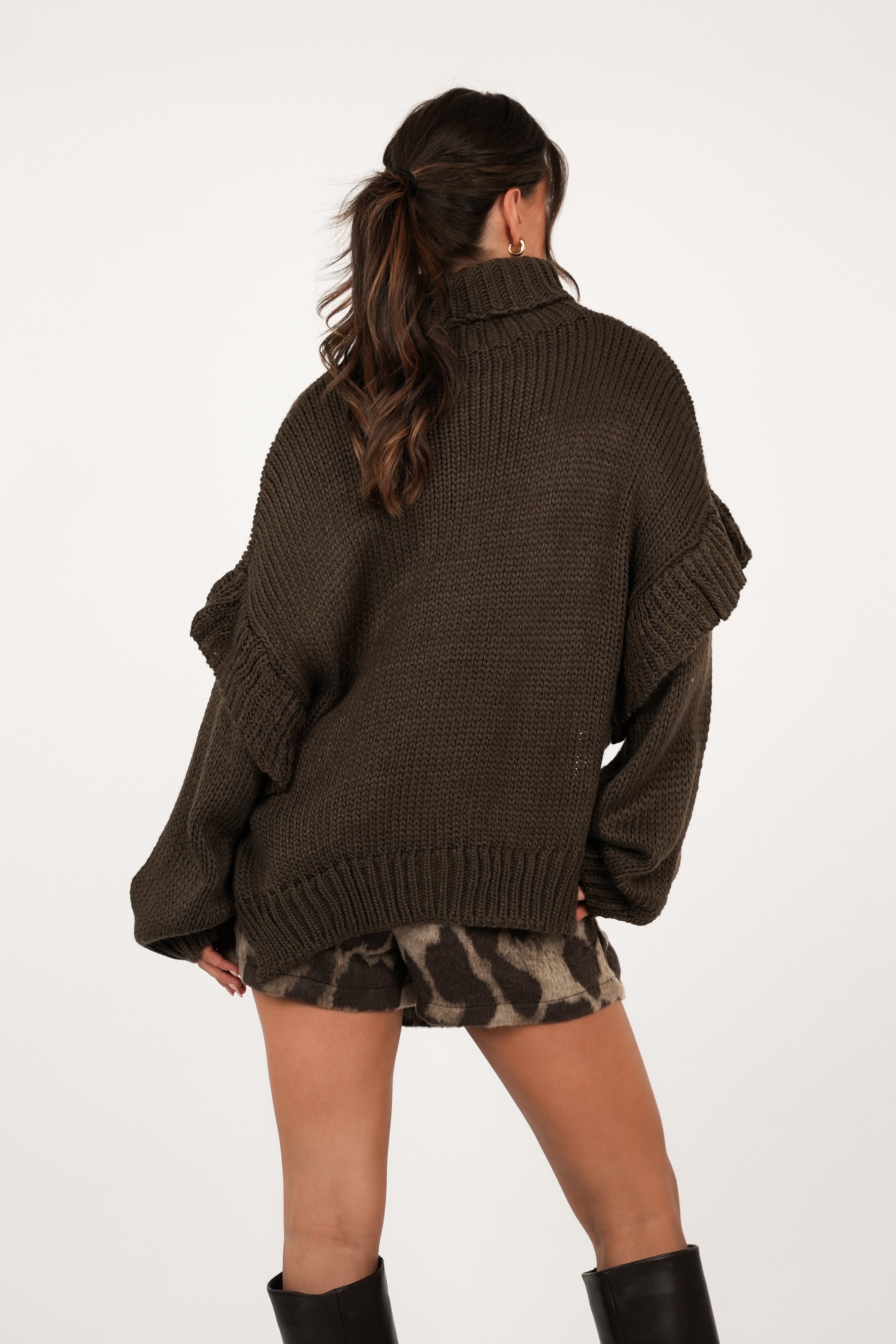 De Alexa coltrui heeft een oversized wijd model met ruffles langs de mouwen. De trui heeft een grote col en een prachtige gebreide stof.
