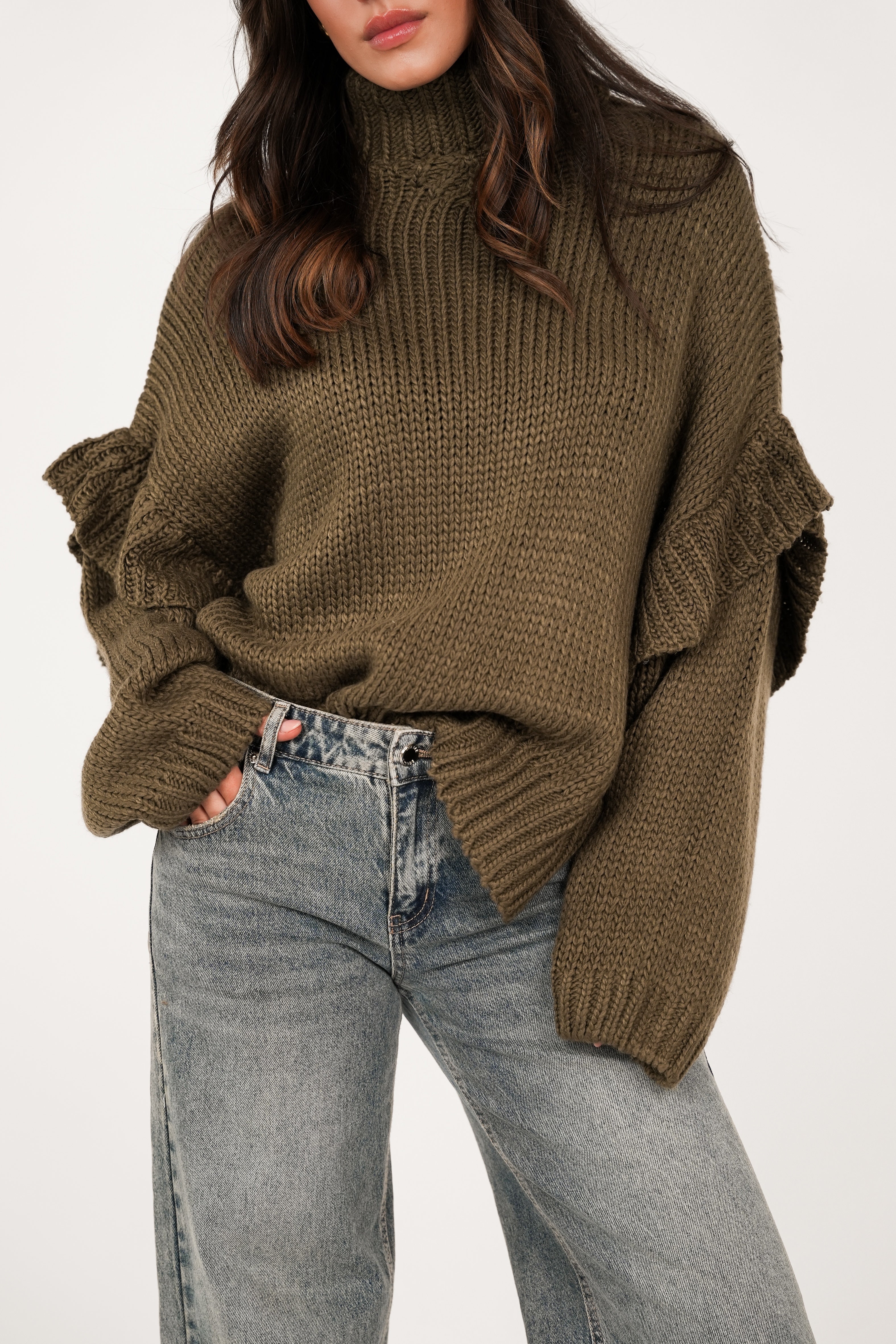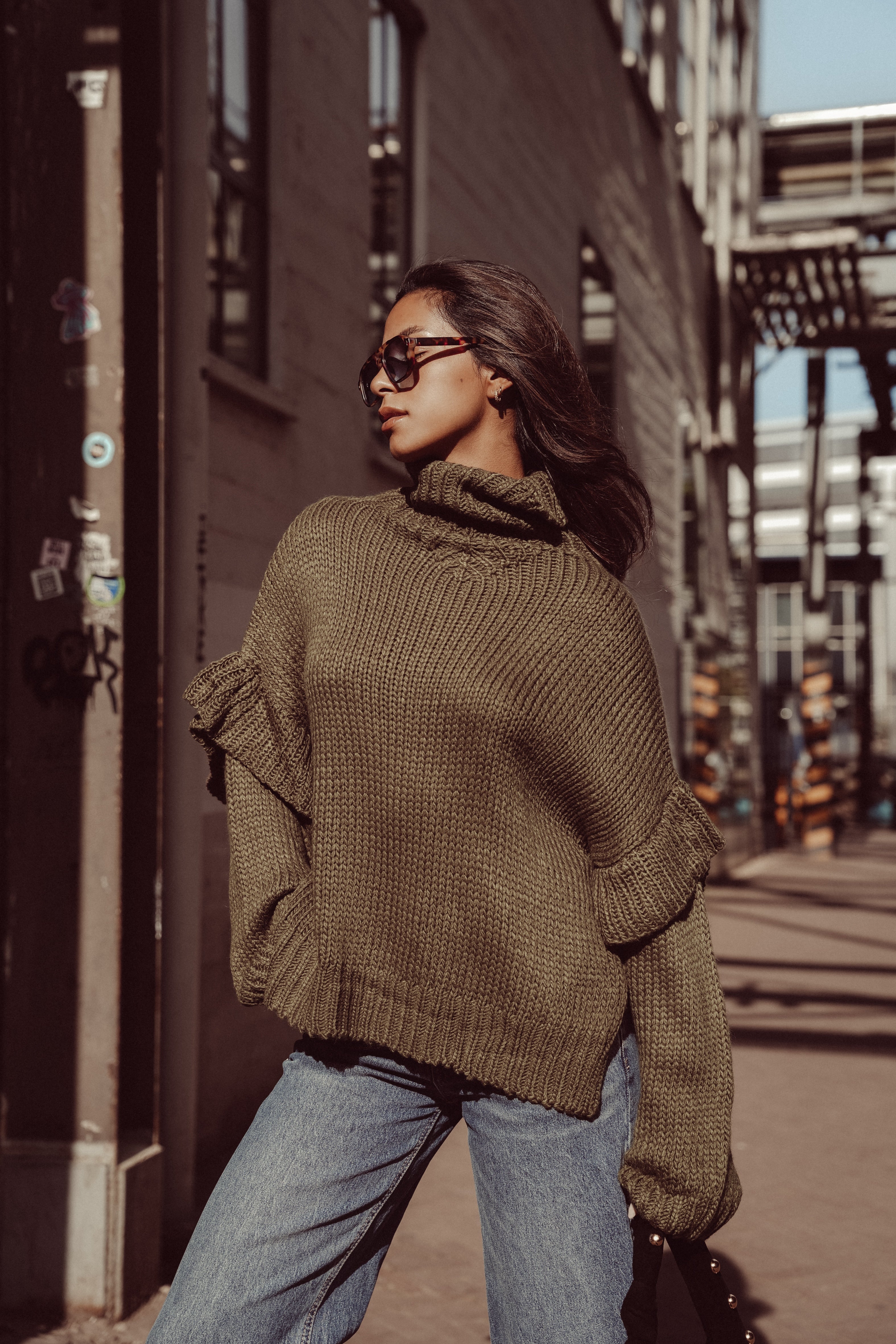 De Alexa coltrui heeft een oversized wijd model met ruffles langs de mouwen. De trui heeft een grote col en een prachtige gebreide stof.