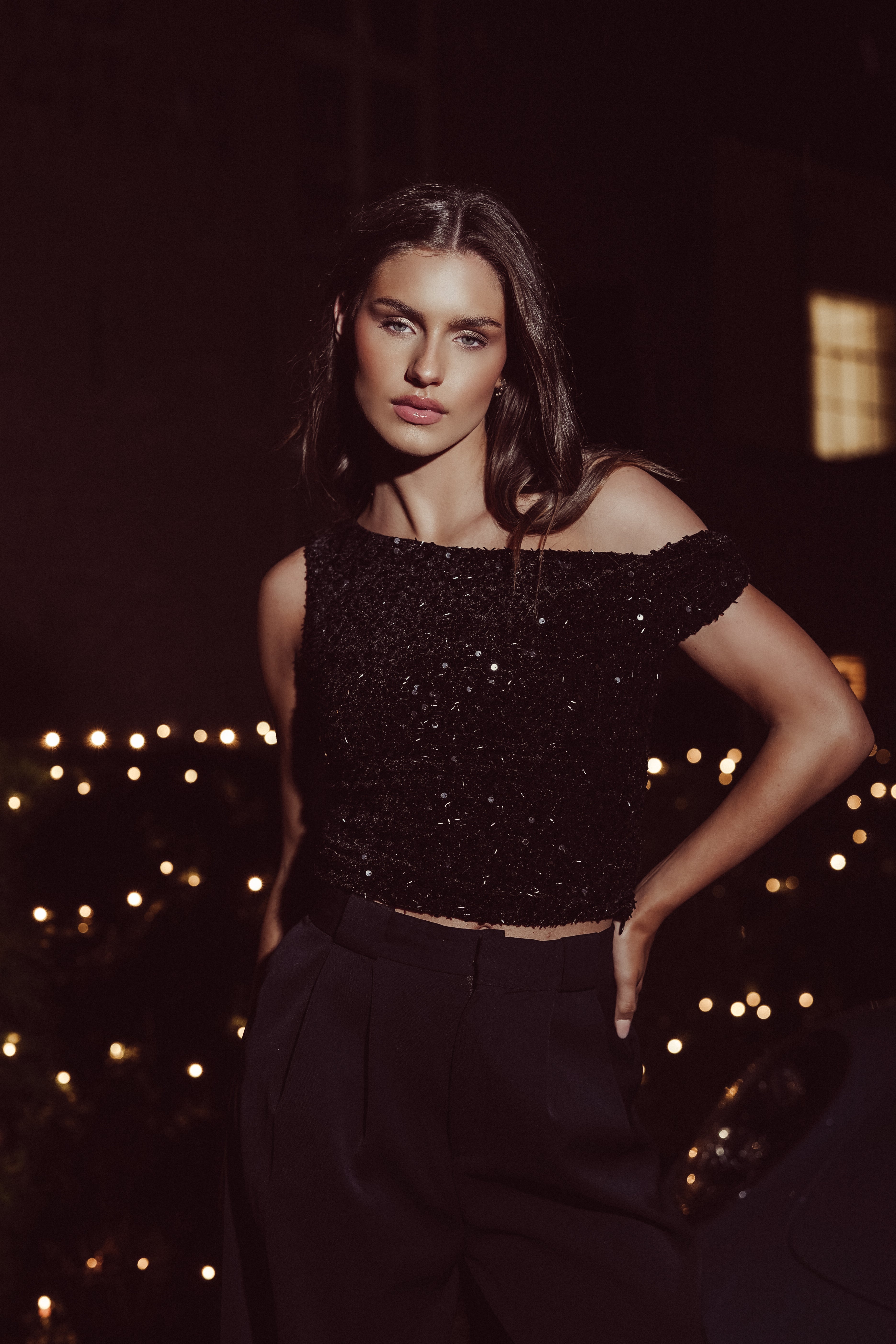 De Charly top heeft en prachtige stof met verschillende pailletten, perfect voor een feestje! De top valt aan een kant off the shoulder en is gevoerd waardoor deze niet prikt. Je kunt de top aan de zijkant sluiten doormiddel van een rits.