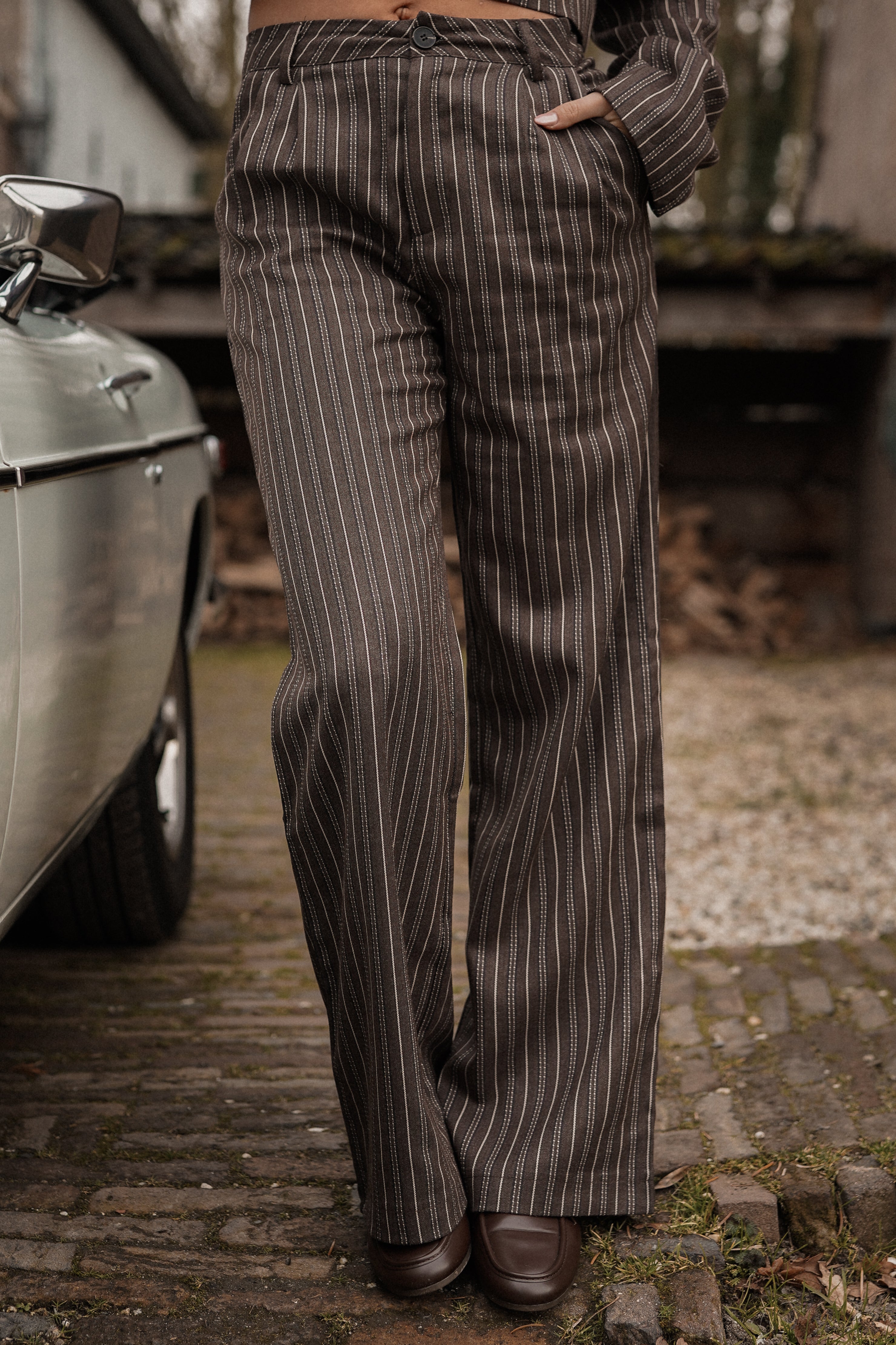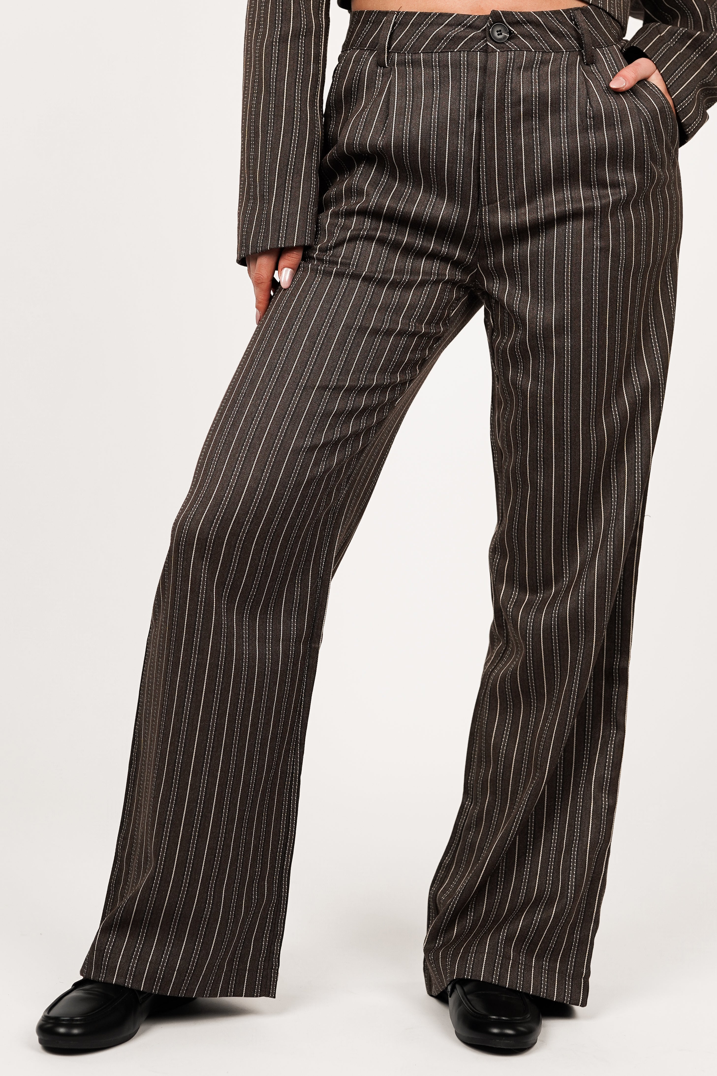 De Jula gestreepte pantalon in choco bruin is de perfecte combinatie van elegantie en comfort! De pantalon wordt gesloten doormiddel van een knoop- en ritssluiting. Aan de voorzijde heb je steekzakken en aan de achterzijde zijn het sierzakken. Ideaal voor zowel een zakelijke look als een casual chique look! Combineer deze bruine gestreepte dames pantalon met onze bijpassende cropped Heidi blazer.