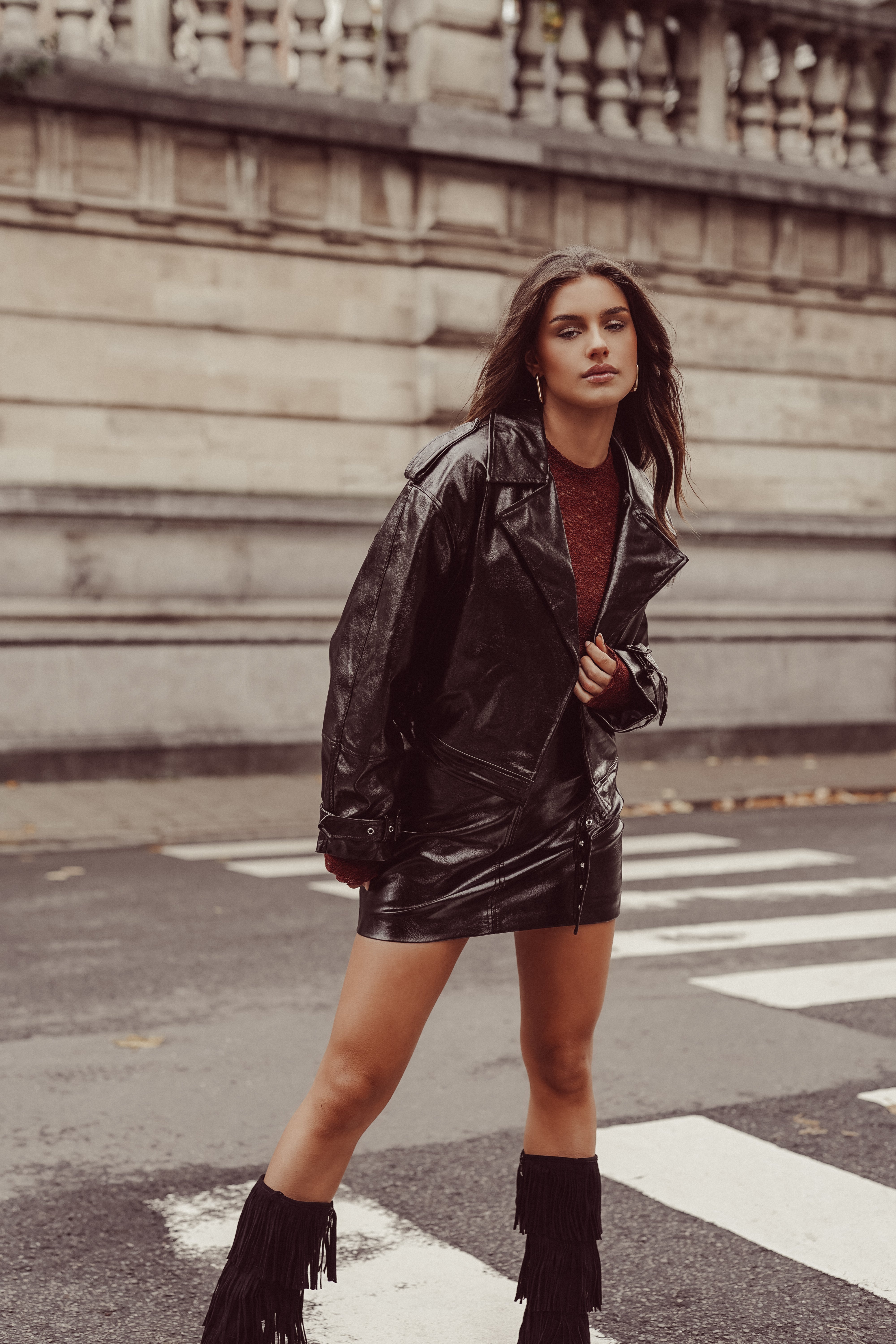 Het leren look rokje dames is een absolute essential voor je garderobe. Combineer ’m met boots voor een bold vibe of met hakken voor een classy night out look. Met dit zwarte leatherlook rokje maak je altijd een statement. Combineer met onze Laura bikerjacket.