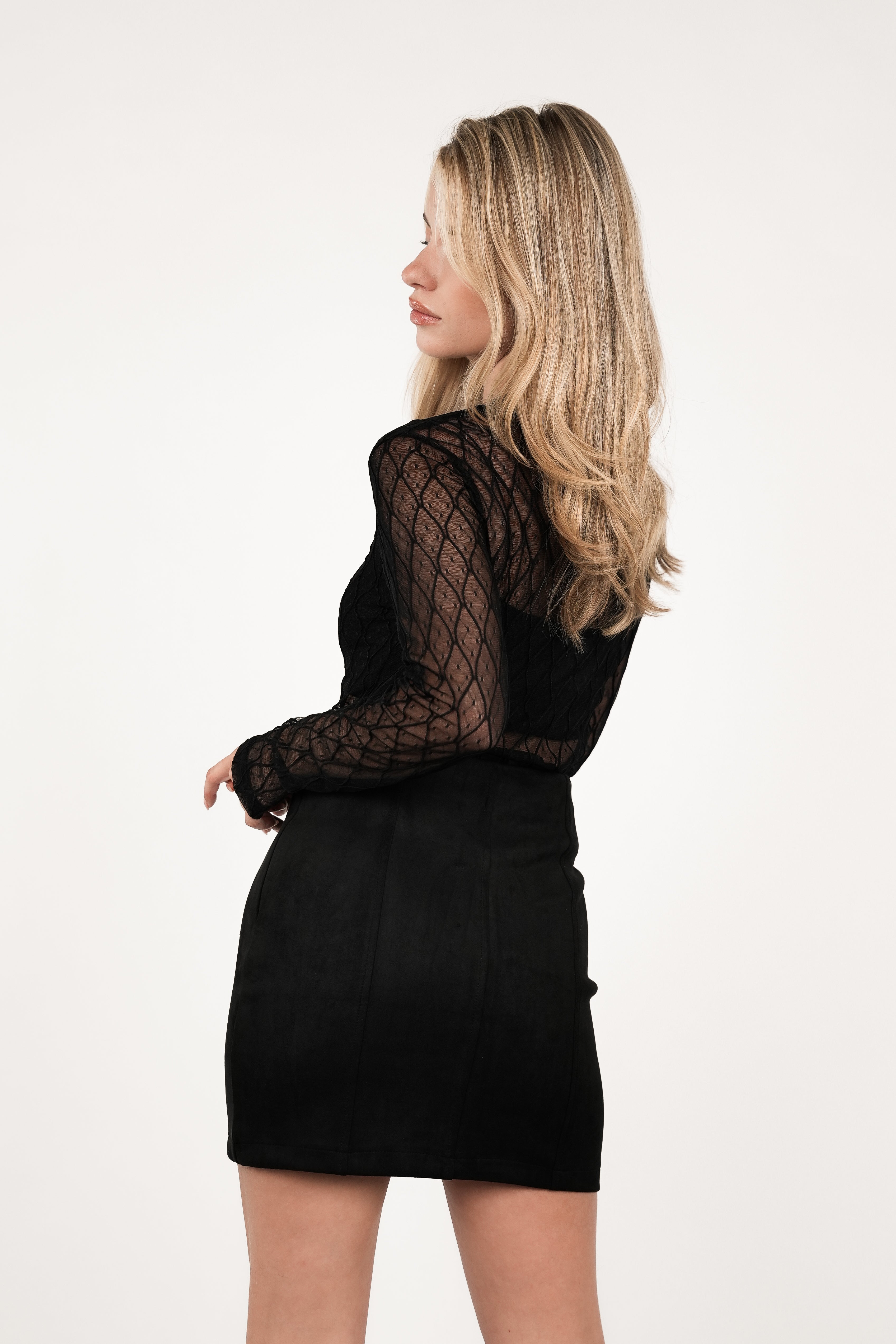 Het Elina rokje heeft een suede look met een gevlochten veter detail aan de voorzijde. Het rokje heeft een stevige stof en wordt aan de zijkant gesloten doormiddel van een onzichtbare rits.
