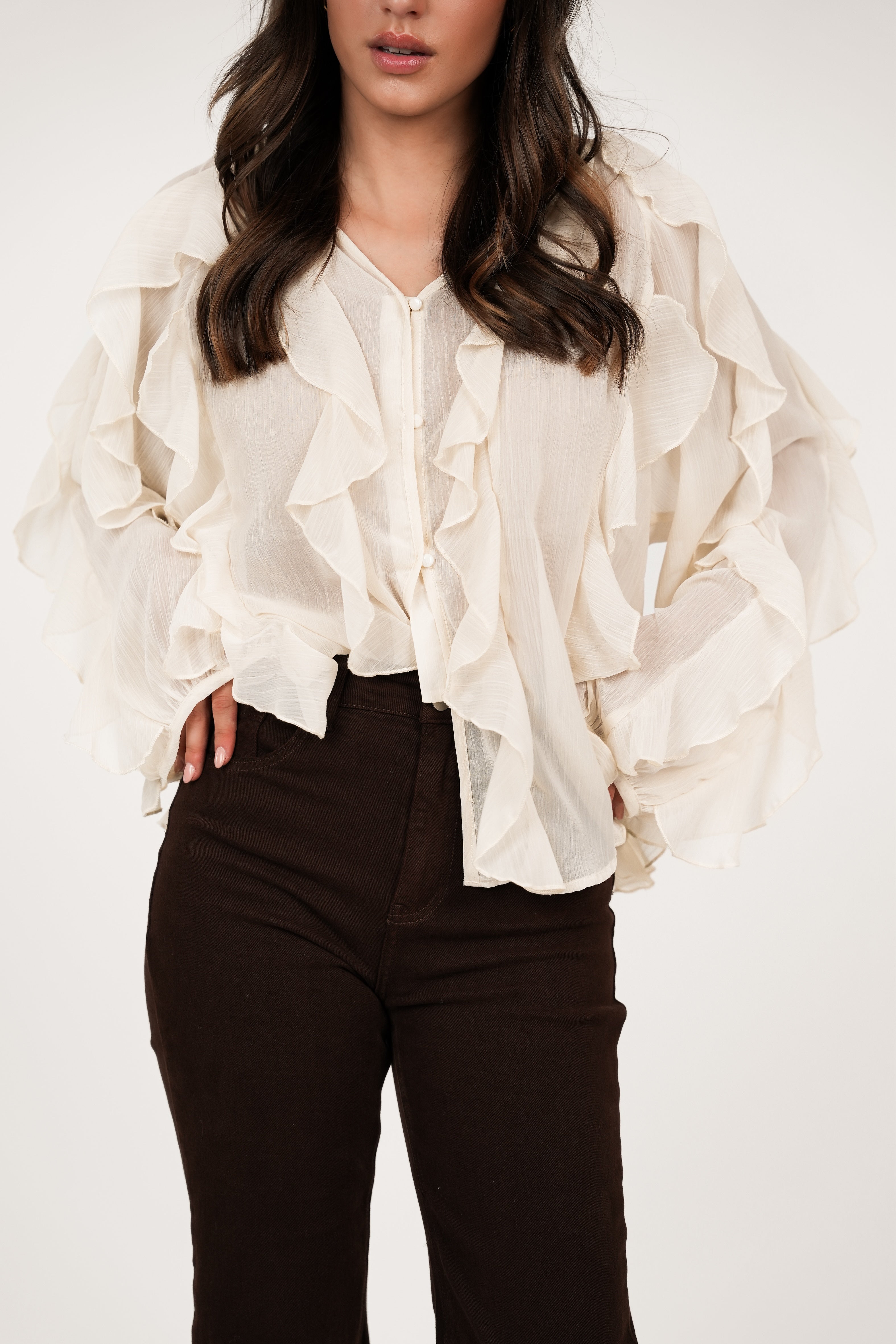 De Bibi blouse heeft prachtige ruffles langs de gehele voor- en achterzijde en langs de mouwen. De blouse heeft een see-trough stof en wordt gesloten doormiddel van knoopjes.