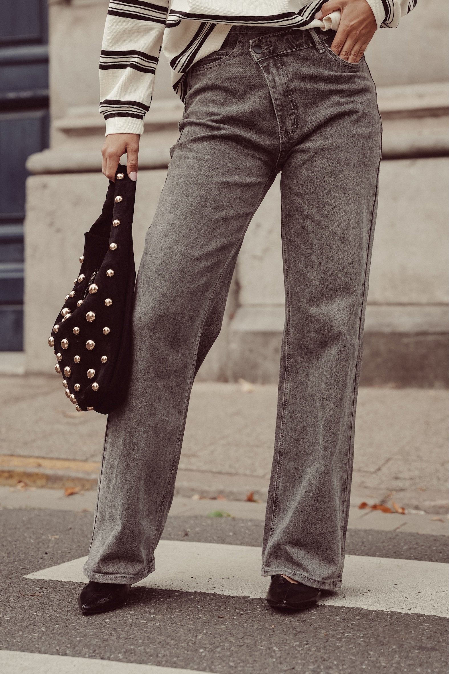 De Jevy jeans met stretch heeft een schuine knoop voor een super leuk effect! De jeans bevat stretch en heeft een straight leg model.