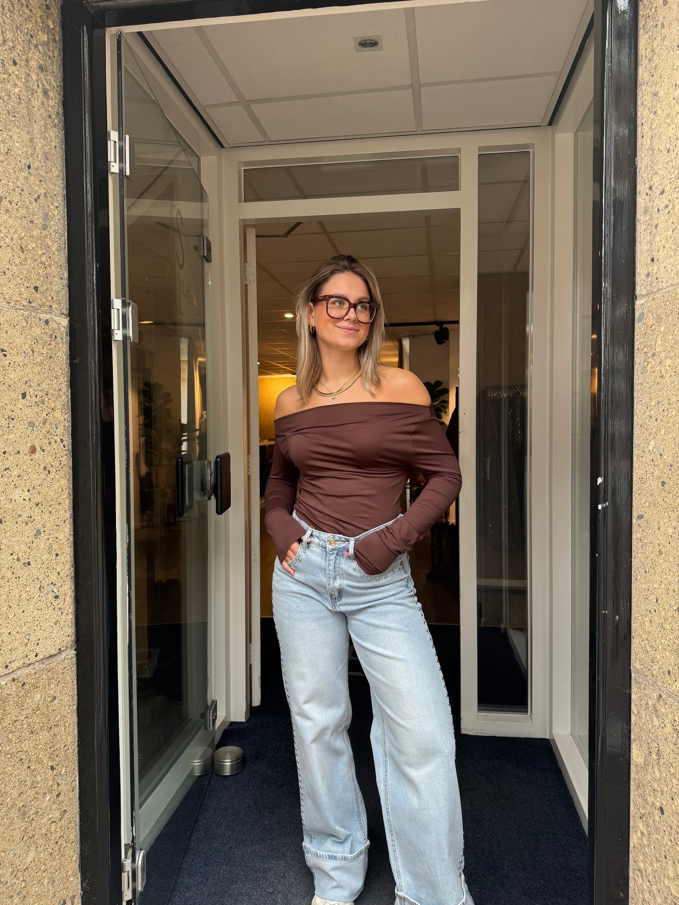 De Carry top heeft een hoge hals die breed uitloopt voor een chique effect. De top bevat stretch en is langs beide zijdes geplooid.