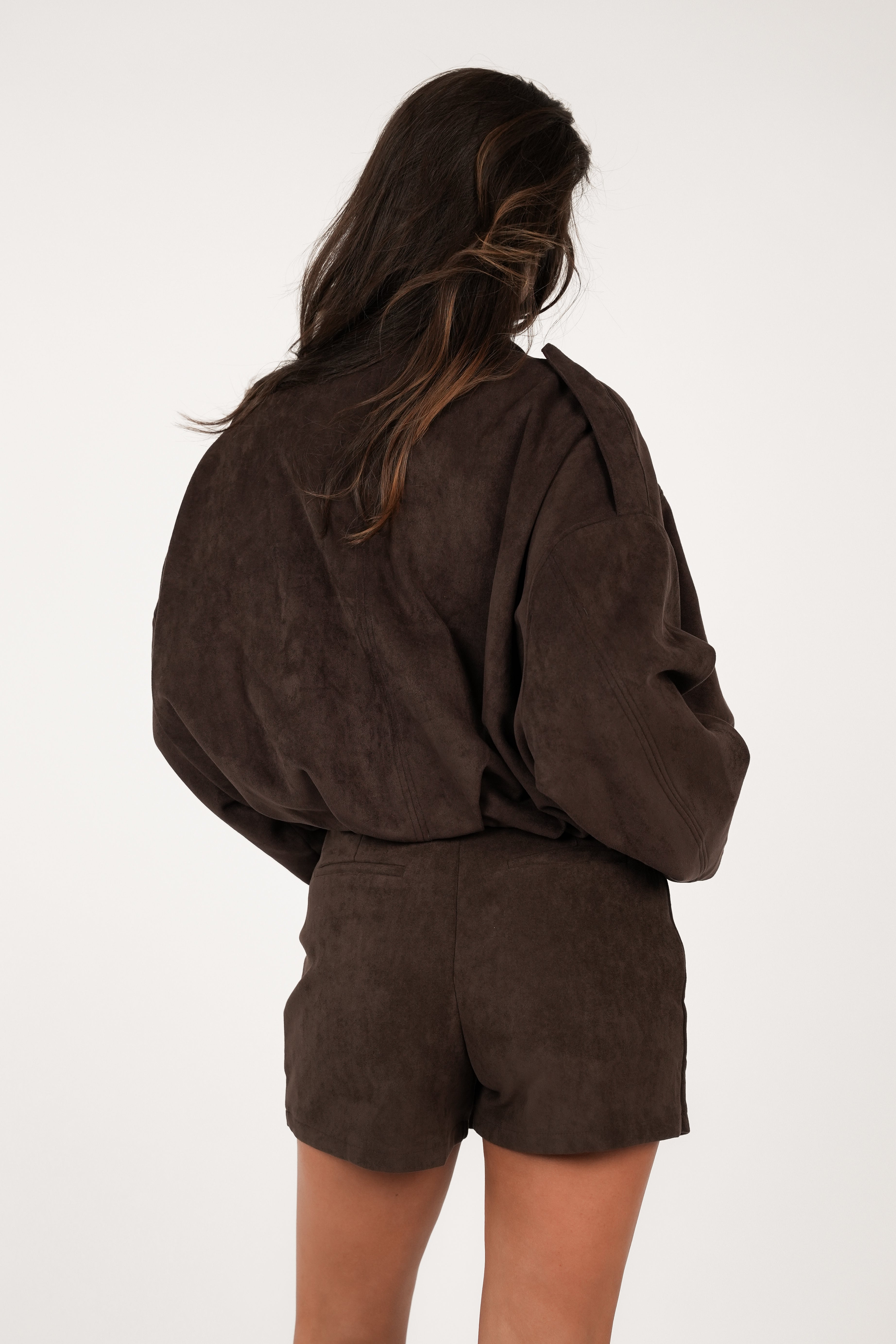 Het Jady bomberjasje heeft een prachtige suedelook stof in een oversized model. Het jasje heeft vlindermouwen en wordt gesloten doormiddel van een gouden rits.
