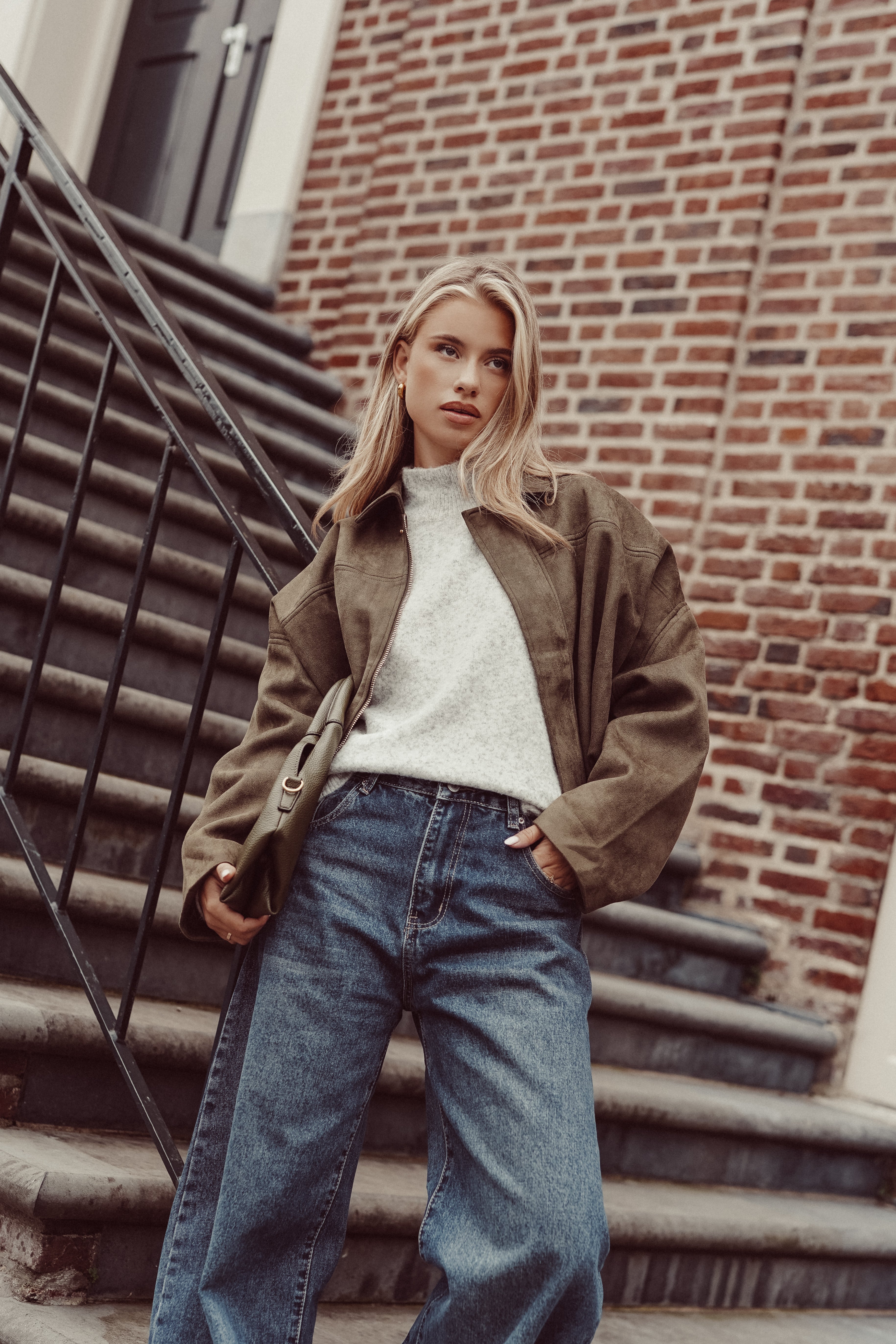 Het Gwen bomberjasje heeft een prachtige suedelook stof in een oversized model. Het jasje heeft vlindermouwen en wordt gesloten doormiddel van een gouden rits.