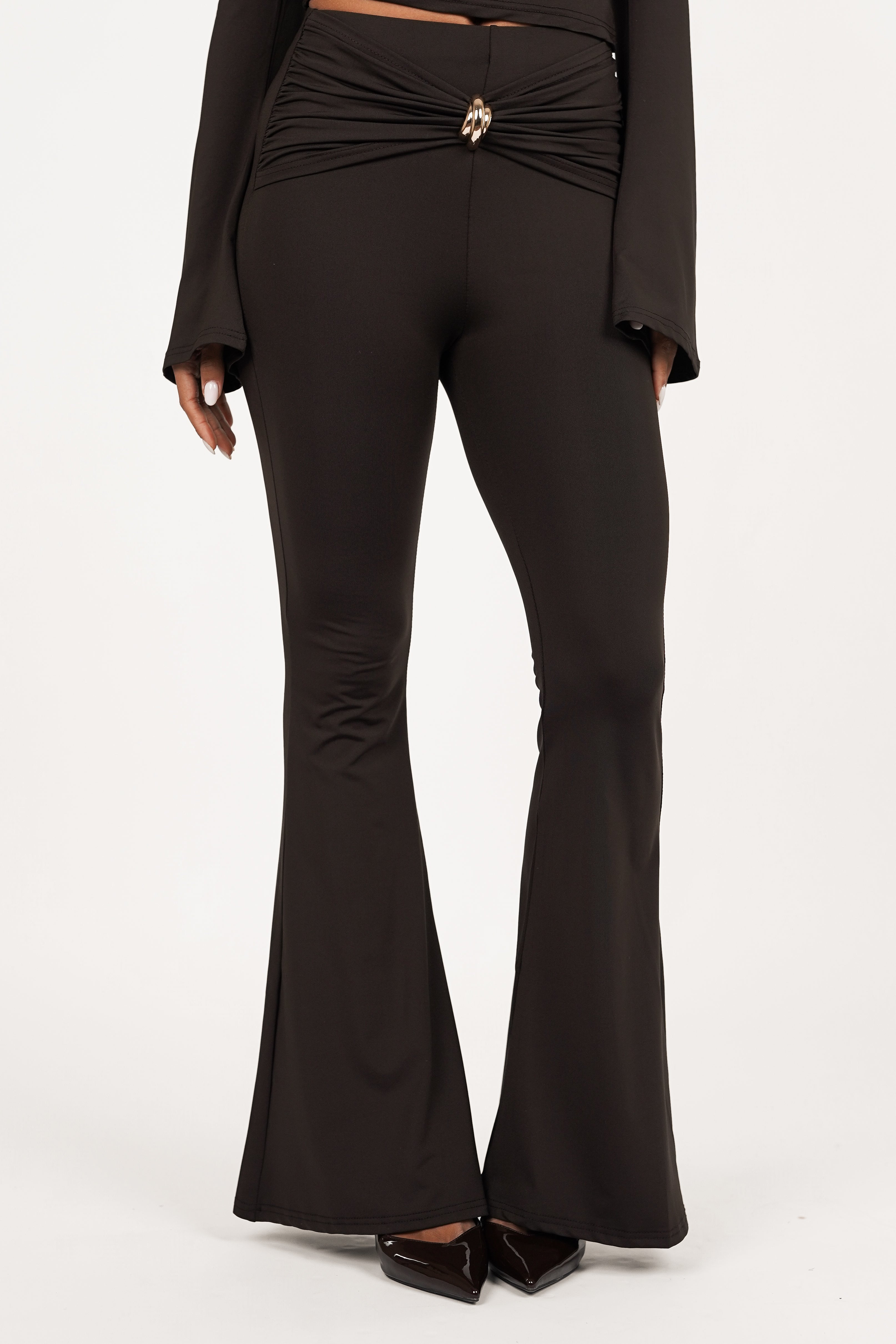 De bijpassende flared stretch broek sluit soepel aan op je lichaam en opent elegant vanaf de knie voor een flatterende, verlengende look. Het gouden detail in de taille maakt de set extra speciaal en zorgt voor een luxe uitstraling.