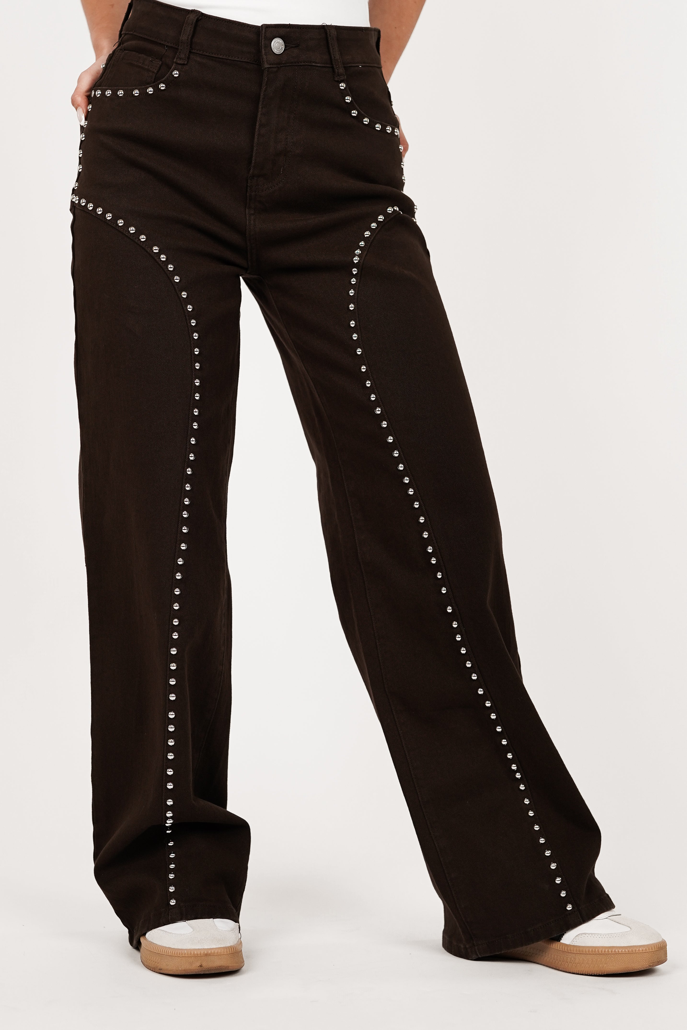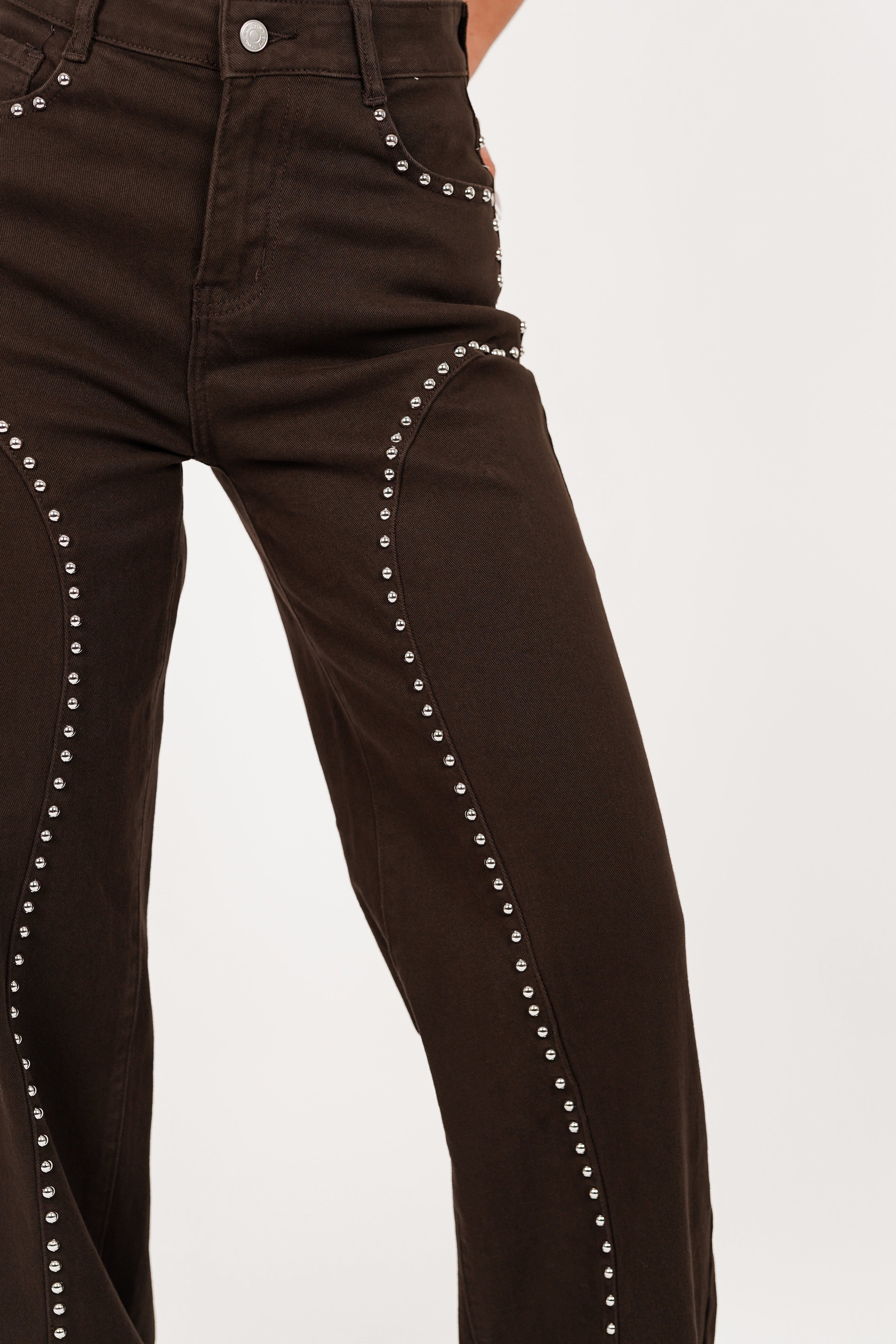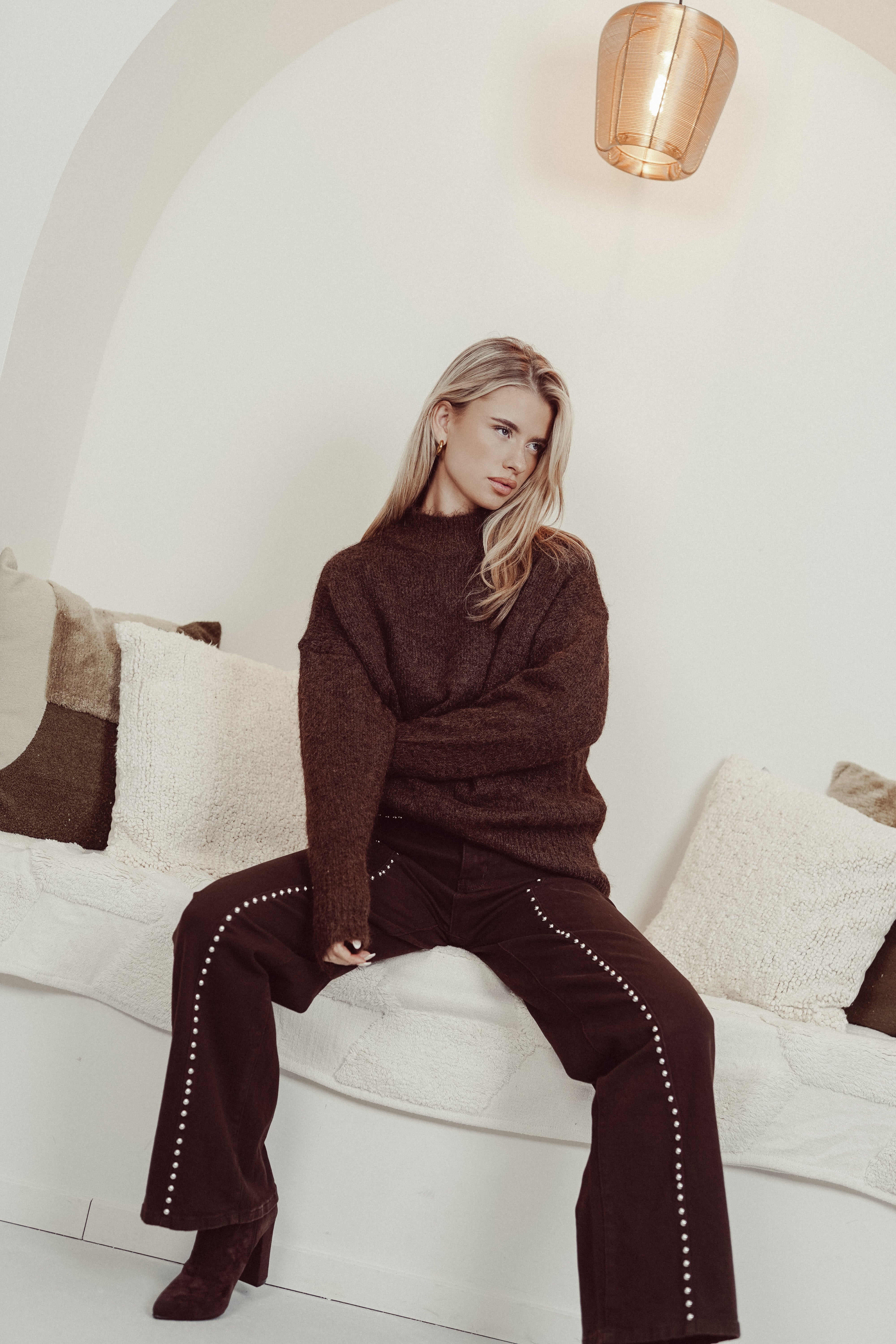 De Molly wide leg jeans met studs geeft een stijlvolle denim look met een edgy touch! De combinatie van de trendy wide leg pasvorm, de warme bruine kleur en de opvallende studs zorgt ervoor dat jij er uit springt! De broek bevat stretch.