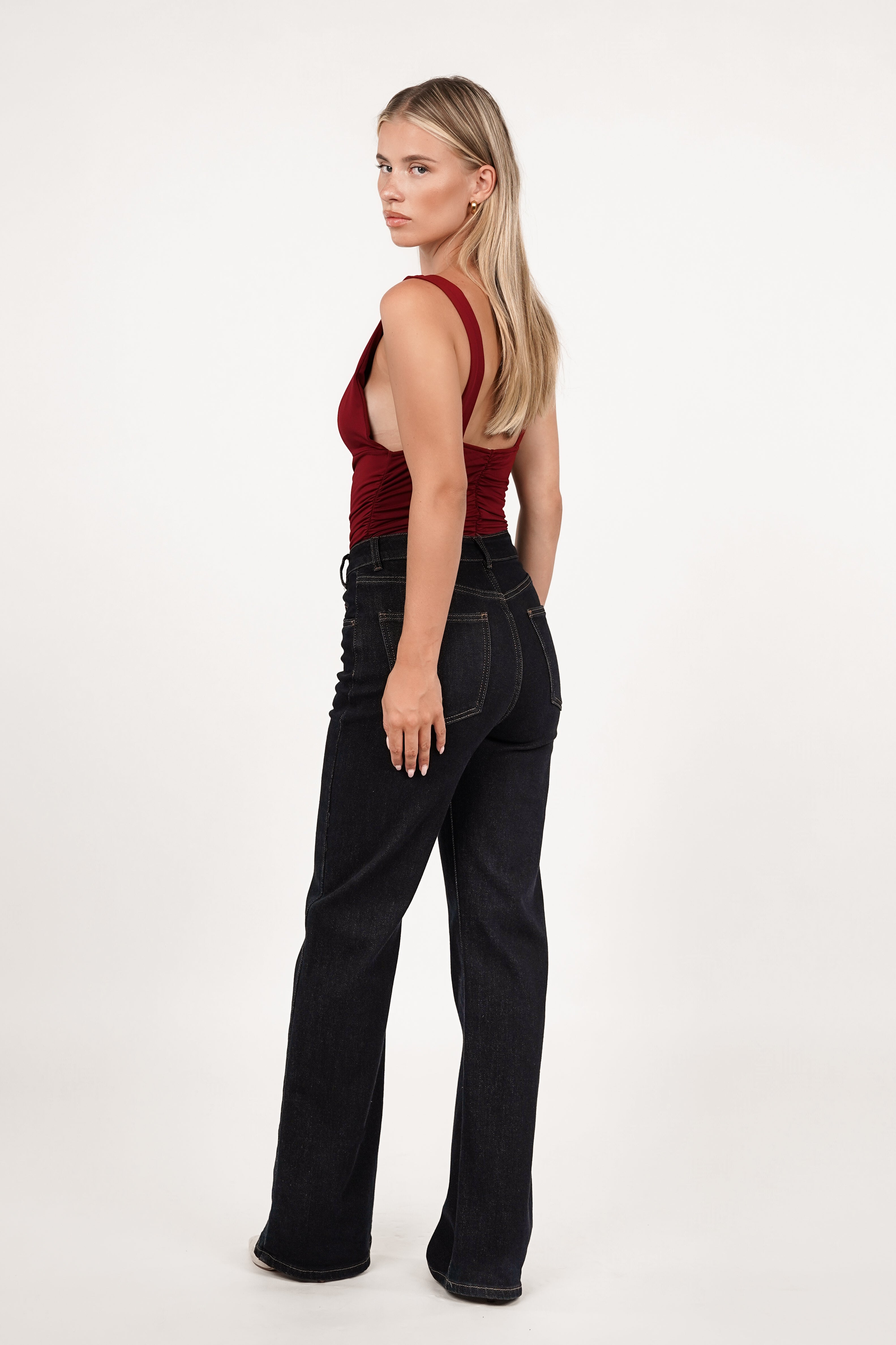 De Regan jeans heeft een schuine knoop voor een speels effect en is high waist! De stretchy jeans heeft een wide leg model en bevat steekzakken aan de voor- en achterzijde.