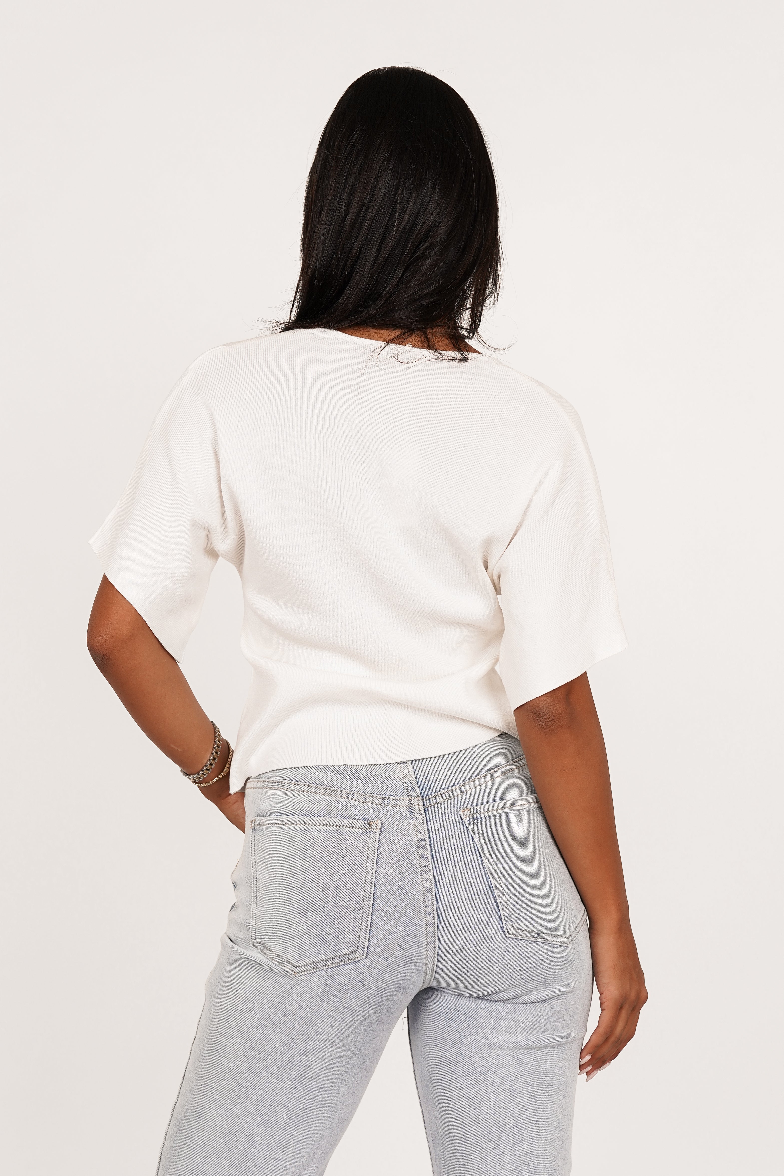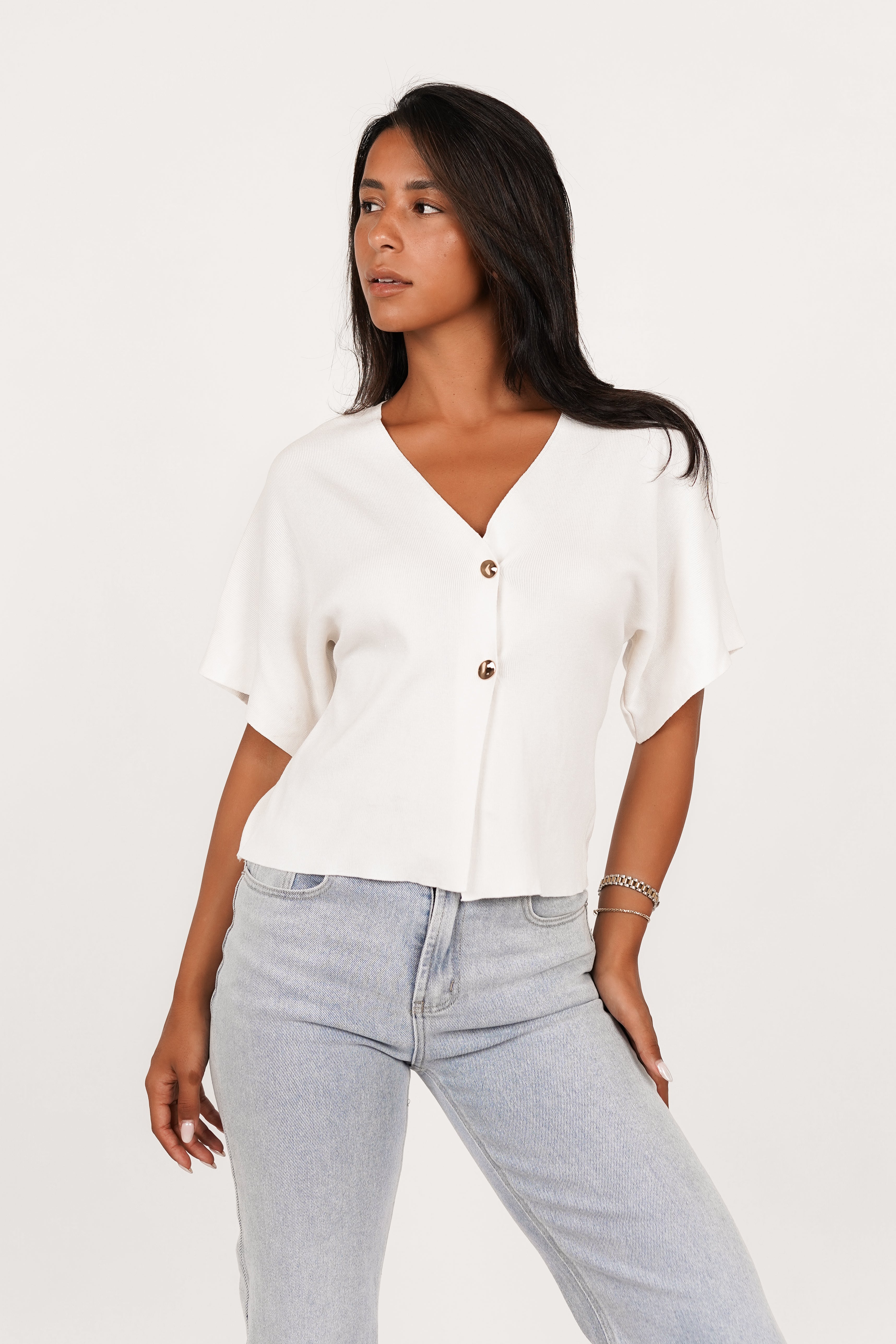 De Syfra top heeft een mooie zachte knitted stof met gouden knopen. De top heeft een v-hals en wijd uitlopende korte mouwen.